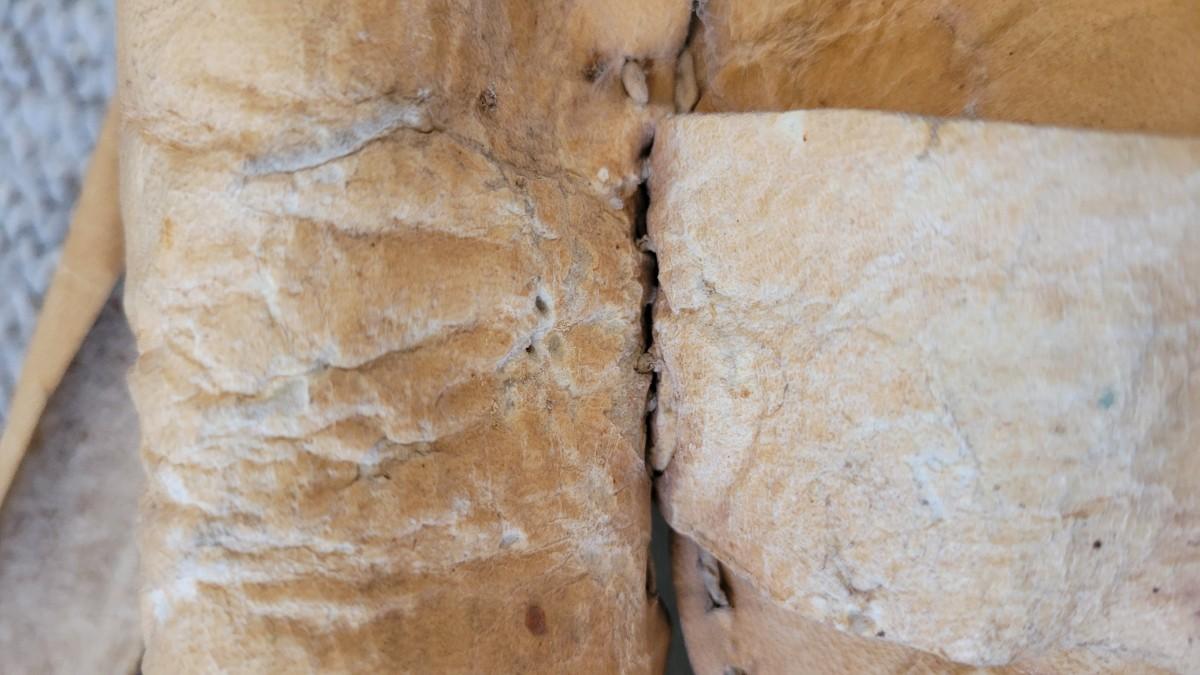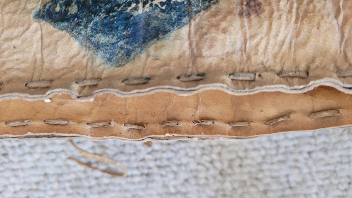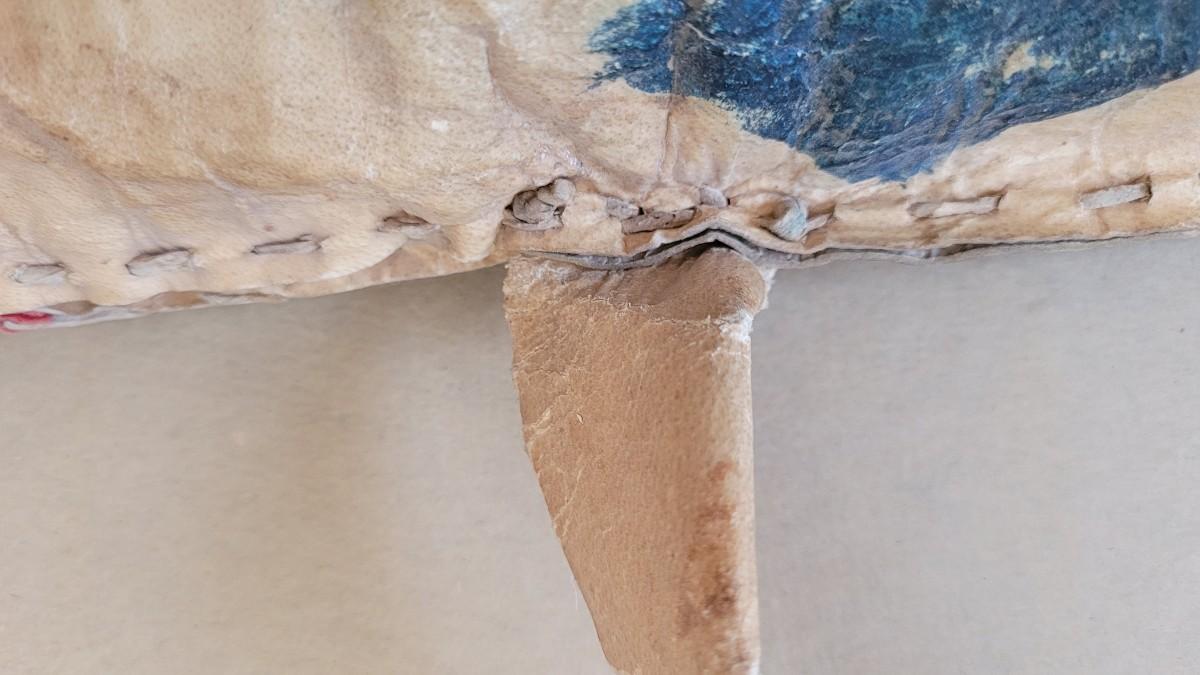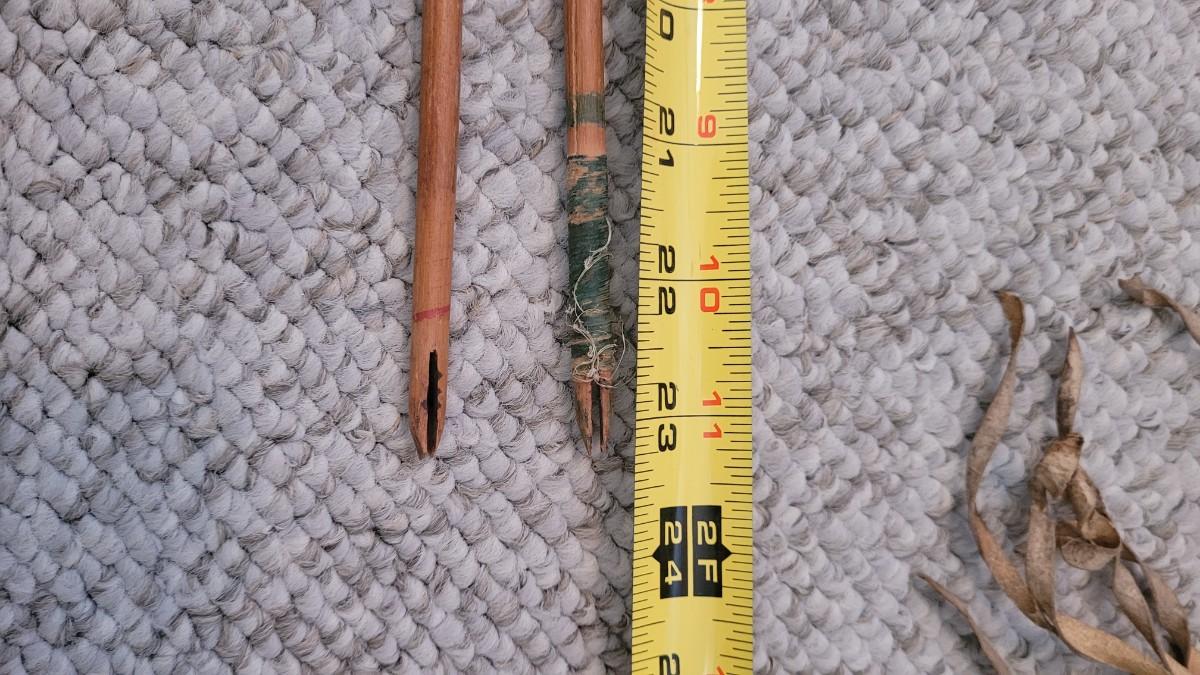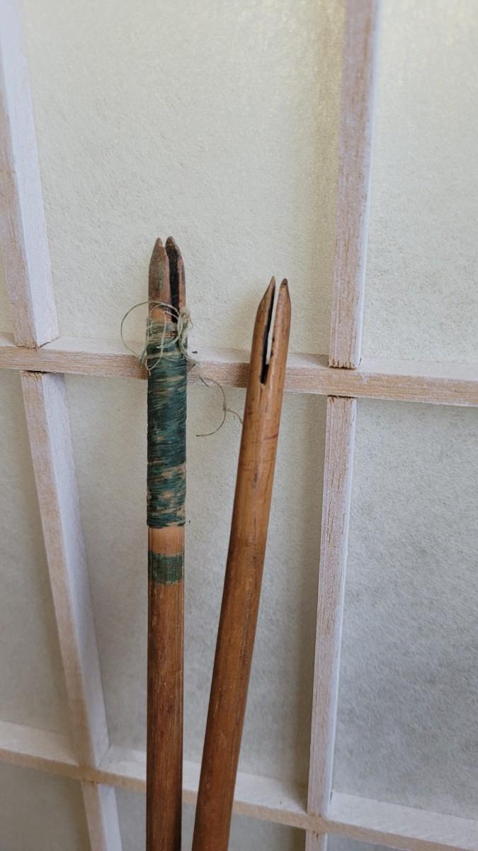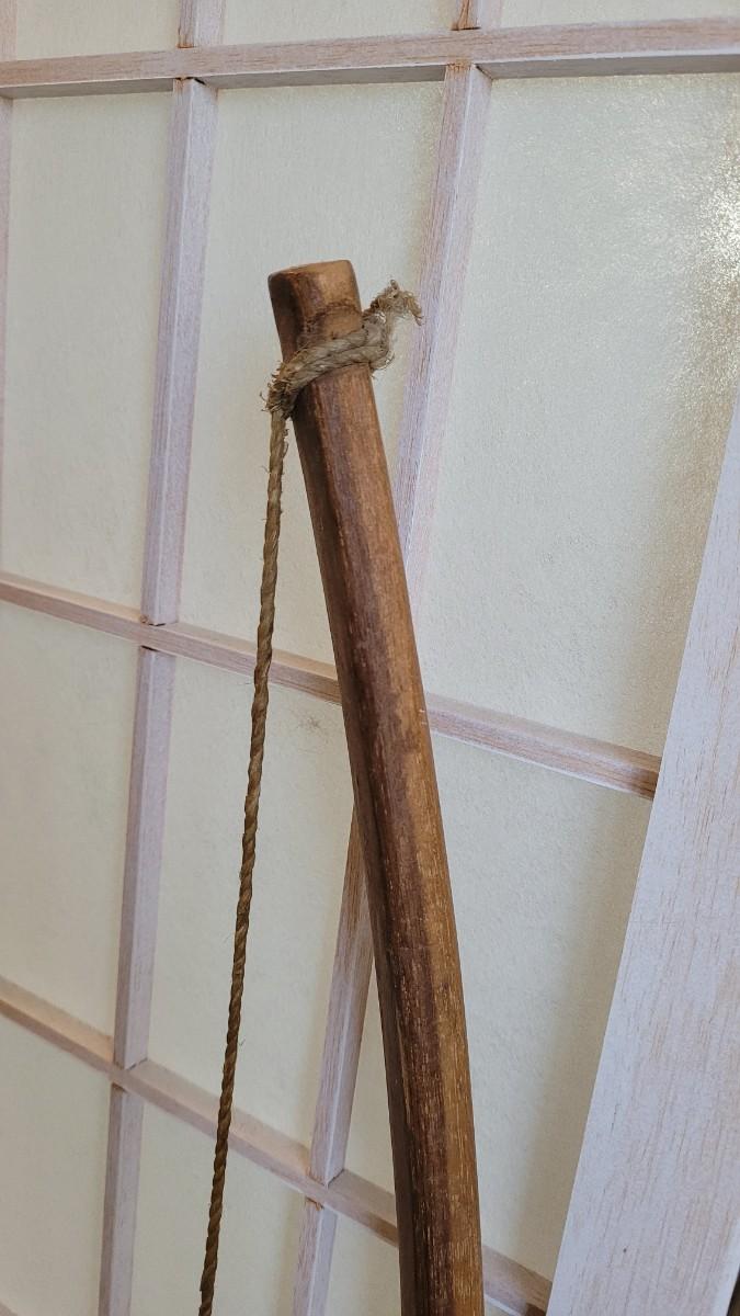 So much better in person! The Quiver and Arrows have faded blue paint decoration. The bow is absolutely stunning. It is sewn together with leather sinew. The red fabric trim is sewn on with Thread.