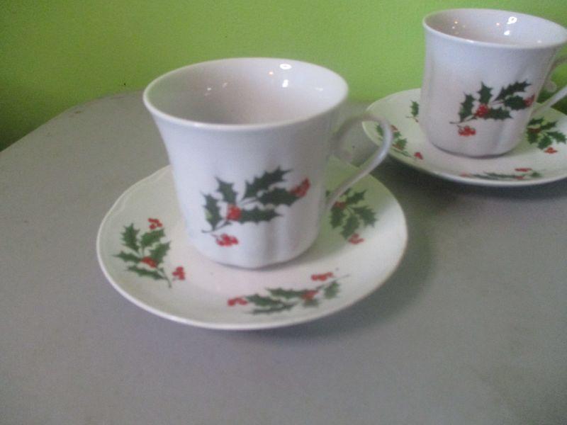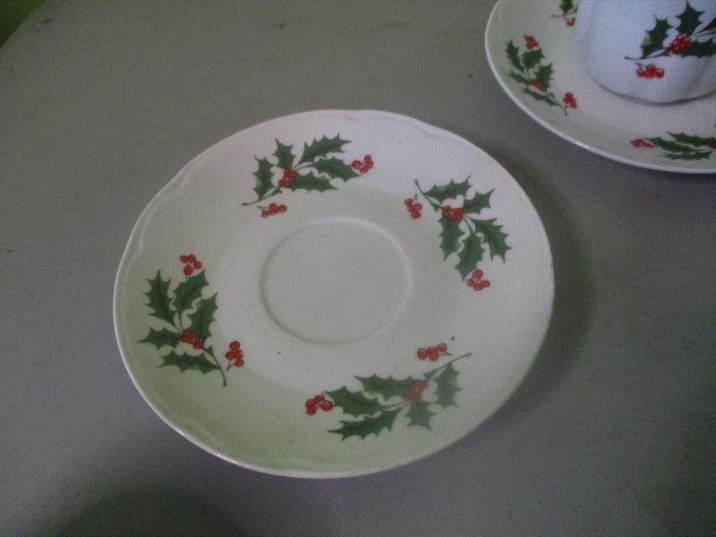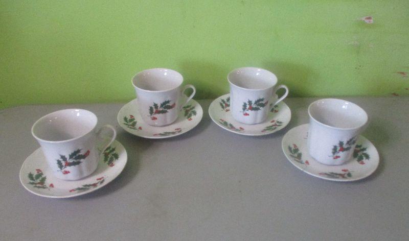 This is a set of four cups and saucers with a holly berry and leaf decoration. They are in excellent condition.