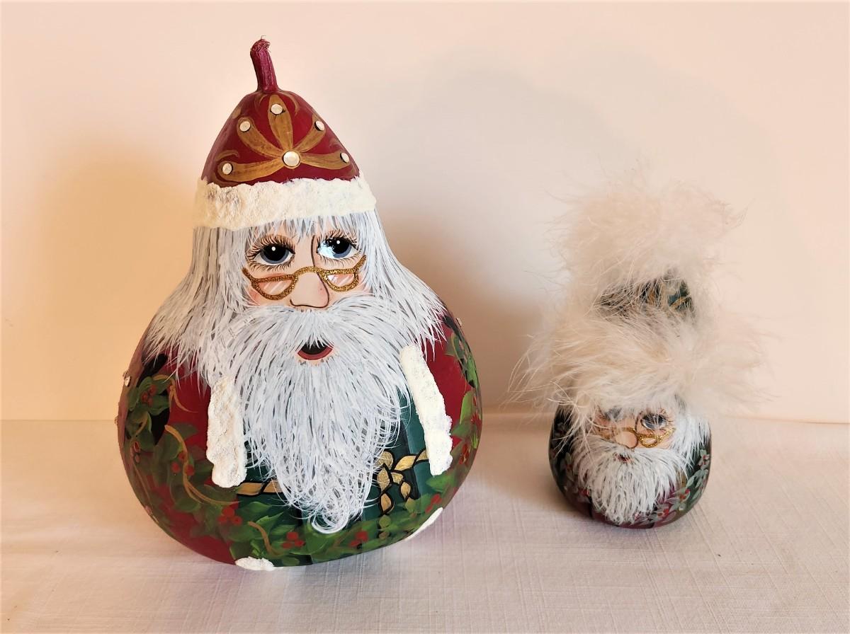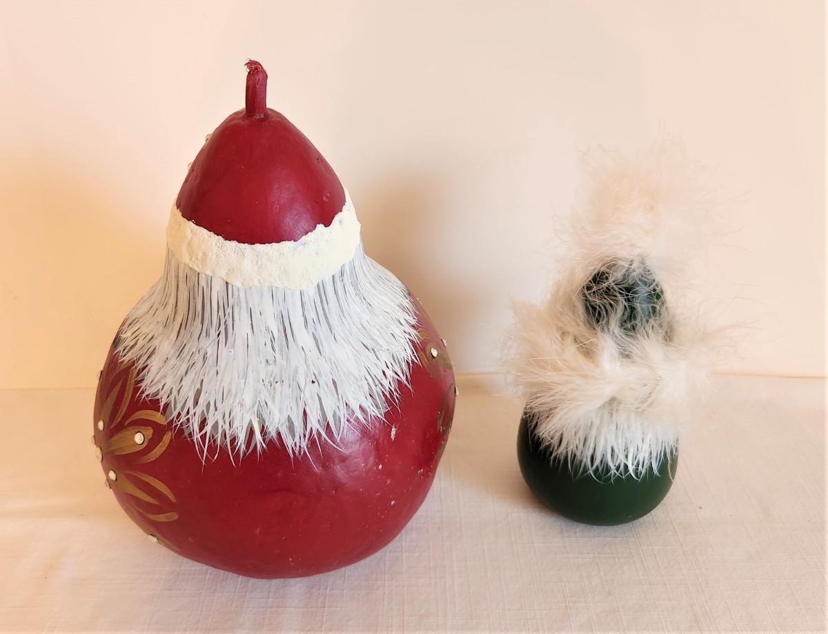 So cute - each one of a kind - hand painted Santa Gourd decorations - the larger is 9.5" tall, and smaller is 6" tall. These sell at craft shows for more than you might think.