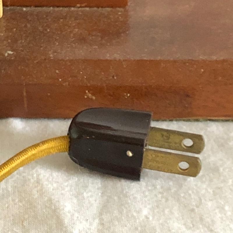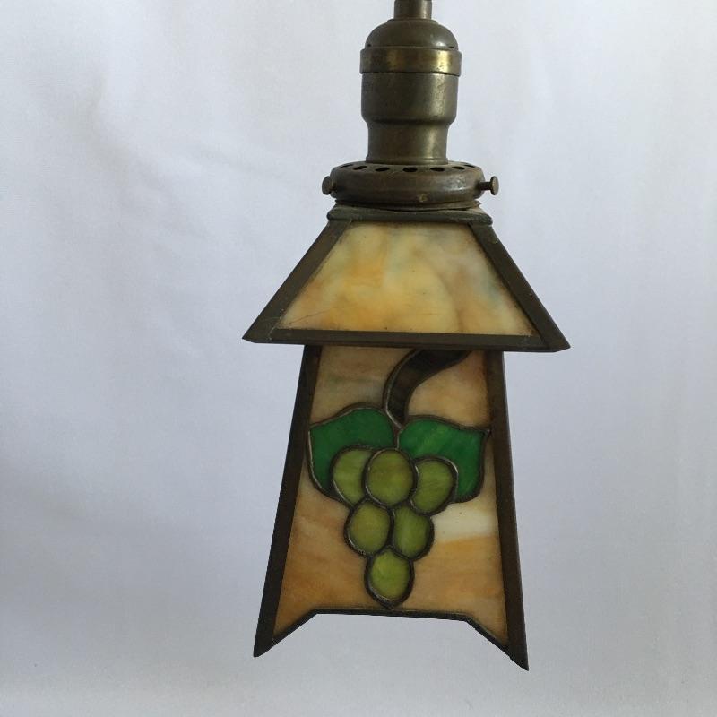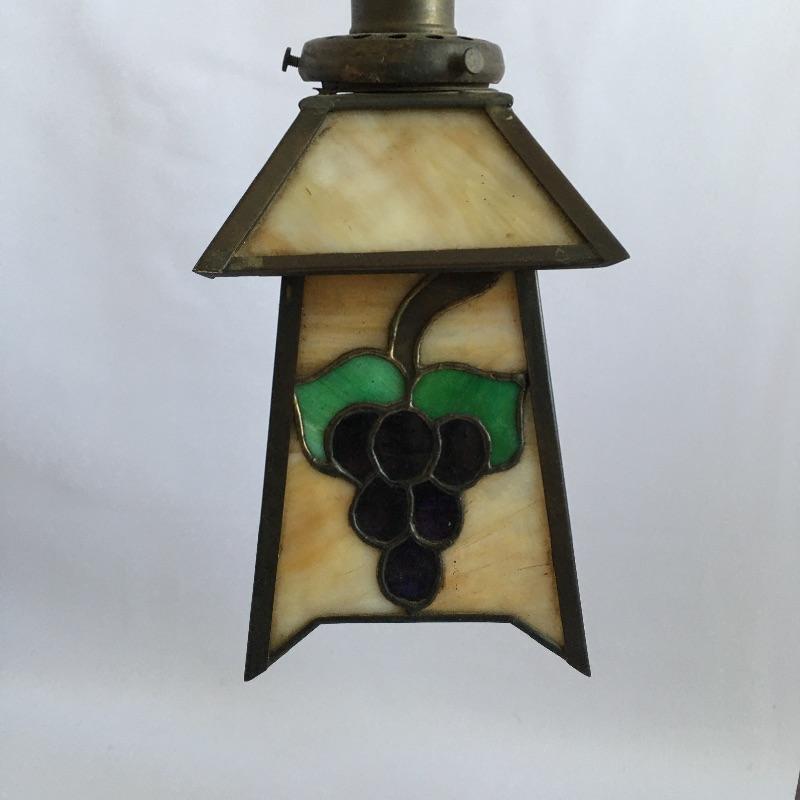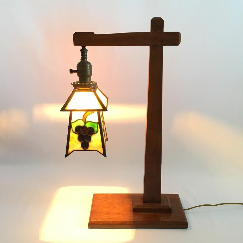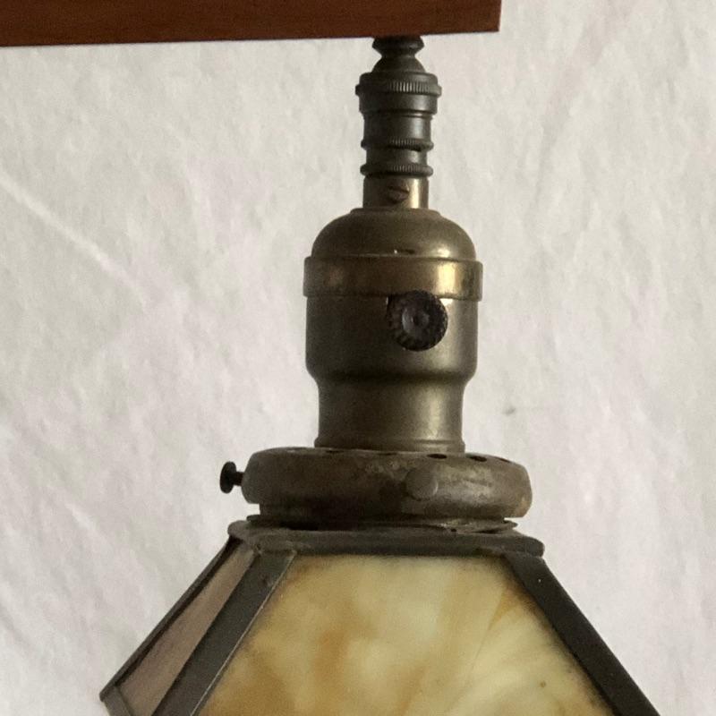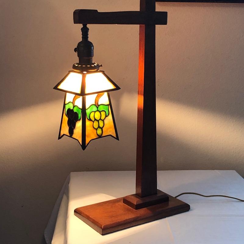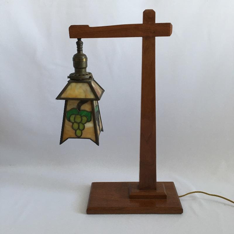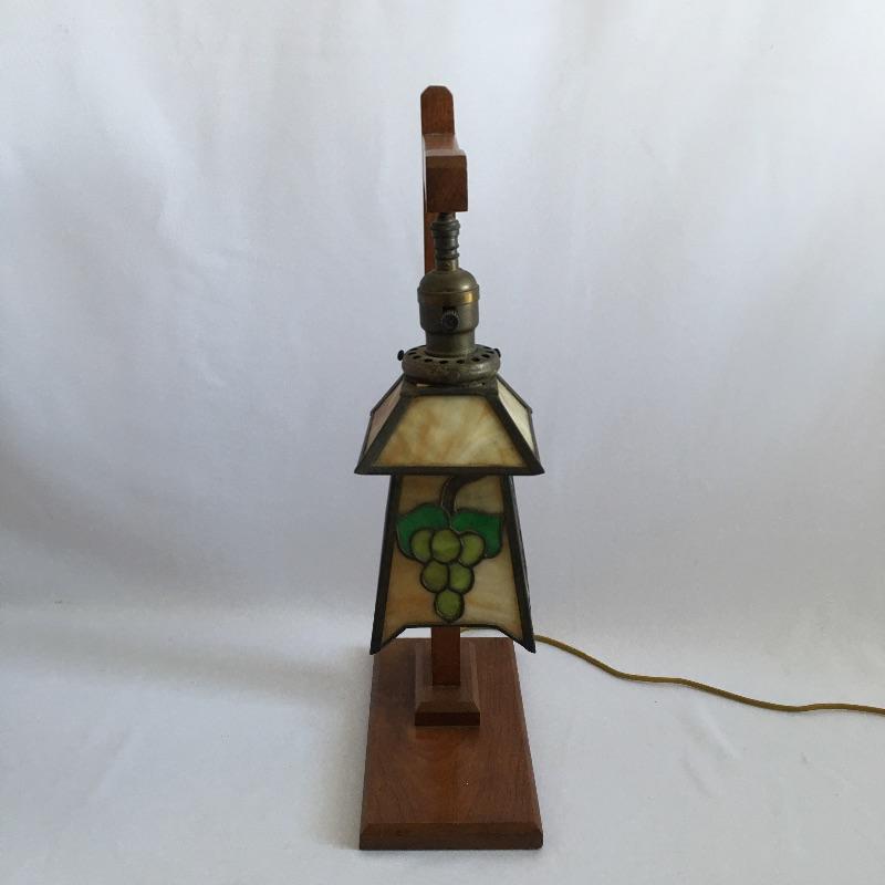 Arts & Crafts style table lamp with decorative glass and metal and wooden base. Works fine when plugged in.