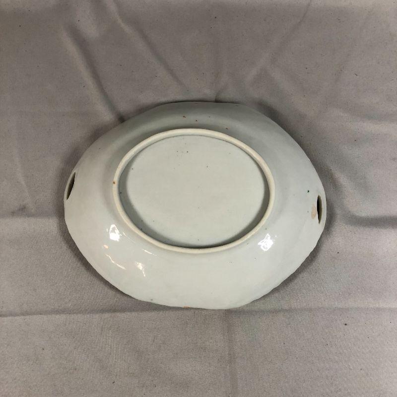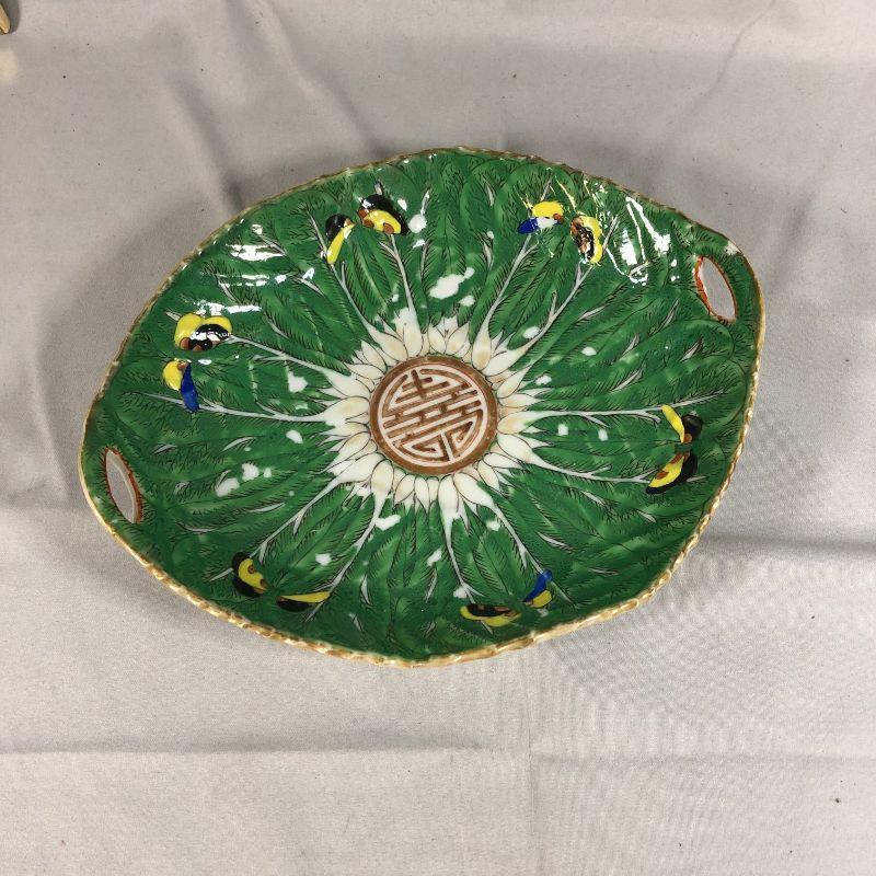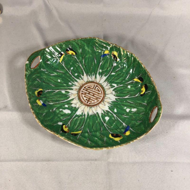 Pretty dish that is in very good condition. There are small spots of paint wear, but no chips or cracks were found. It is 8.75" at the widest.