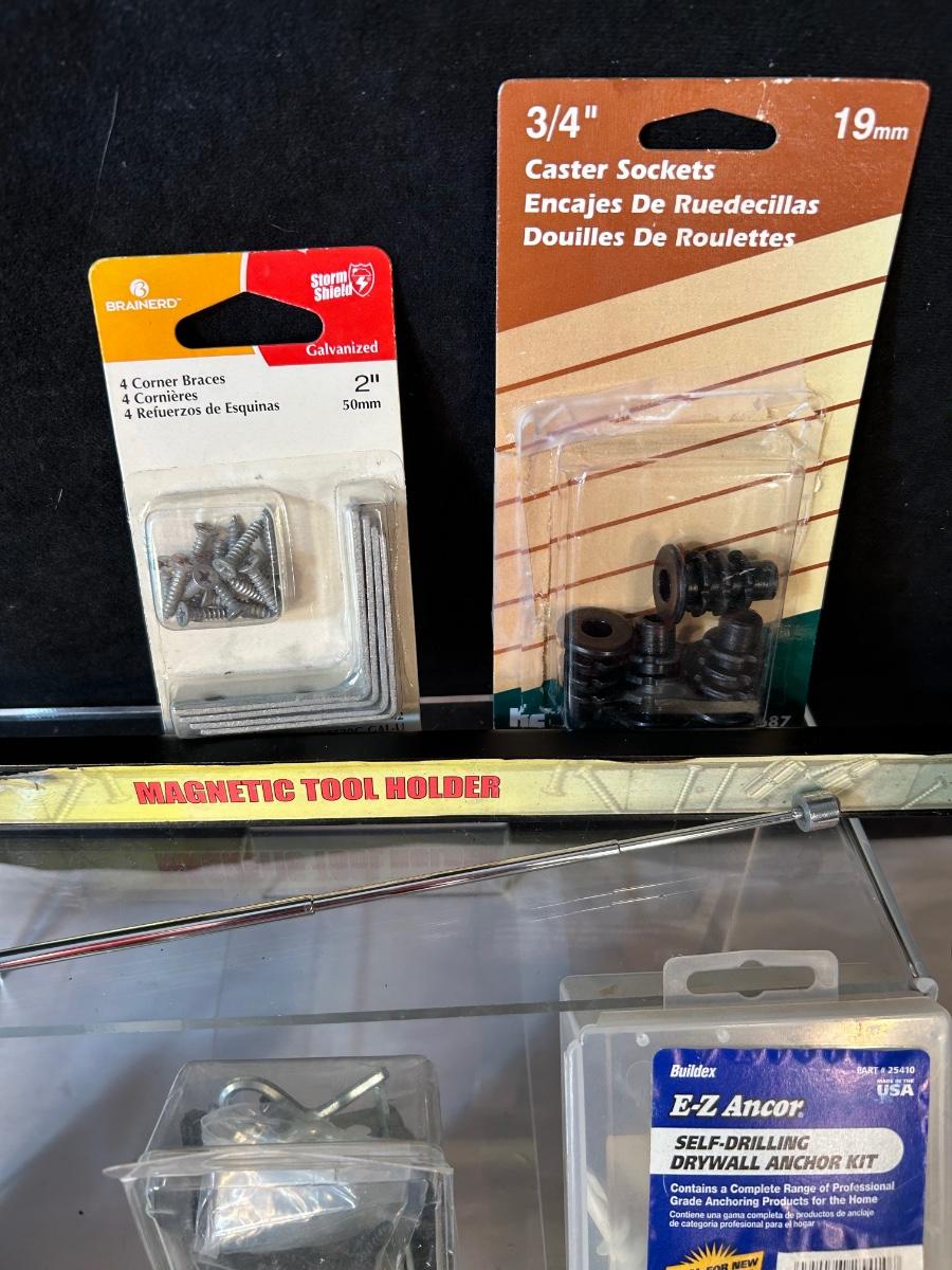 17 pkgs of hardware, magnetic wand, magnetic dish, wall-mounted magnetic tool holder and grabber