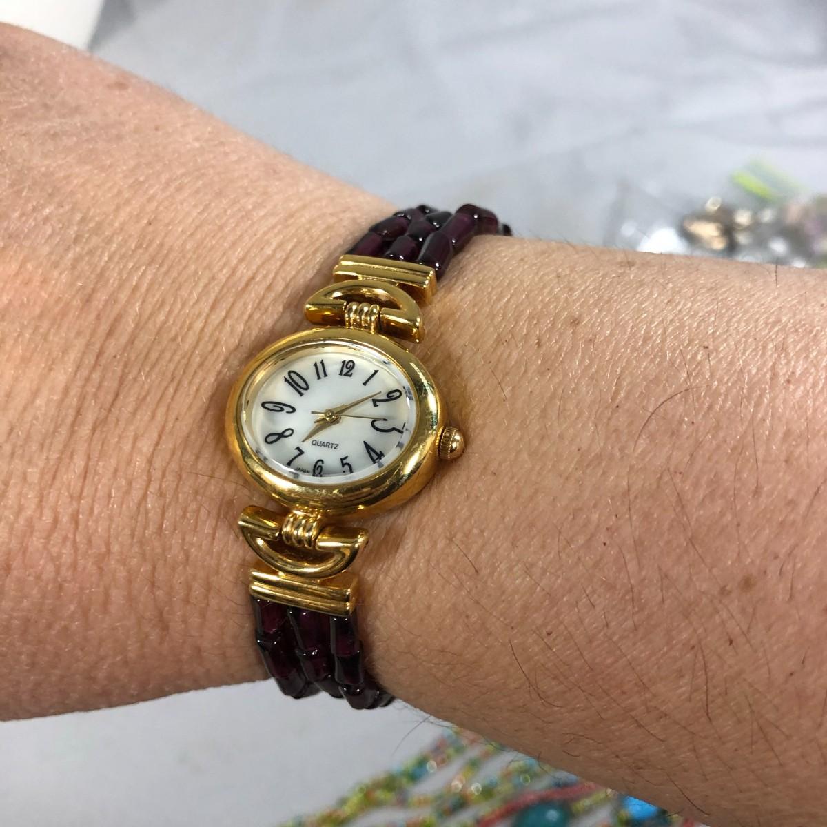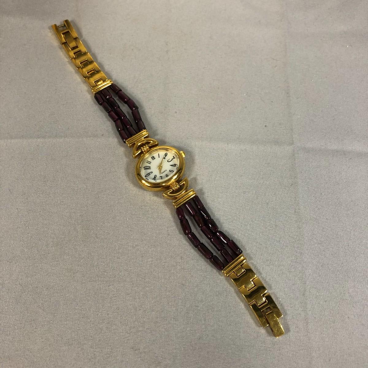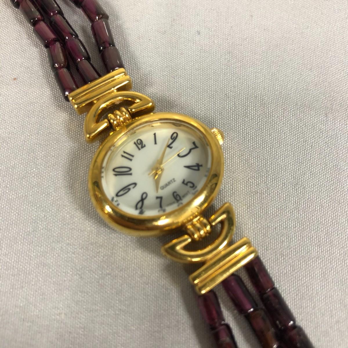 This watch looks like it was never worn - so signs of scratches or gold tone wear. There are three rows of glass beads and a removable link to shorten the band. In full length, it is about 7.75" long. The watch is not currently working, and based on the condition of the watch, my assumption is that it just needs a new battery (but I'm not sure).