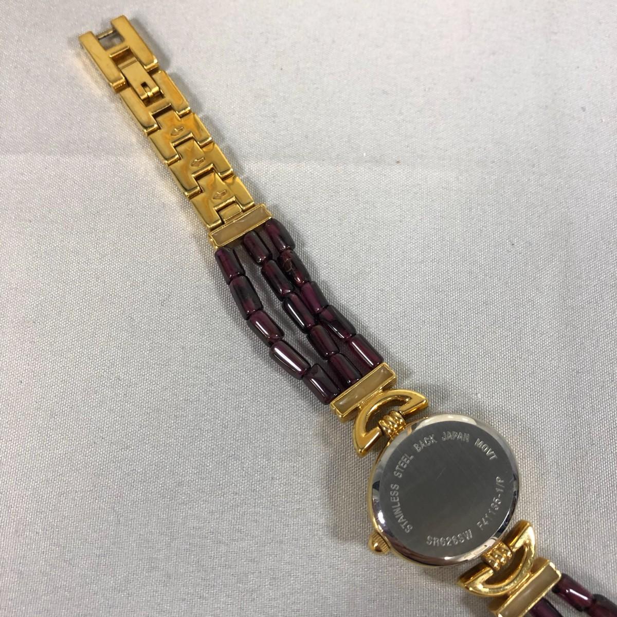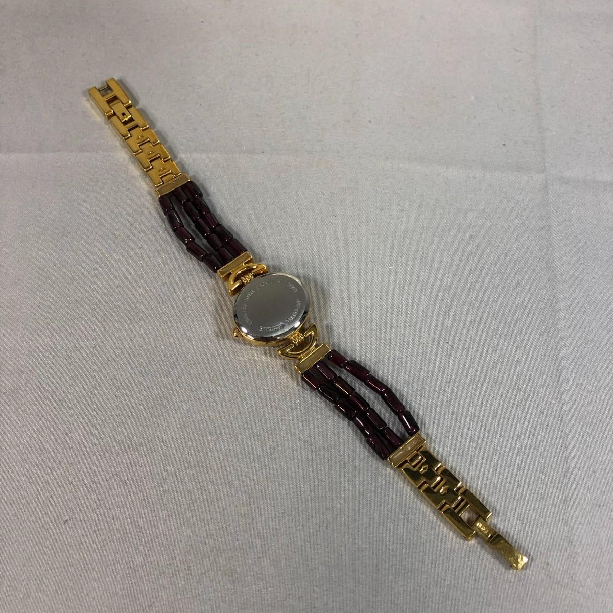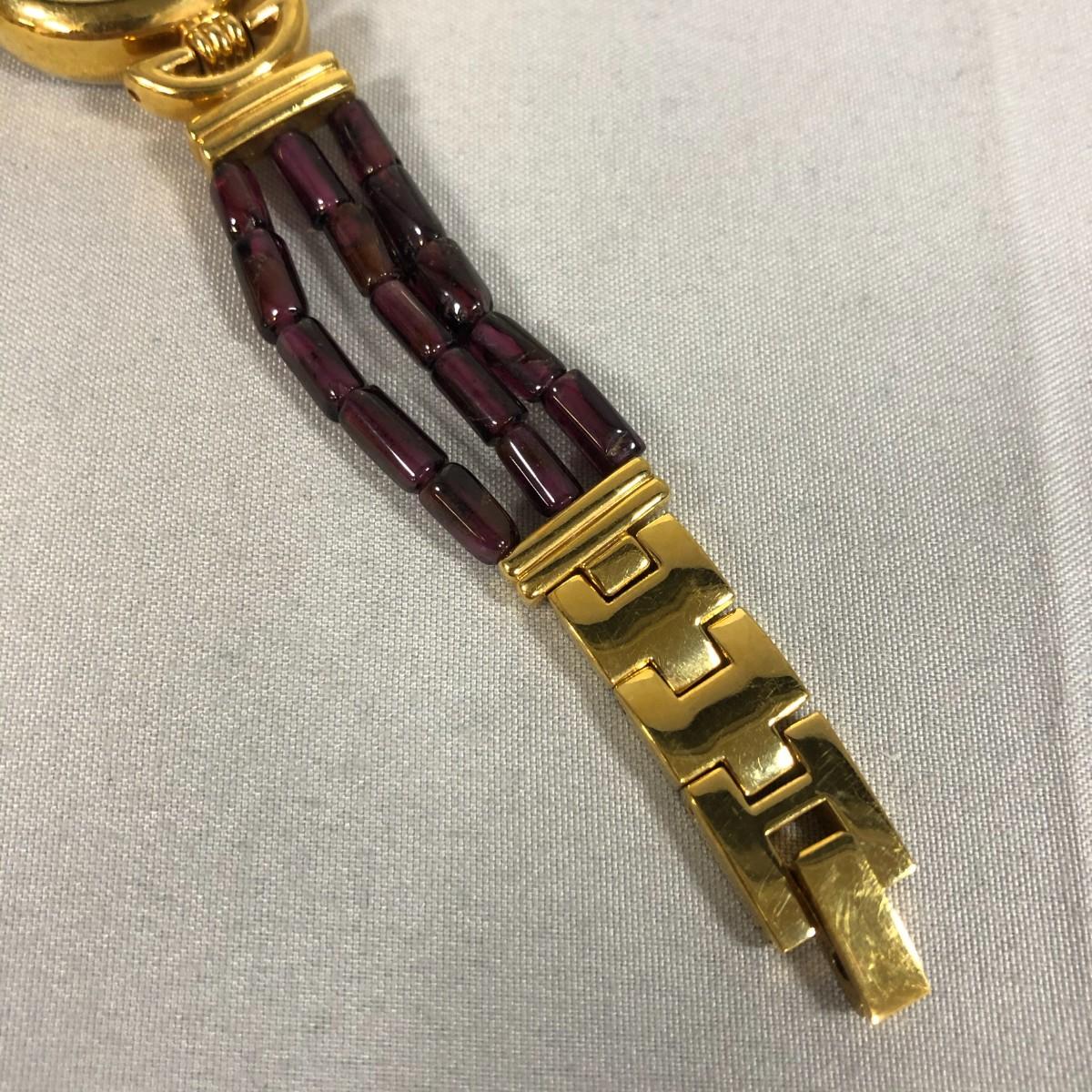 This watch looks like it was never worn - so signs of scratches or gold tone wear. There are three rows of glass beads and a removable link to shorten the band. In full length, it is about 7.75" long. The watch is not currently working, and based on the condition of the watch, my assumption is that it just needs a new battery (but I'm not sure).