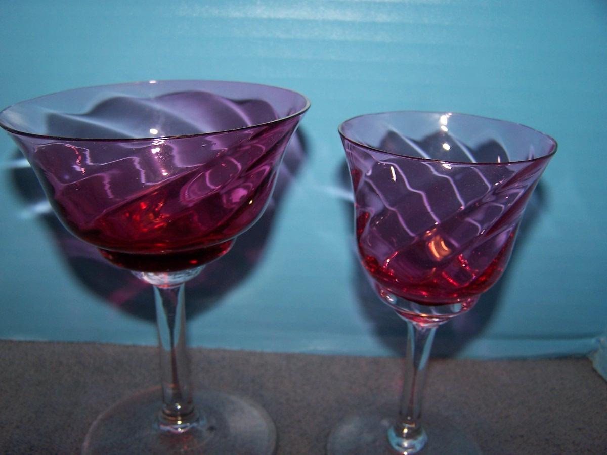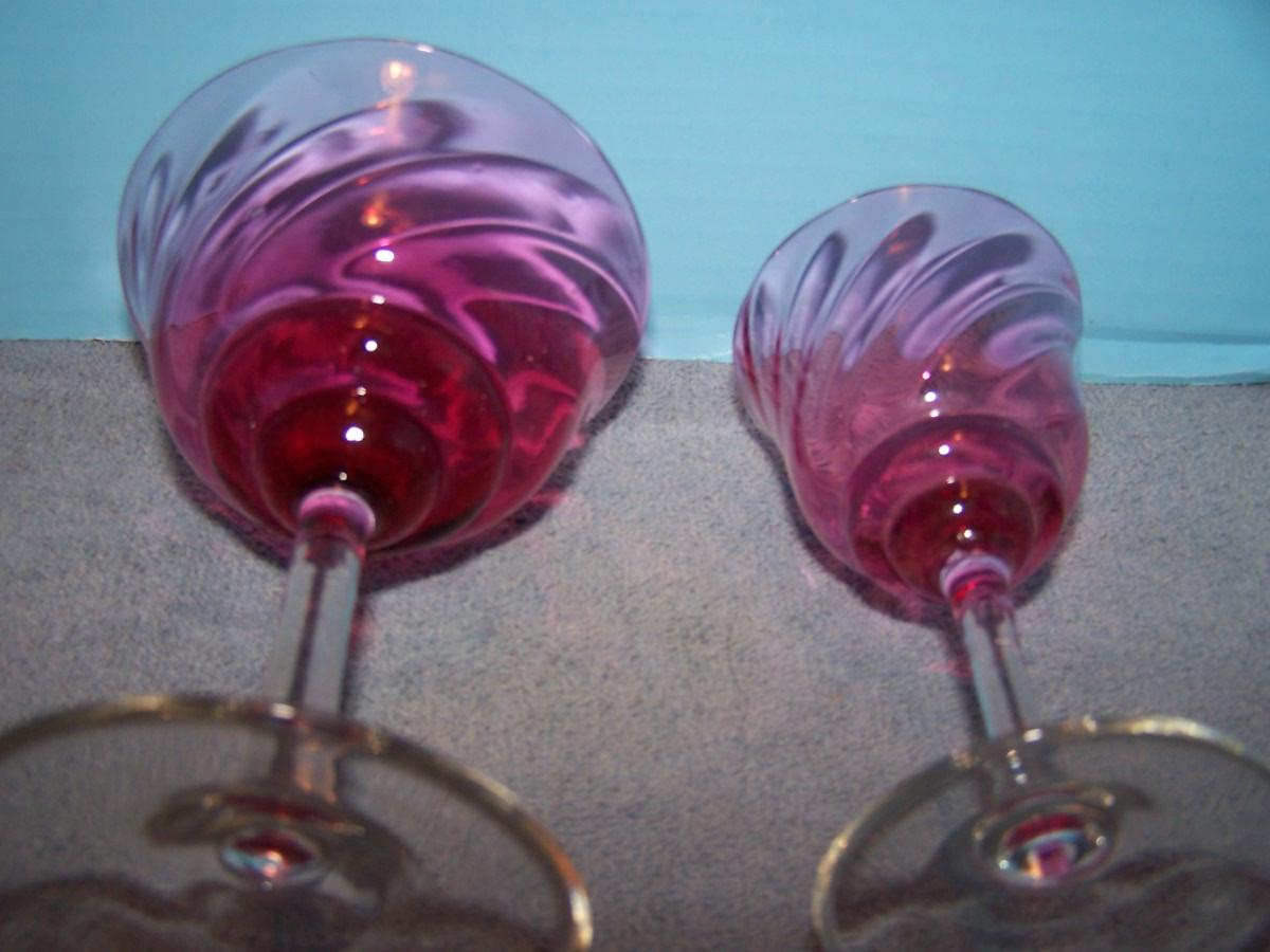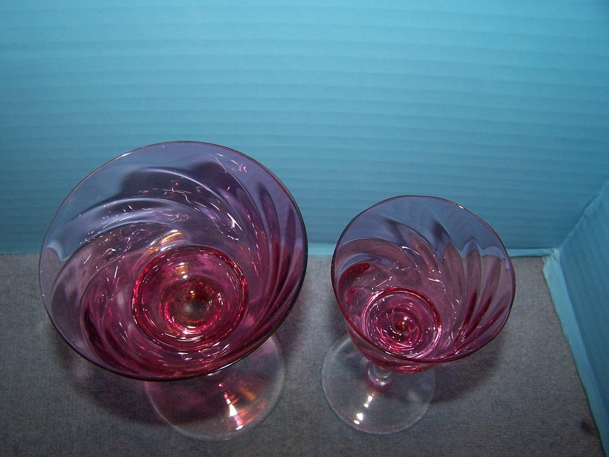 THIS IS BEAUTIFUL VINTAGE CRANBERRY SWIRL STEMWARE. NO MAKERS' MARKS... THEY ARE 4 7/8'' AND 5 1/8'' TALL... SEVERAL HAVE TEENY RIM NICKS, OTHERWISE, NO DAMAGE...