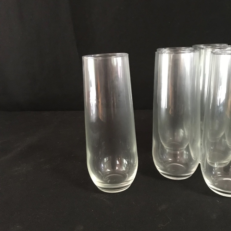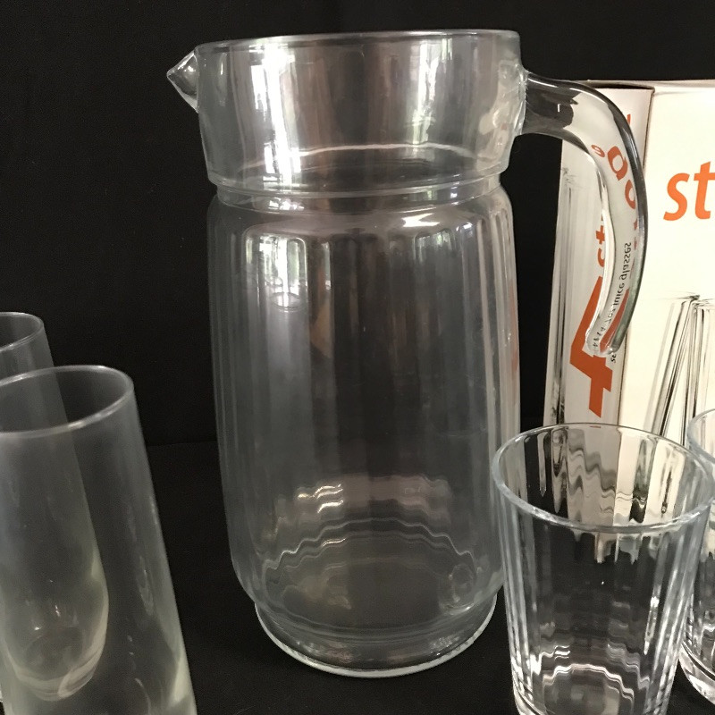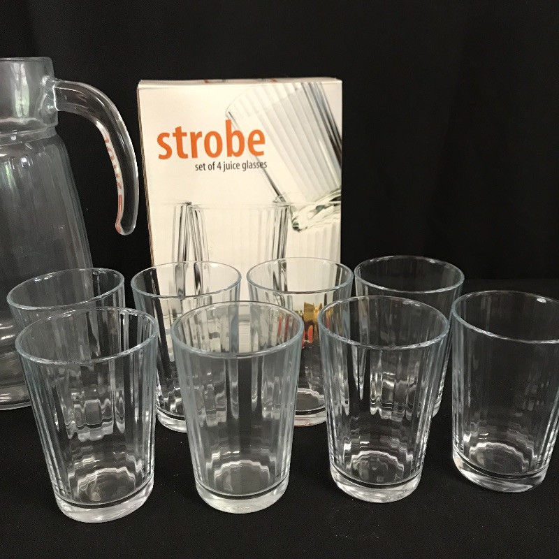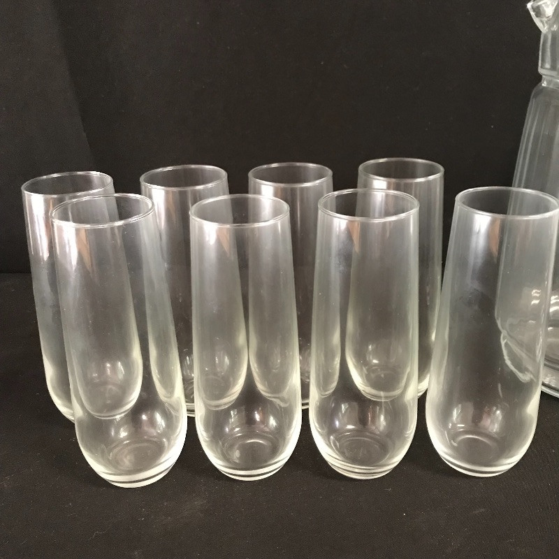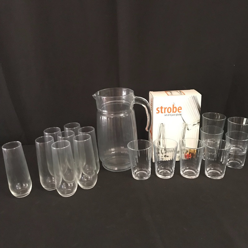 Liven up your next late breakfast party with these eight stemless champagne flutes perfect for mimosas. Lot also contains a lovely glass pitcher and twelve 7oz Strobe ribbed juice tumblers, four of which are still in their original packaging.