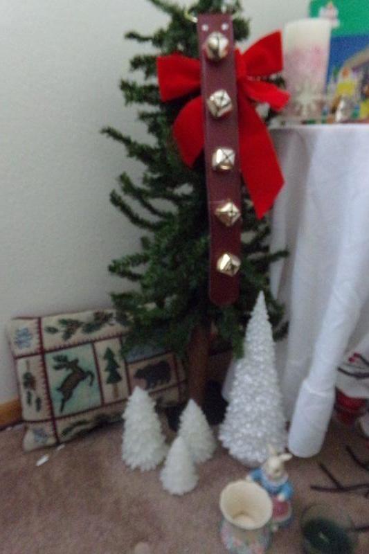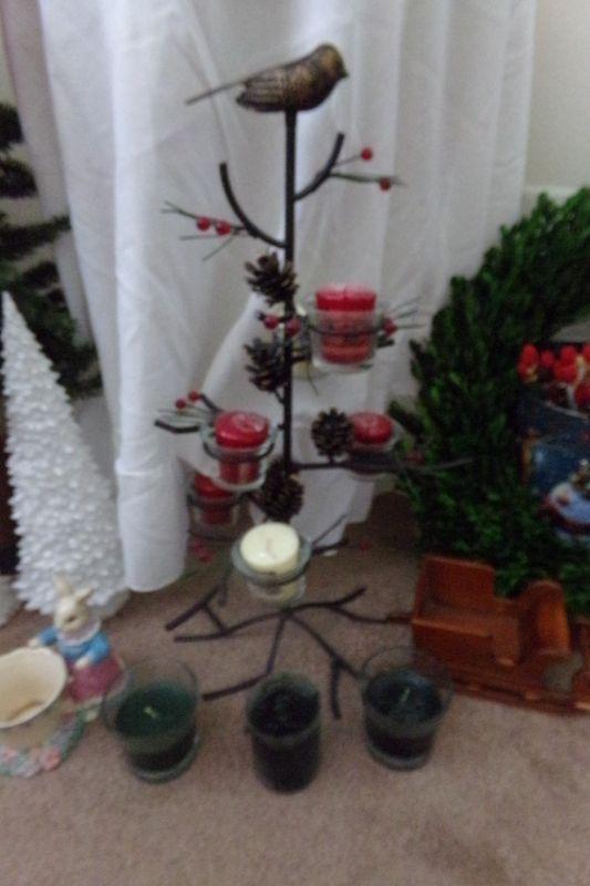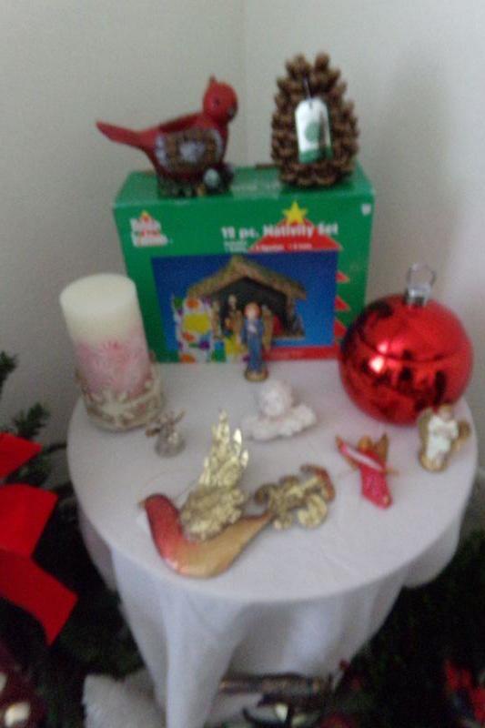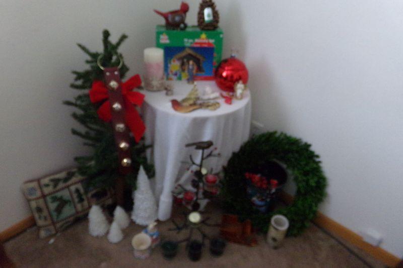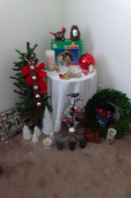 NATIVITY SET, VARIETY OF CANDLES, SMALL TREE, PILLOW, METAL CANDLE TREE, BELLS,, SMALL ROUND TABLE, MORE