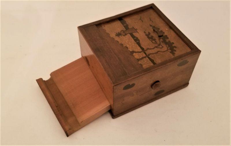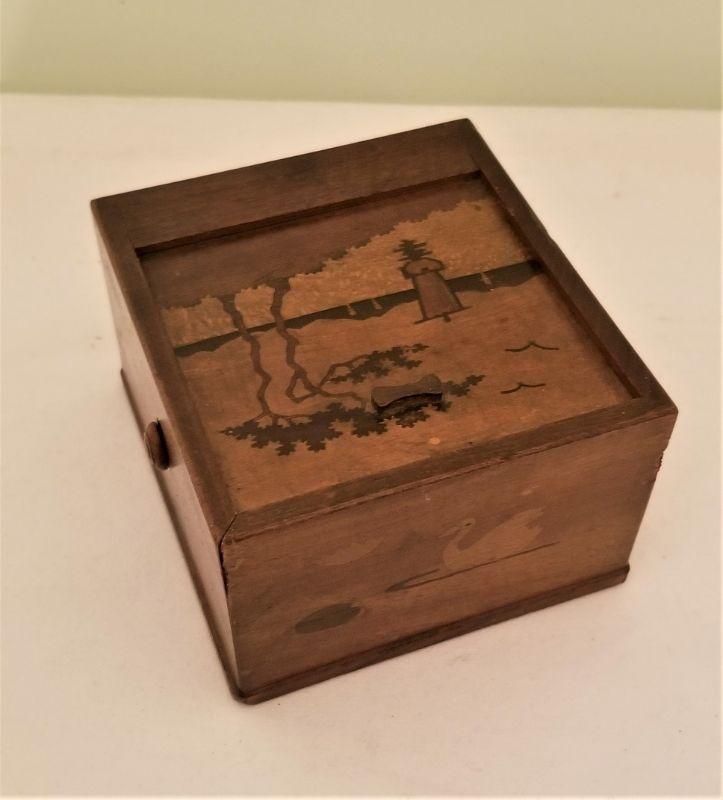 Great old Cigarette box here in working condition. Just press the side button and the drawer springs out. Inlaid wood - most likely purchased on a trip. Measures 4" x 4.25" - 2.5" tall.