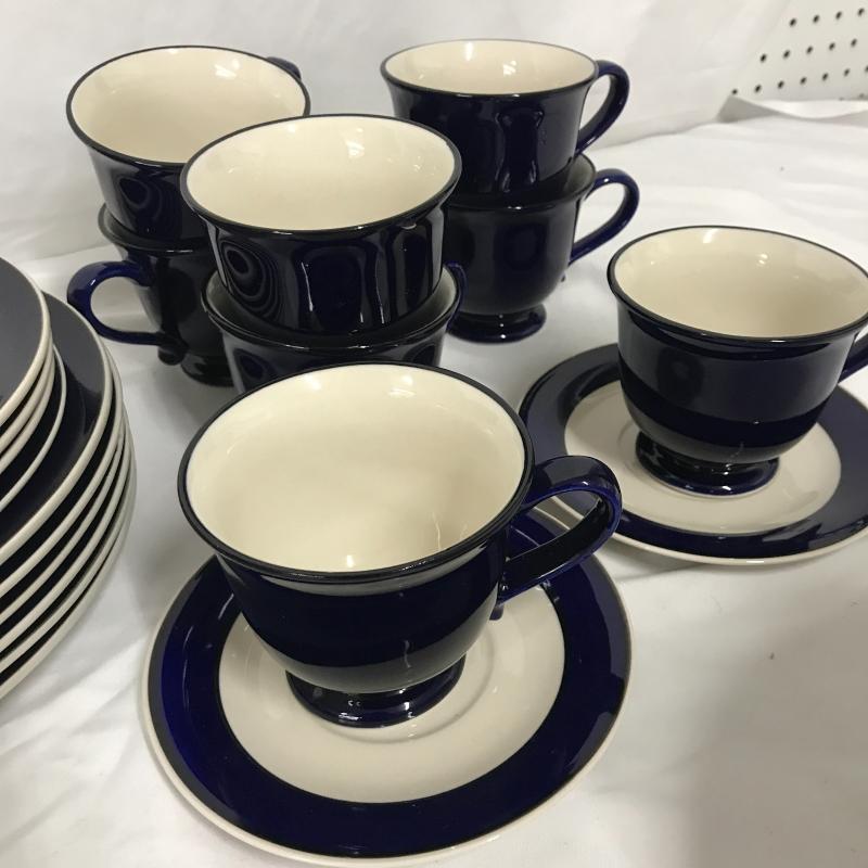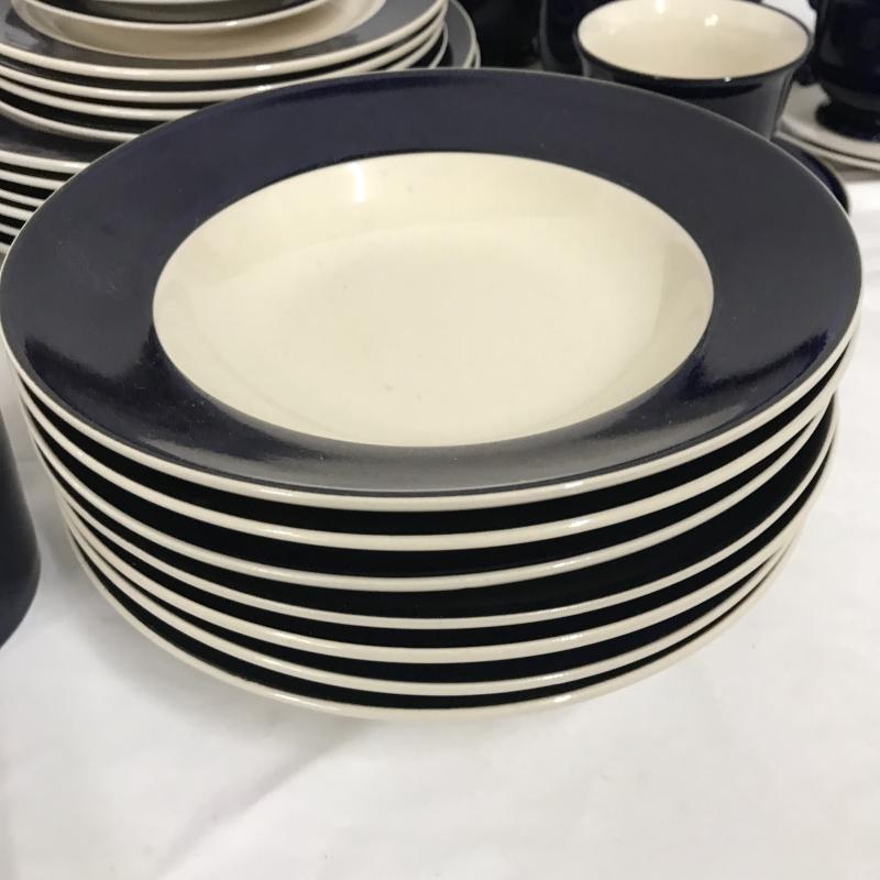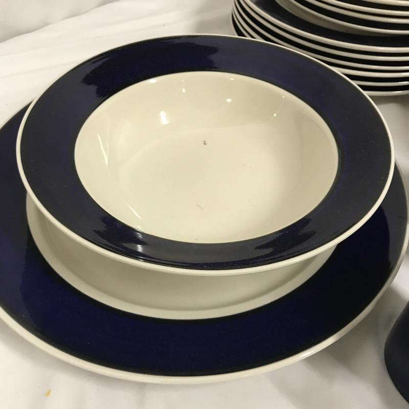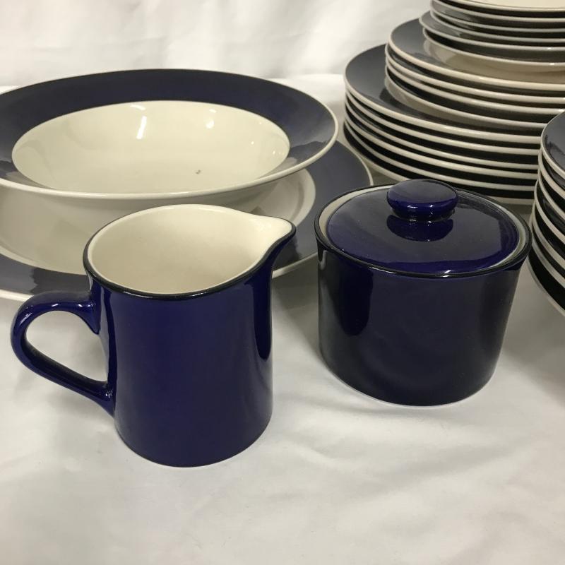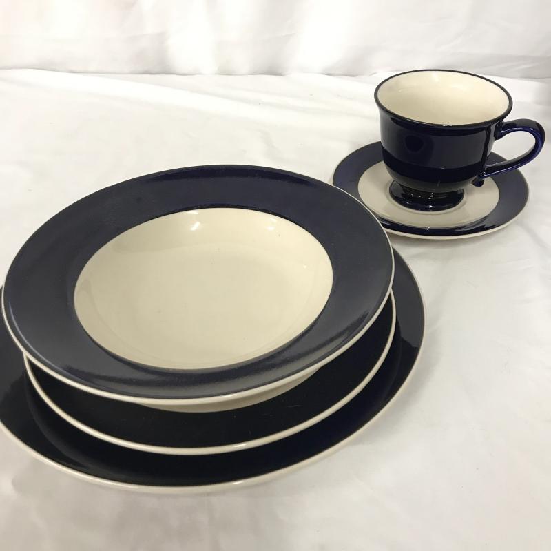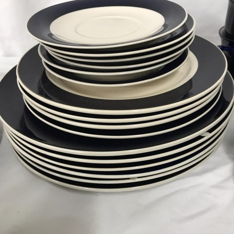 Set of Gibson Navy blue and beige dinnerware. Includes 38 pieces. A few chips in plates. See photos. Local Pick up only in Maggie Valley, NC.