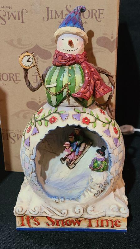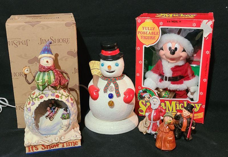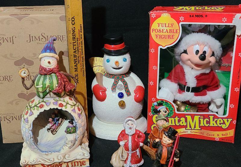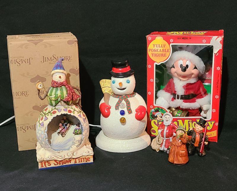 This lot includes a fun lot of holiday collectibles including: Goebel Figurines, Jim Shore Snowman, Light up Vintage Snowman, and Poseable Mickey Mouse!