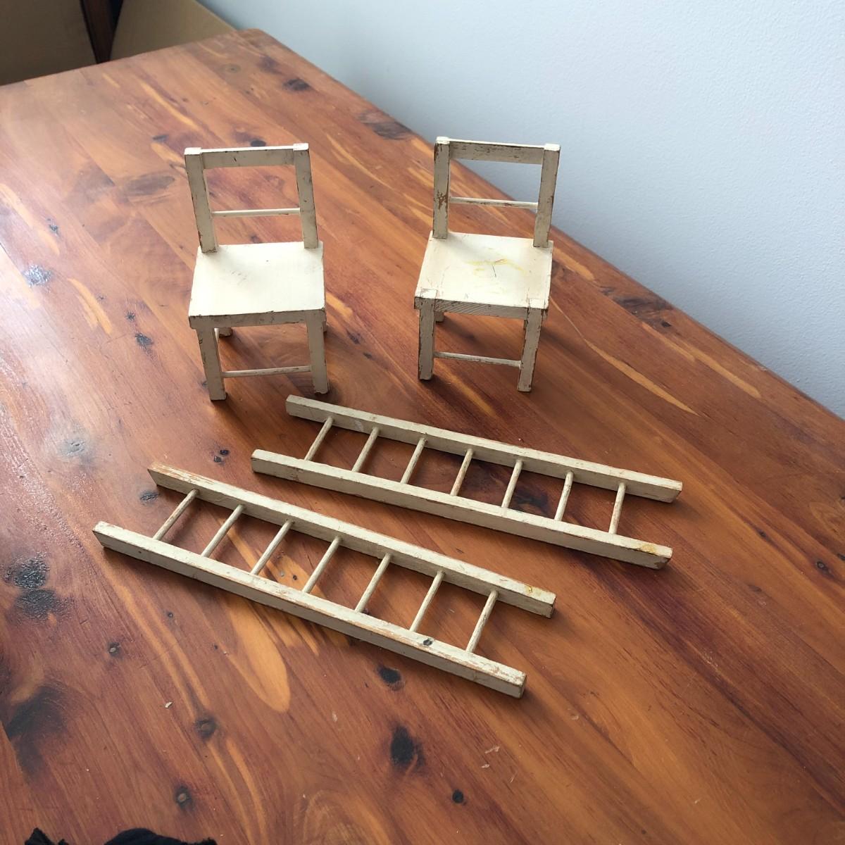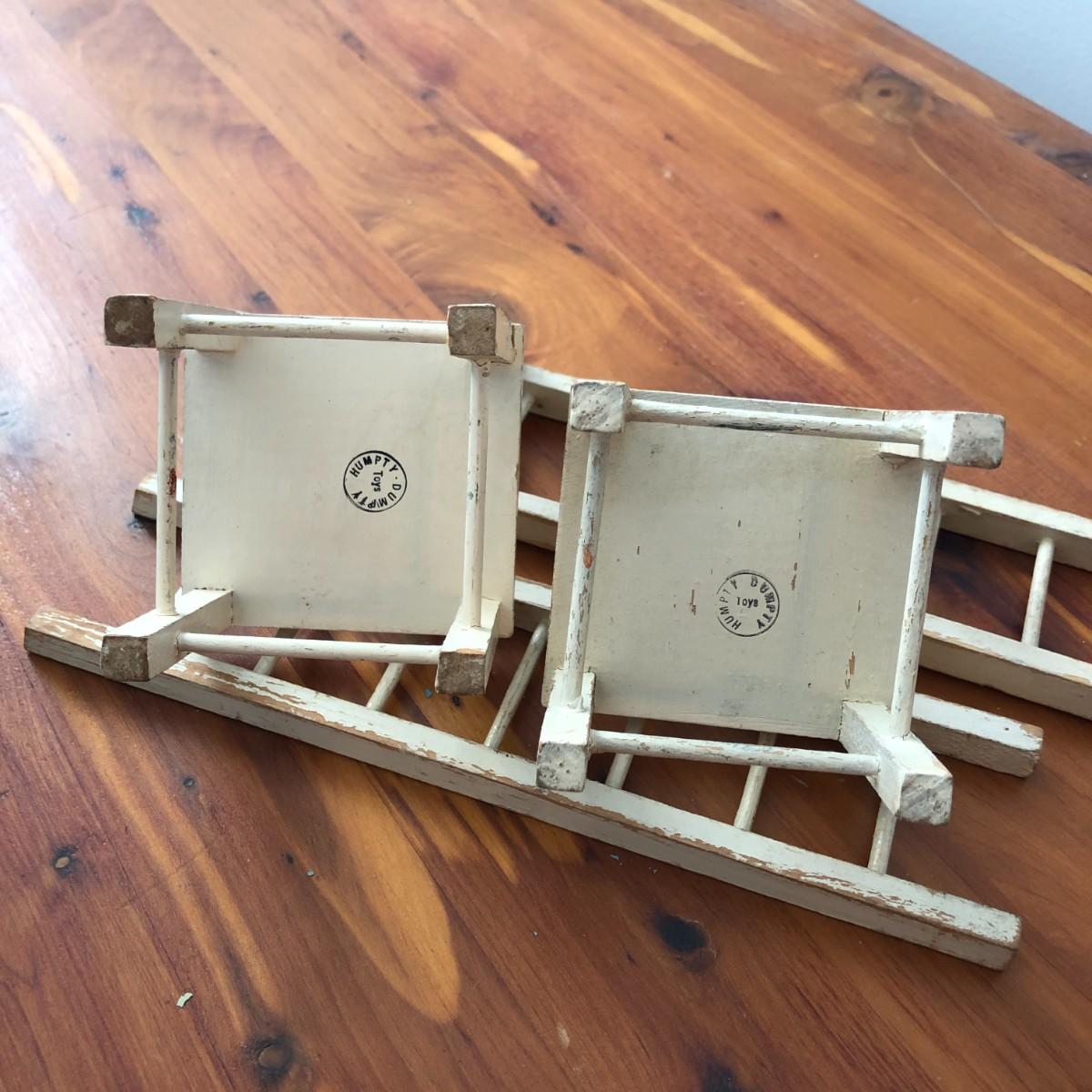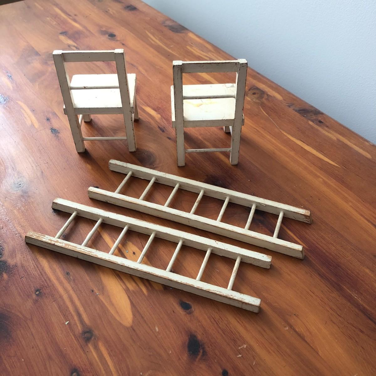 The chairs are marked Humpty Dumpty Toys, but the ladders are not. I'm assuming that they are also HDT because the paint is exactly the same and the wood looks the same as well. The chairs are about 4.5" tall and the ladders are about 8.25" long. These were used by the consignor as a child in the 1950s.