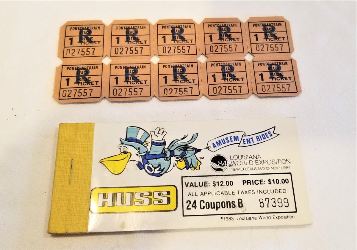 Five New Orleans Pontchartain Beach Amusement park ride tickets and a partially used book on 1984 World's Fair Ride tickets.