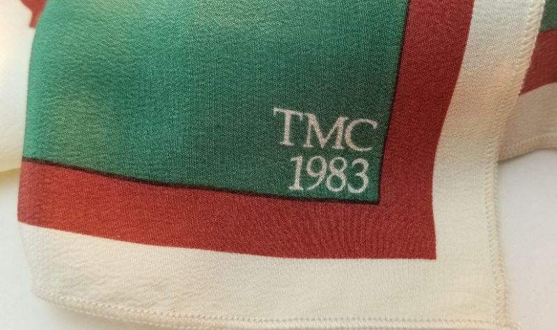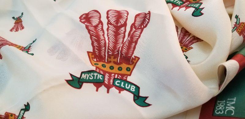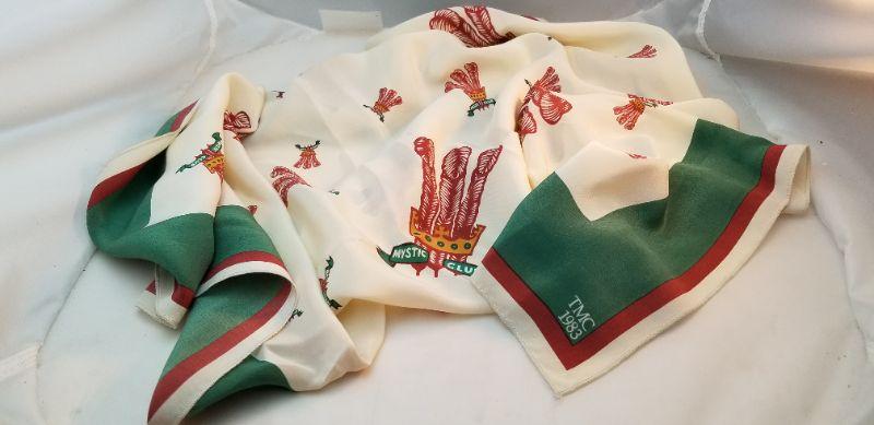 Lovely ladies silk scarf - special order from the Mystic Club, dated 1983. Measures 30" x 28". Gently worn, looks good.