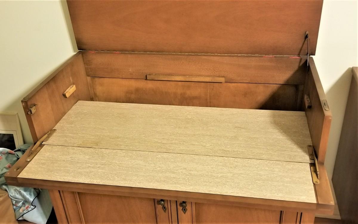 Interesting MidCentury Bar/Cellarette - lid lifts up, front folds down to reveal formica-like surface, space for bottles and decanters, lots of storage below. Has the original key - all the locks work. Want to keep the kids how of the liquor cabinet? This will do it. Even a key hole on the side to lock the top portion. Measures 36" across, 18.25" deep, 32.5" tall. With the lid up, it is 50" tall. Note: in the top section it appears there are "shims" for a shelf of glass or something that is not missing. Easy replacement, or just remove the shims. See photos.