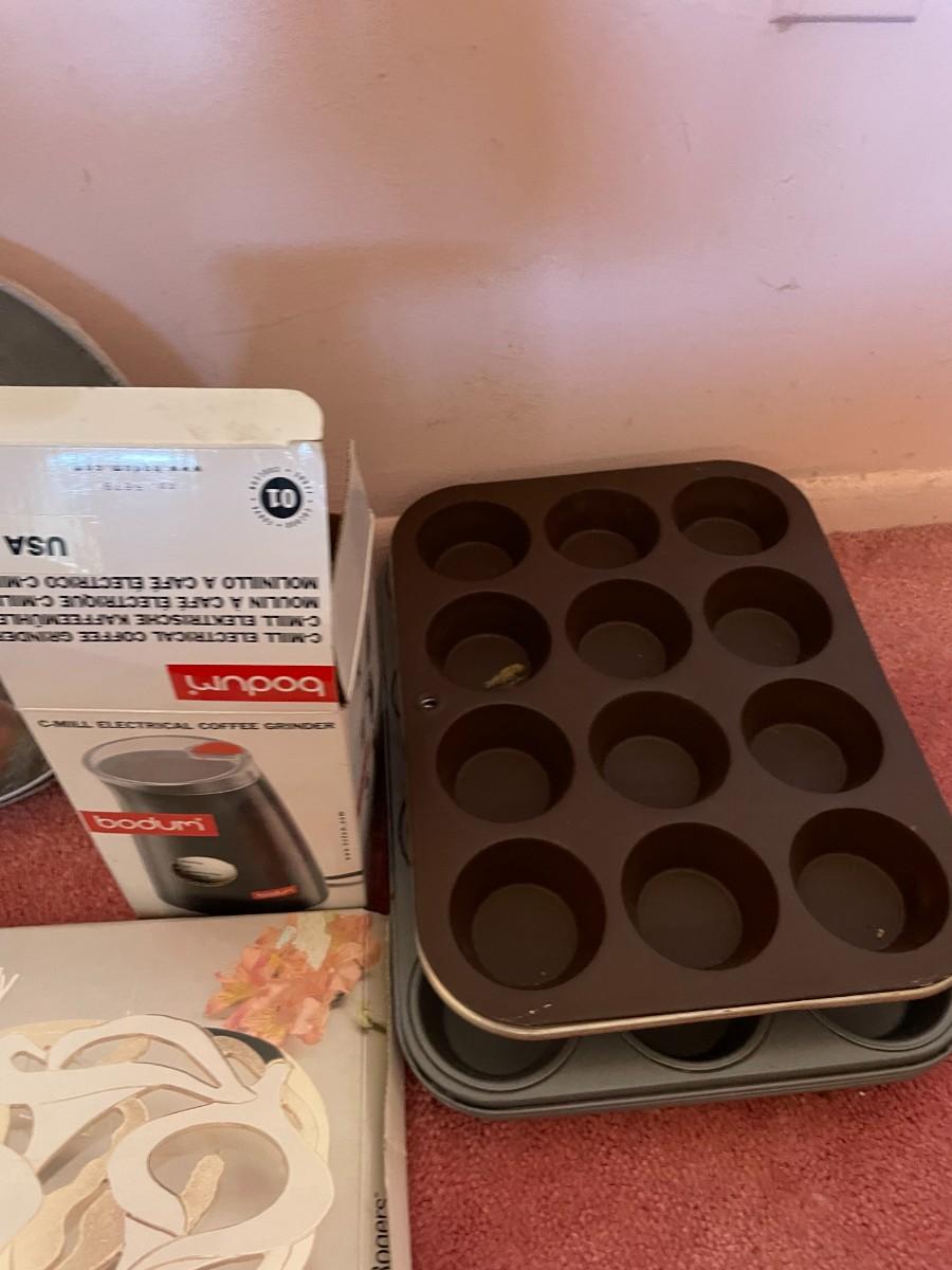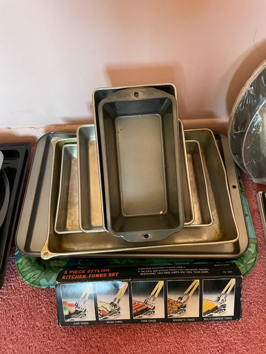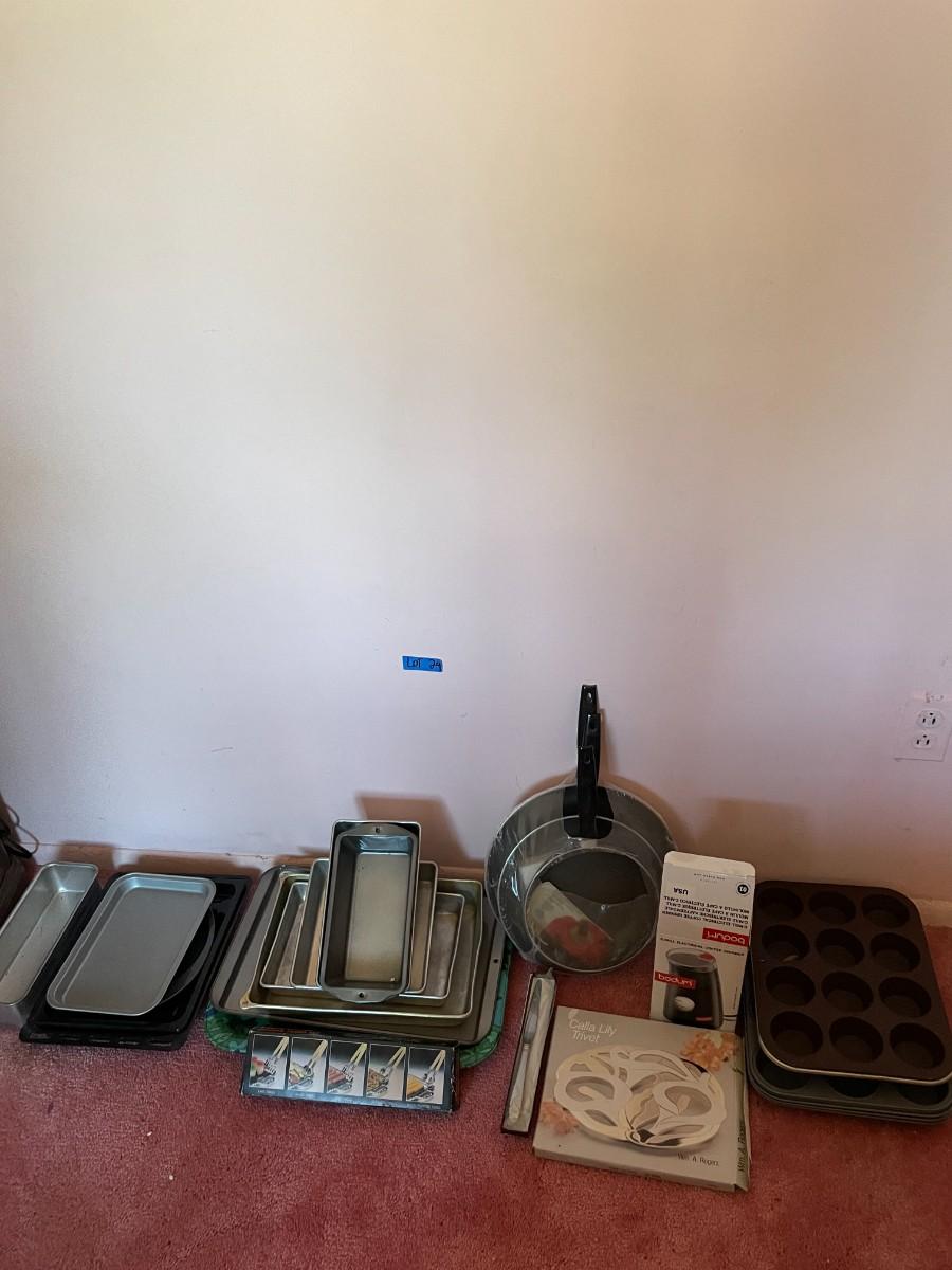 Misc. baking pans, pans for cooking, tongs, trivet, knife, bodum coffee grinder.