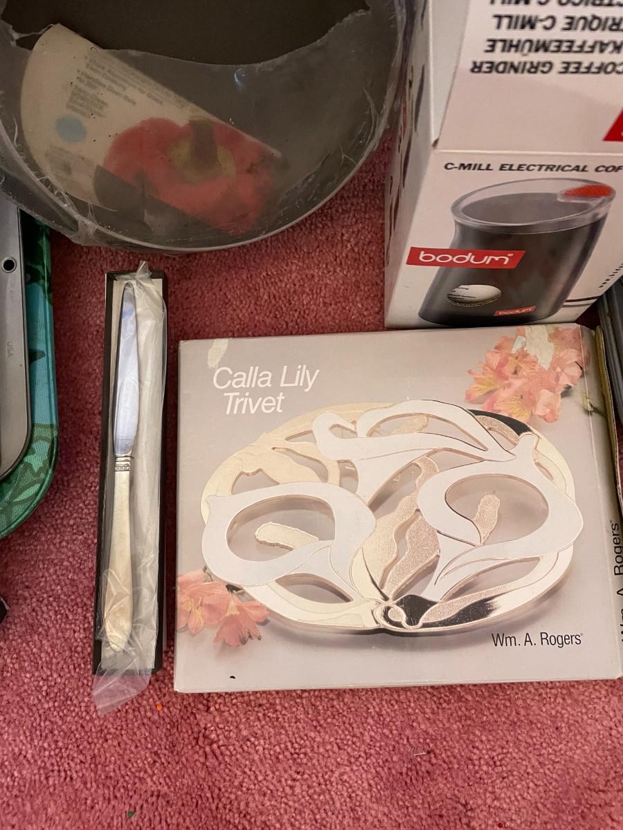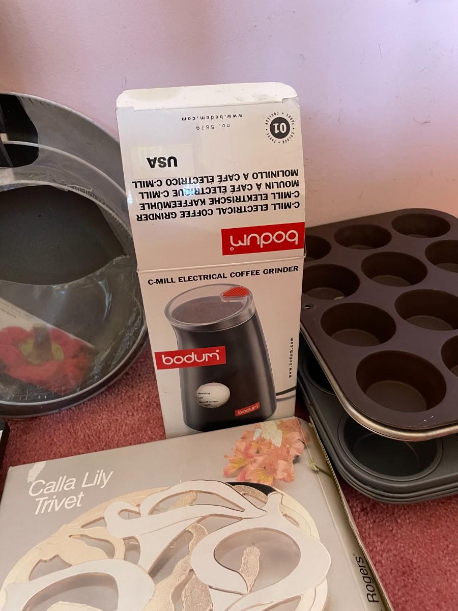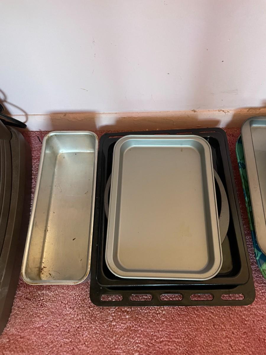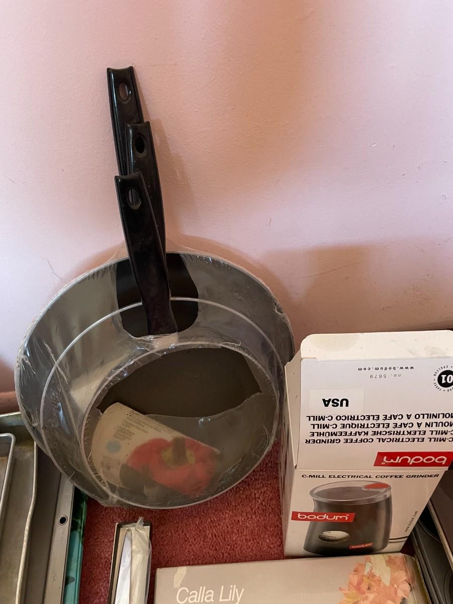 Misc. baking pans, pans for cooking, tongs, trivet, knife, bodum coffee grinder.