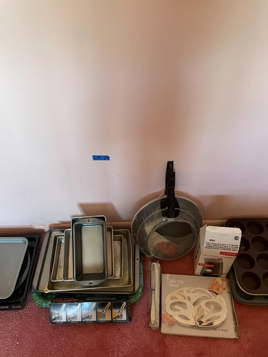 Lot 29- Misc. baking pans, pans for cooking, tongs, trivet, knife, bodum coffee grinder