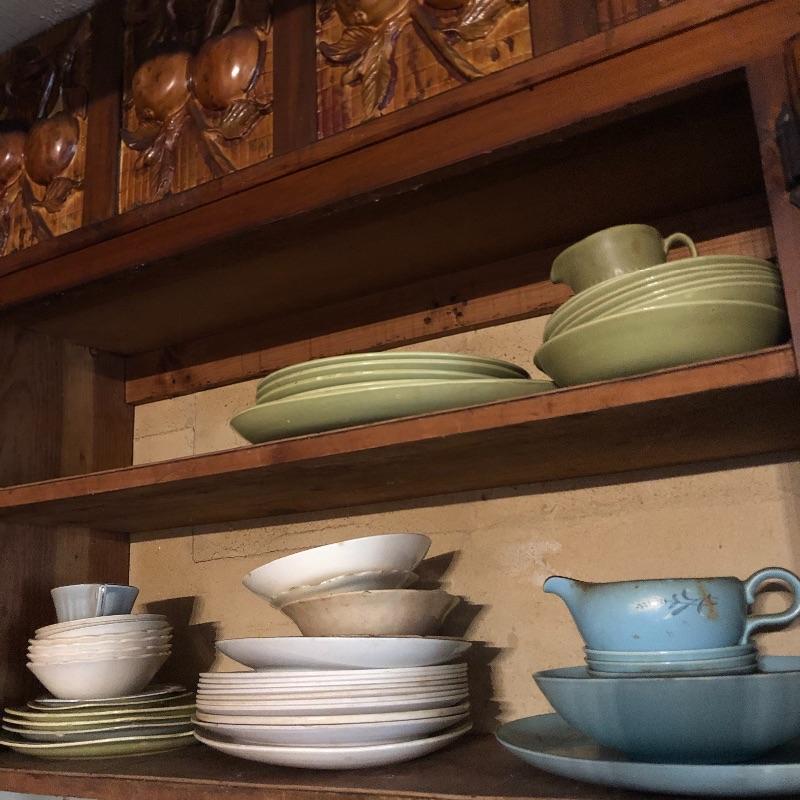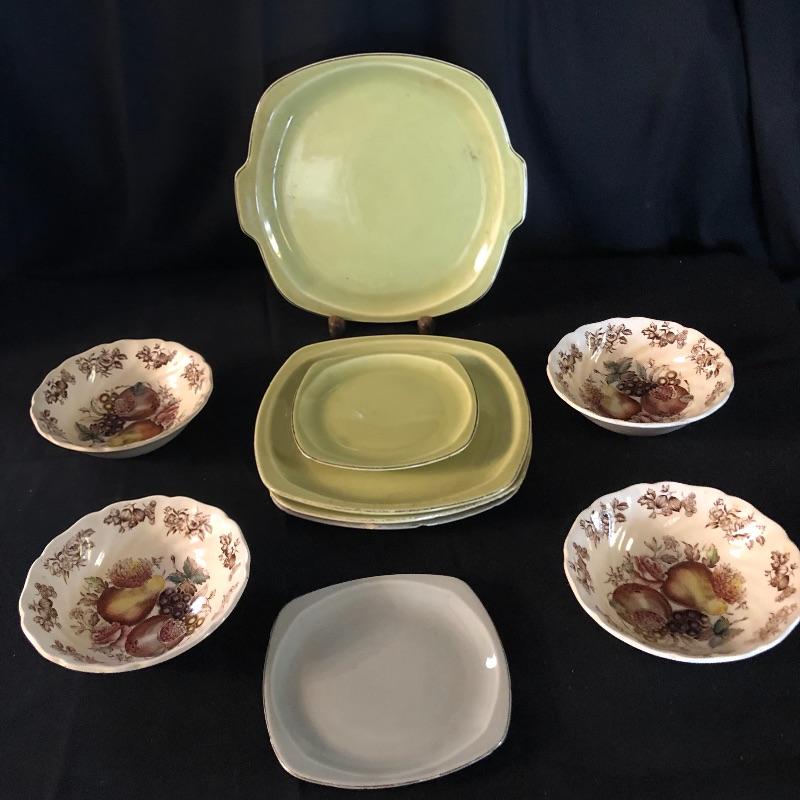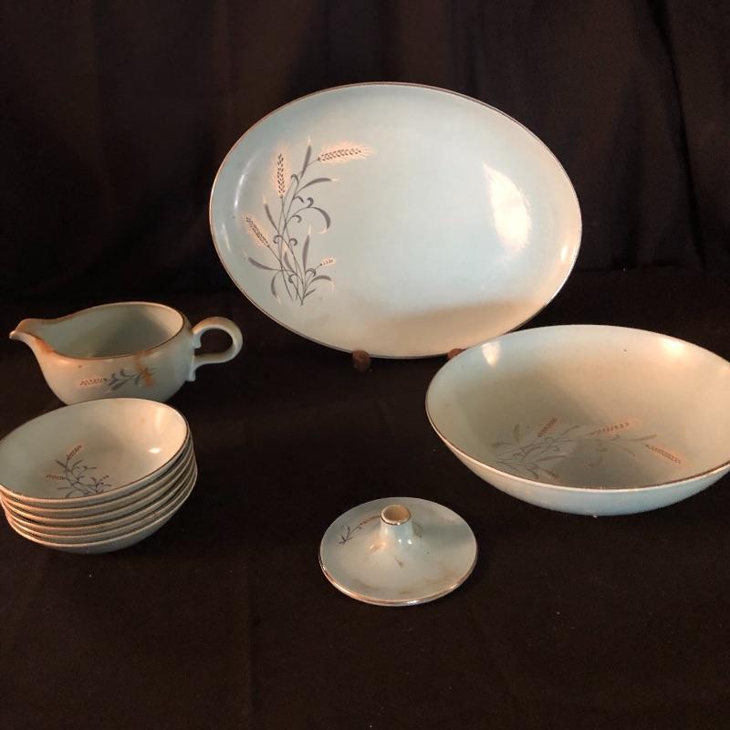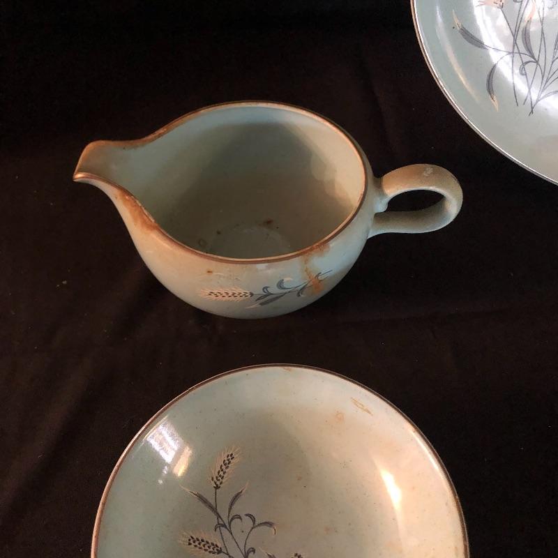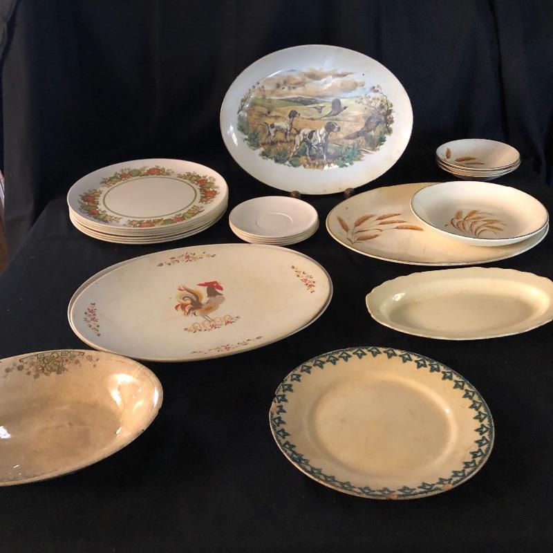 This lot has a little bit of everything! The blue wheat dish set has a platter, serving bowl, tea pot without lid and six small bowls. The green dish include one platter, one small bowl, four dinner plates, five salad plates, two saucers and a creamer. Miscellaneous dishes include seven plastic dinner plates, wheat dishes and so much more! Local pick up only.