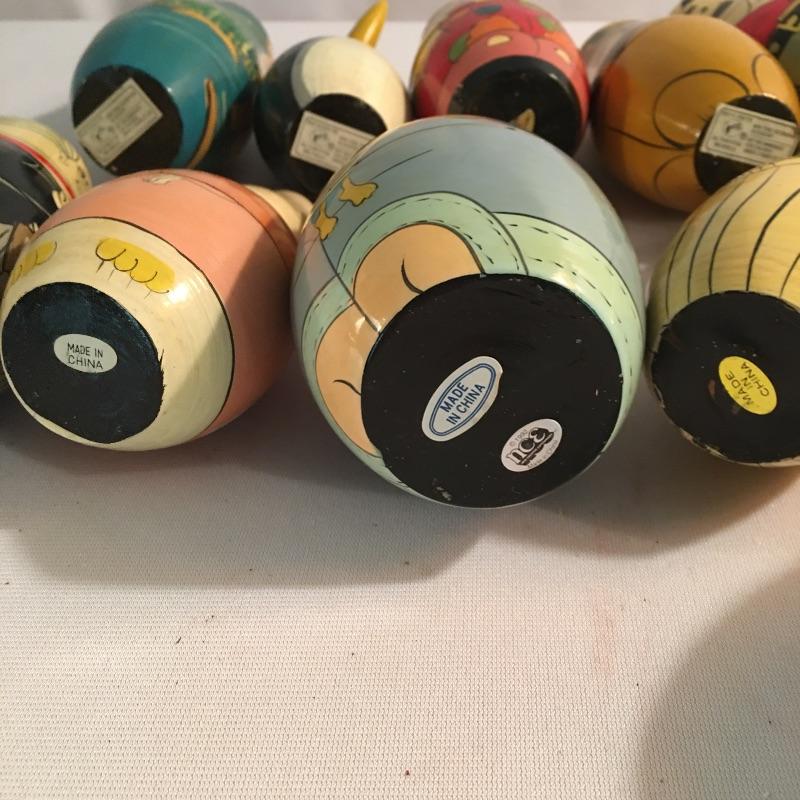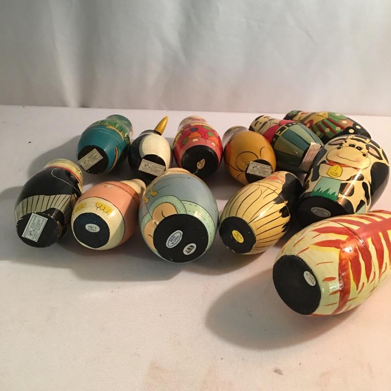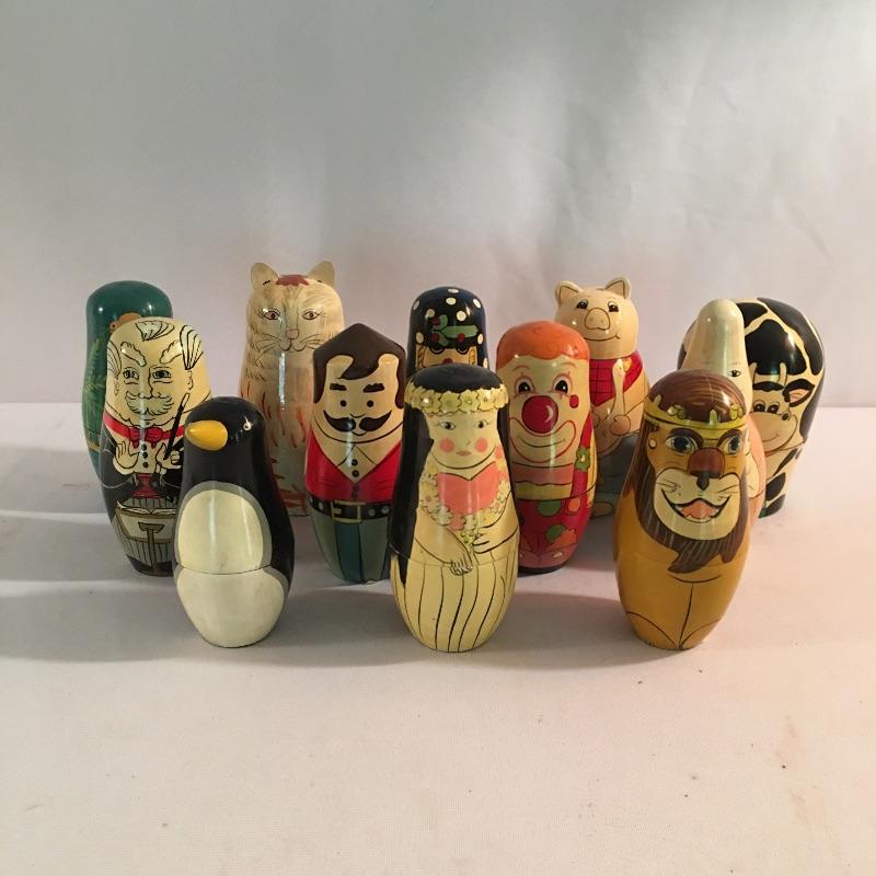 Nesting doll collection. Lot includes a dozen nesting dolls in a variety of designs and colors. Tallest doll measures 6.25” tall. Keep yourself busy for hours with these intriguing dolls.