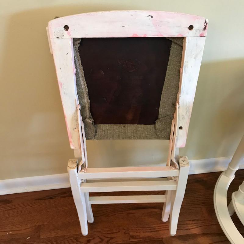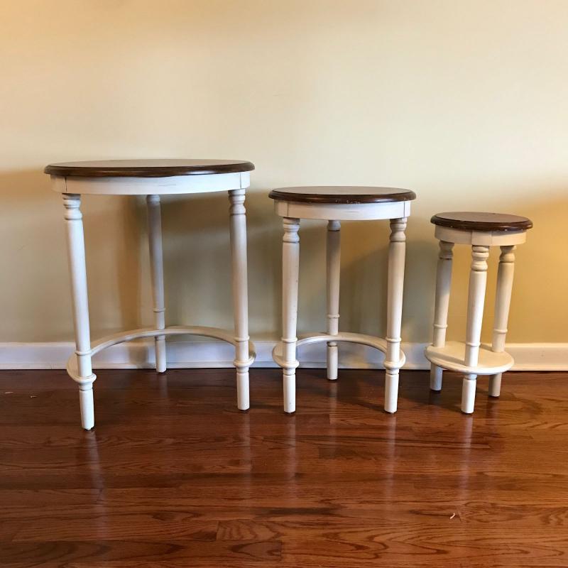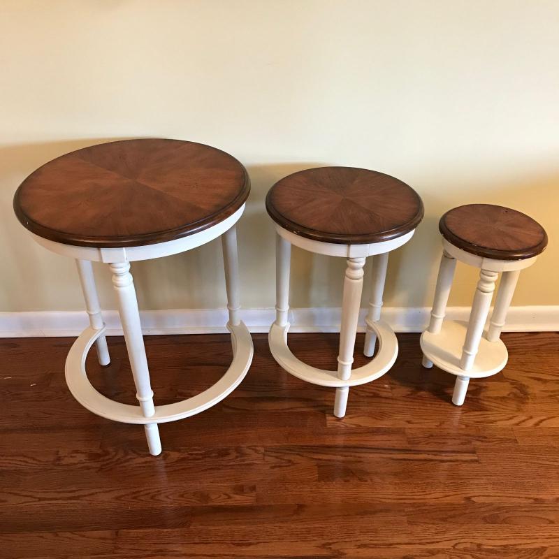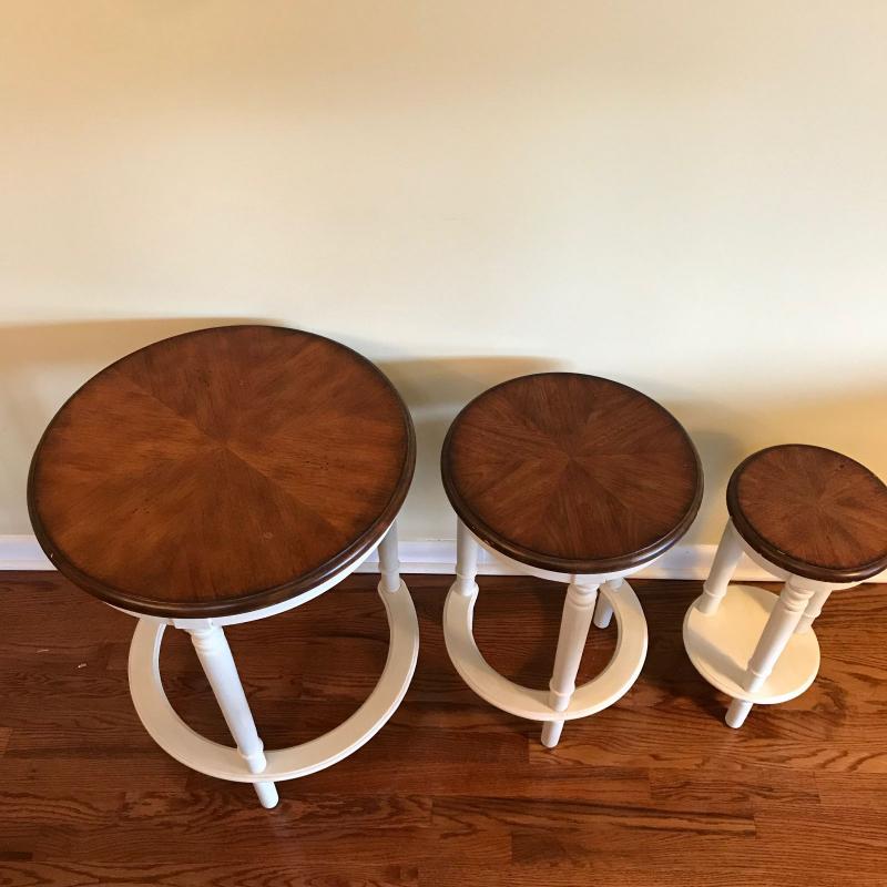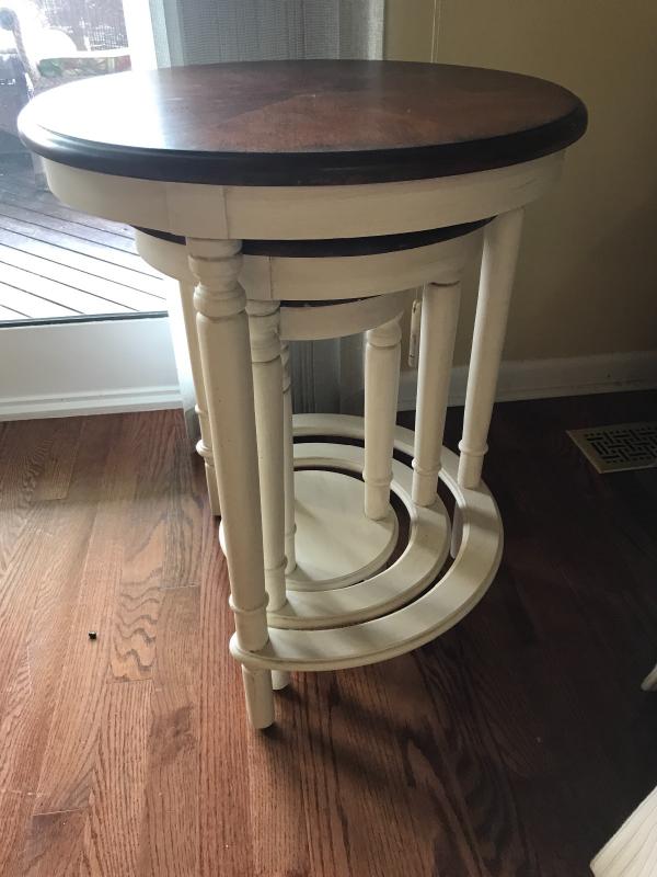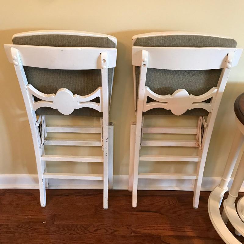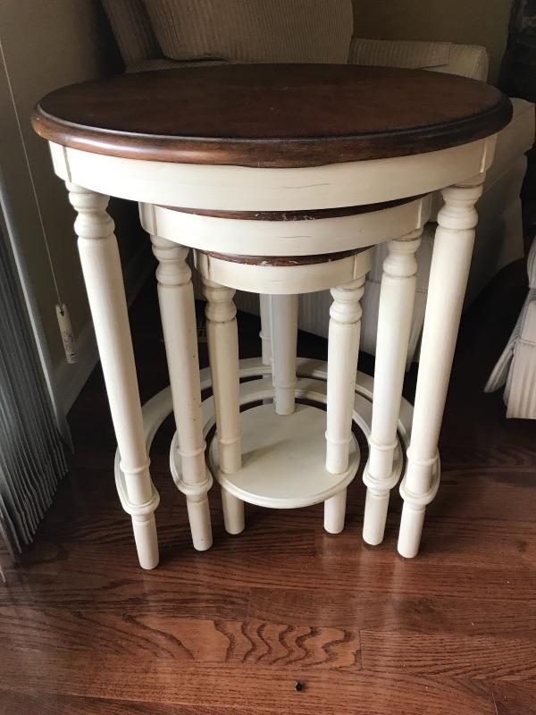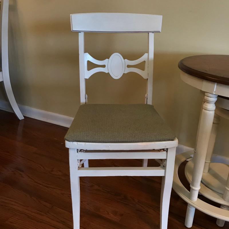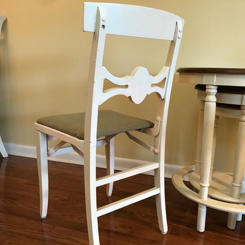 Three nesting tables in unique design. Largest measures 20.5” x 26”h. Lot also includes two cute folding chairs for extra seating that are wooden with cushion seat. No shipping.