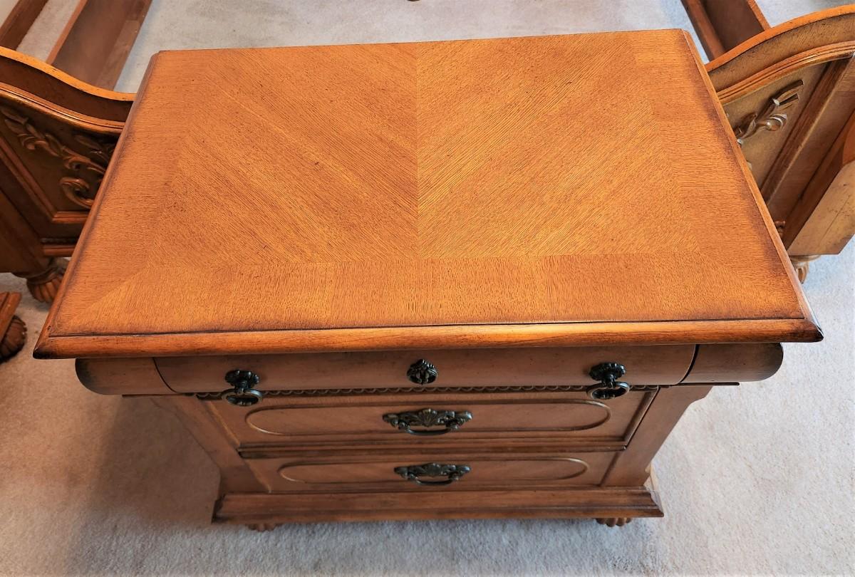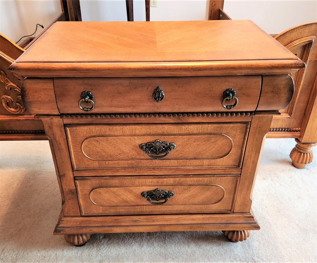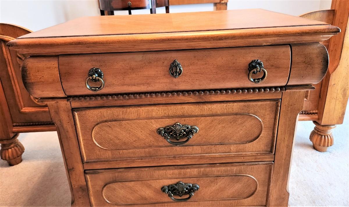 This nightstand matches the bed and chest of drawers seen in earlier lots. 3 drawers, 28" across, 17" deep, 27" tall. Gently used condition. Good looking, no maker noted.