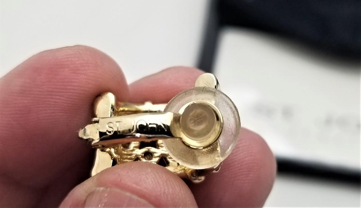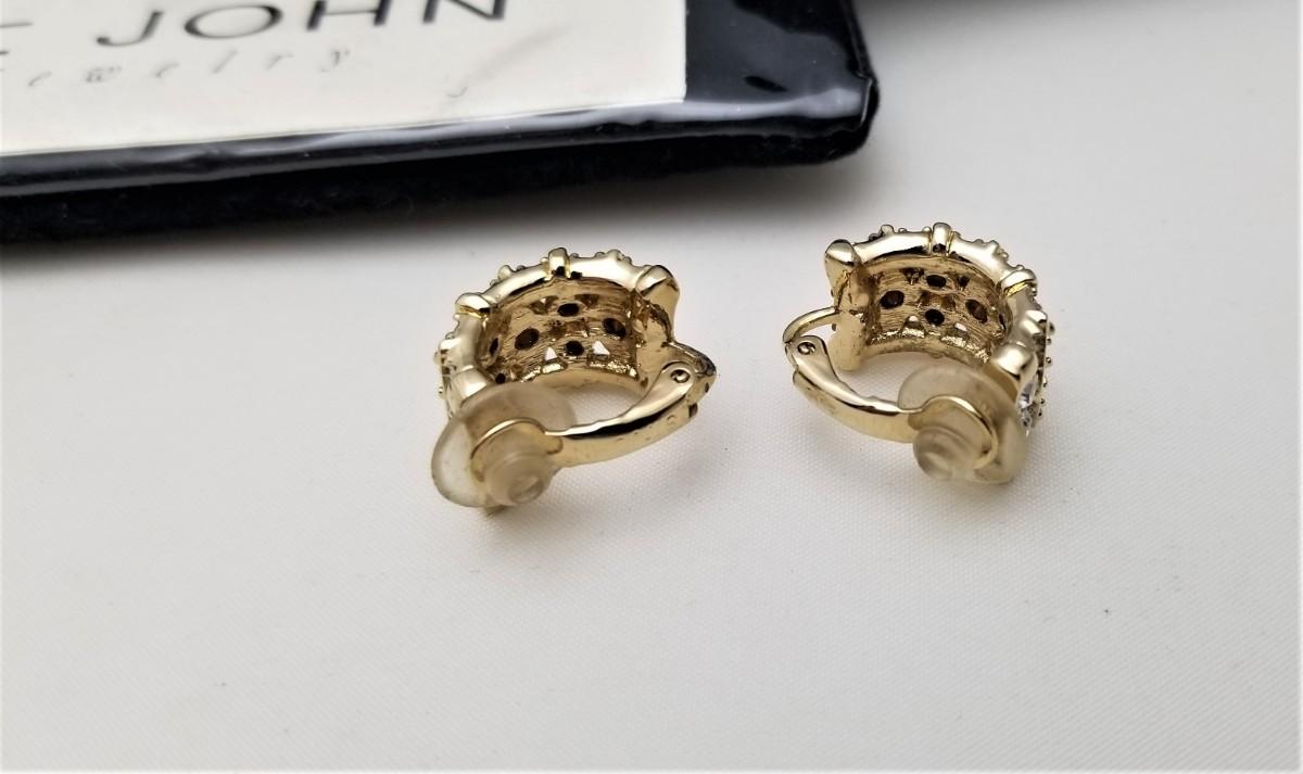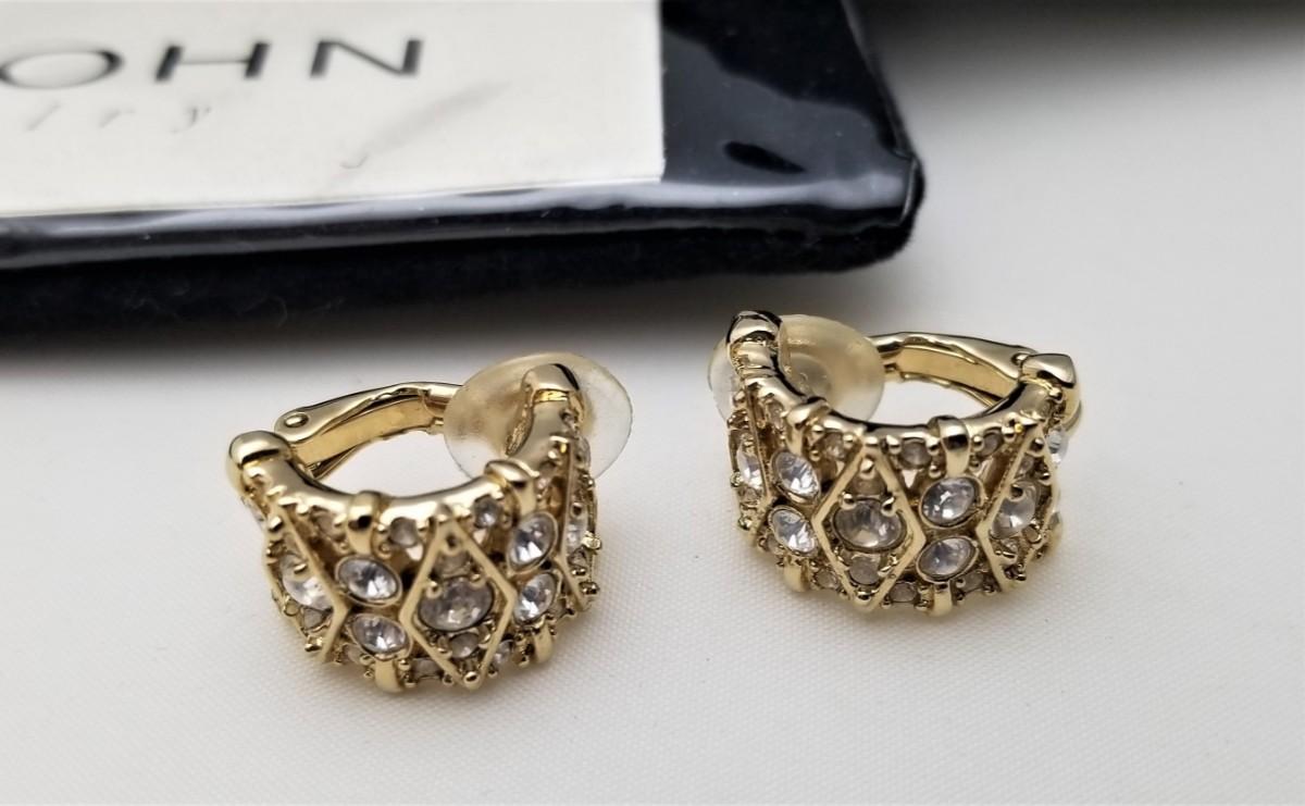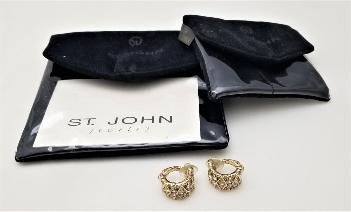 Nice pair of gold tone St. John Clip earrings - set with crystals - in the original packaging. Original price tag ($95.00) on reverse. Both are marked St. John. Good used condition. Each measures about 3/4 of an inch tall.