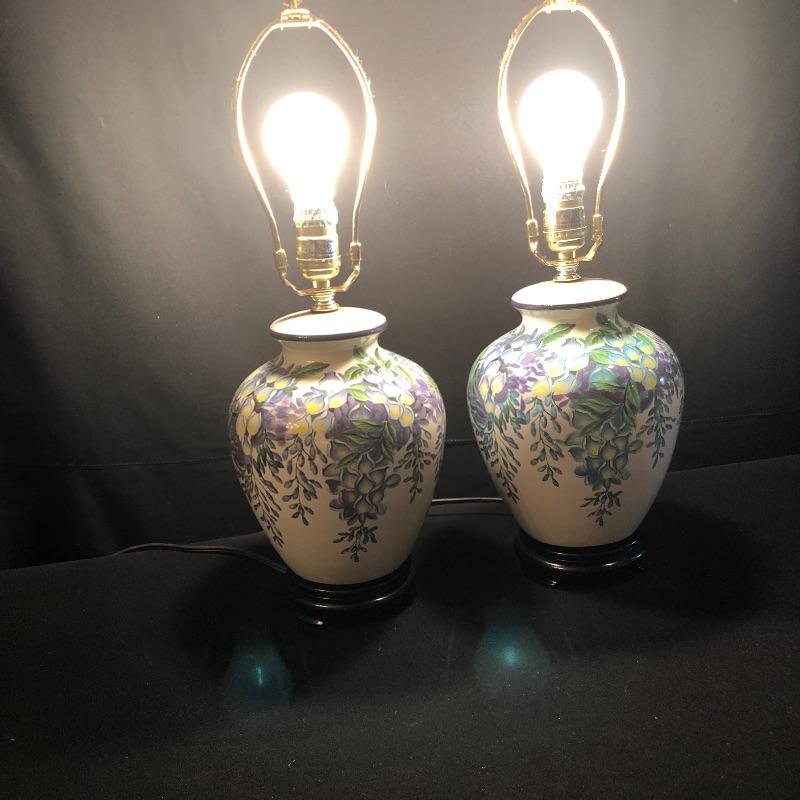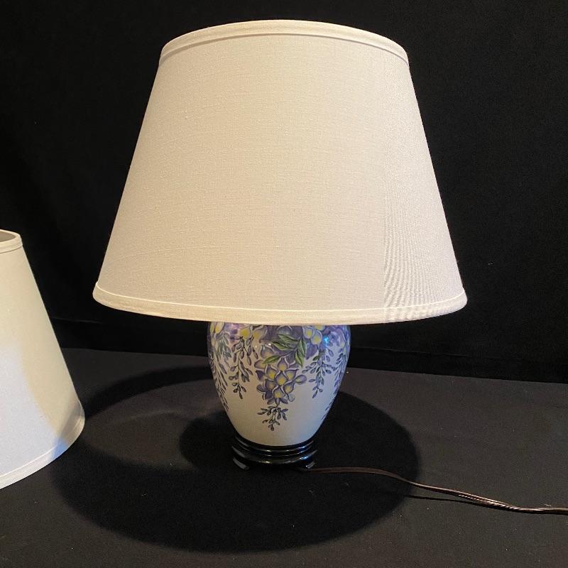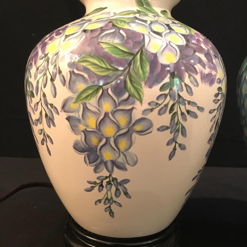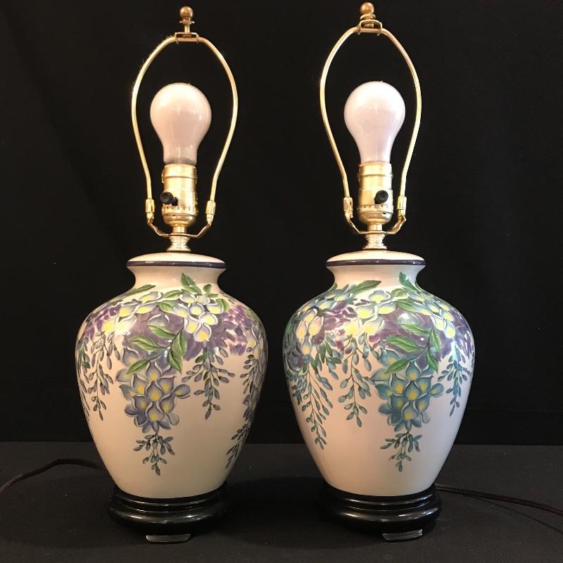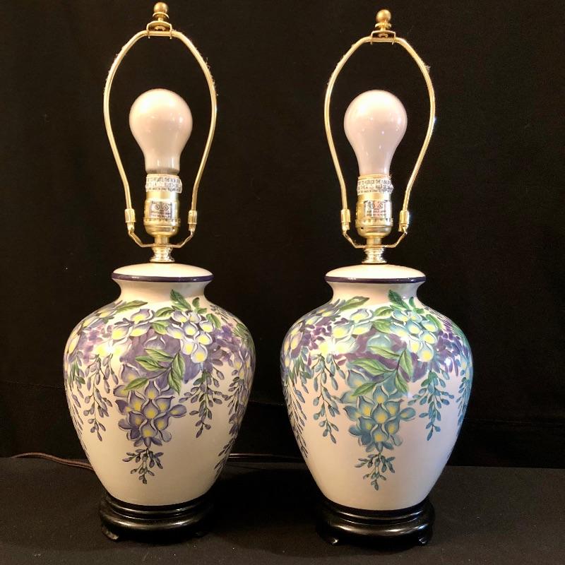 This matching pair of lamps are extremely attractive. Fresh and vibrant, these porcelain lamps have wisteria flower designs over an ivory body and their black resin bases highlight them nicely. Two large light ivory shades accompany the lot. The shades are a bit large for the lamps but can be used with these or other lamps. One has a small mark that may be able to be cleaned. See pix.