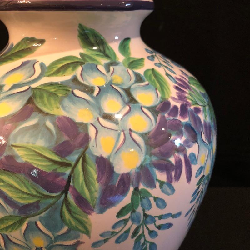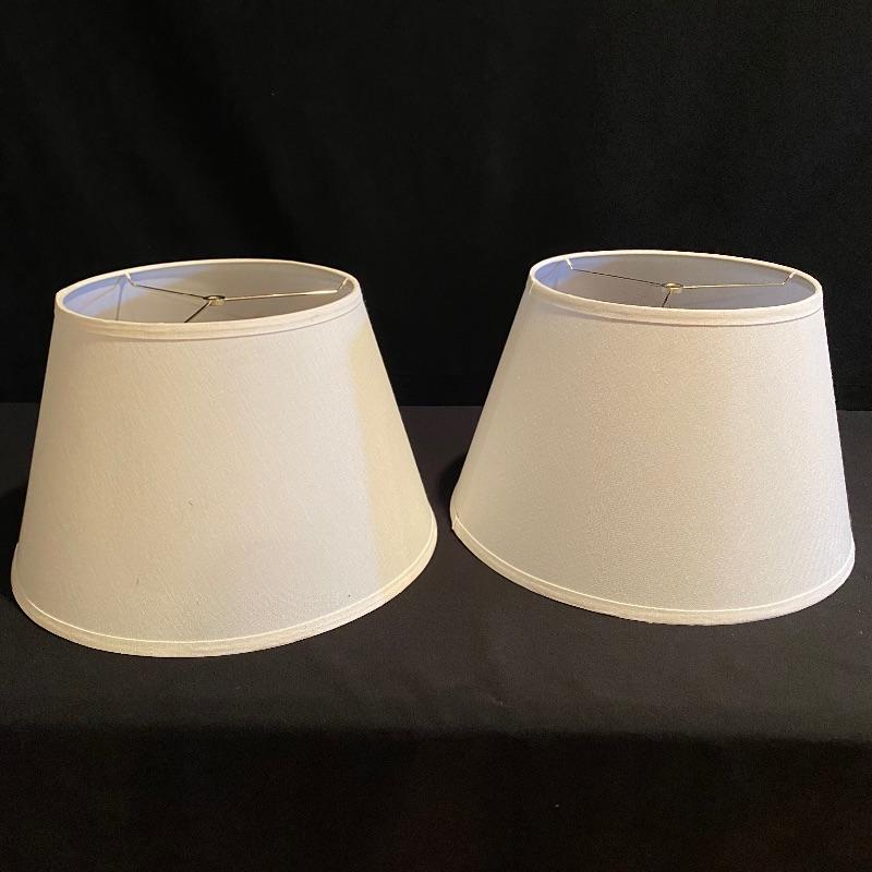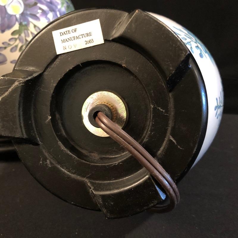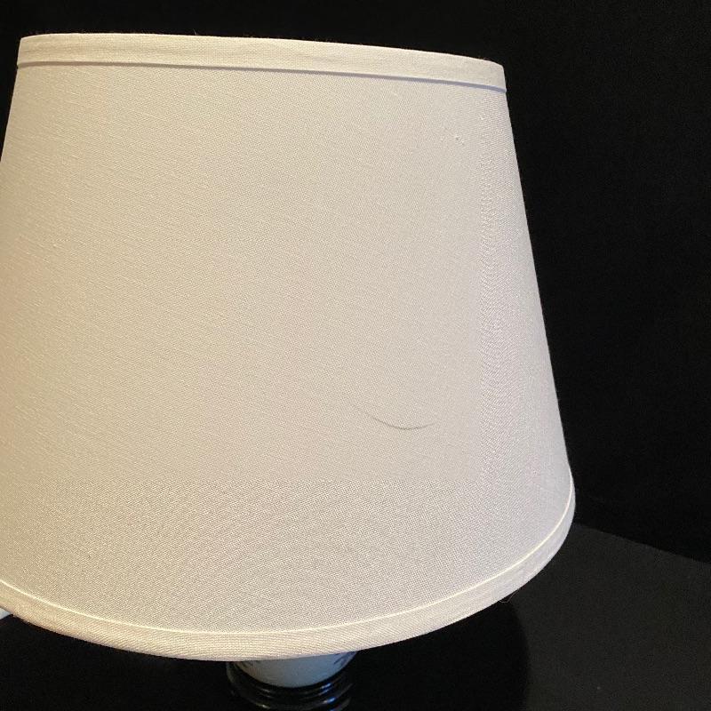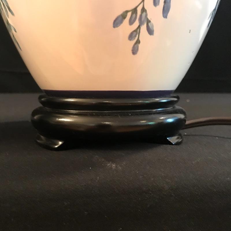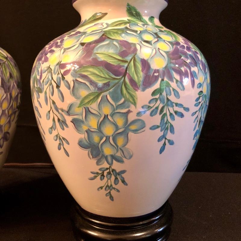This matching pair of lamps are extremely attractive. Fresh and vibrant, these porcelain lamps have wisteria flower designs over an ivory body and their black resin bases highlight them nicely. Two large light ivory shades accompany the lot. The shades are a bit large for the lamps but can be used with these or other lamps. One has a small mark that may be able to be cleaned. See pix.