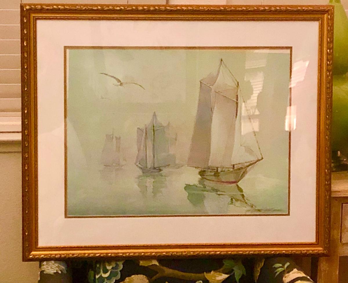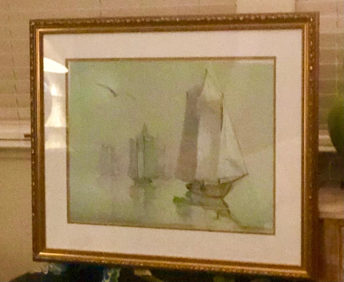 This nicely framed lithograph is on a pale green background with ghost-like sailboats floating. An impressive scale, 26x36” & gold frame make this a showstopper. New-