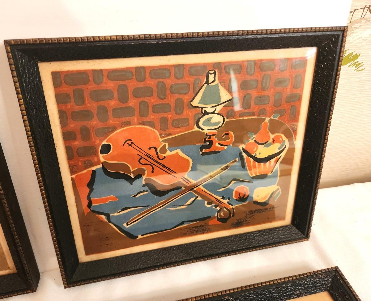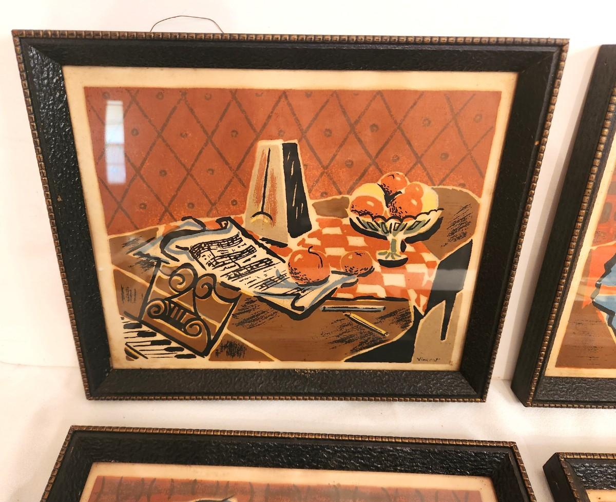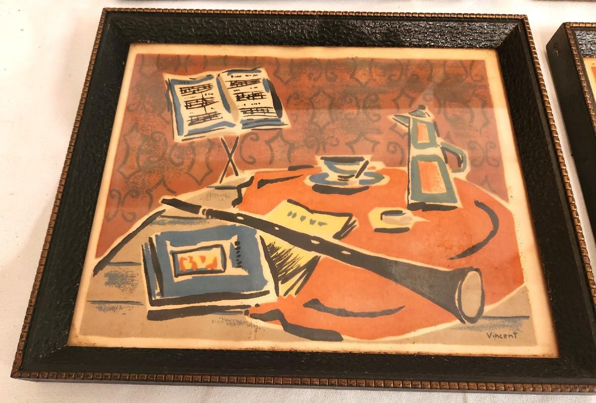 Great set of framed MidCentury Modern Prints - signed "Vincent" - matching frames - musical instrument theme - colors good. Each 12" x 10".