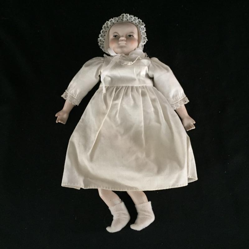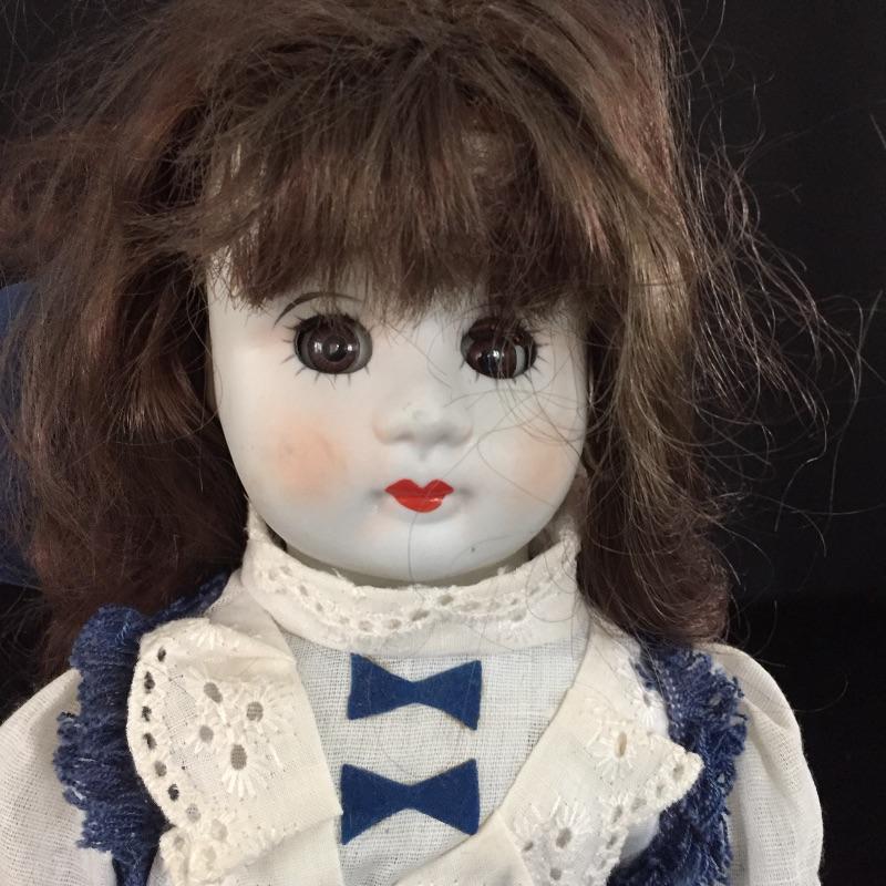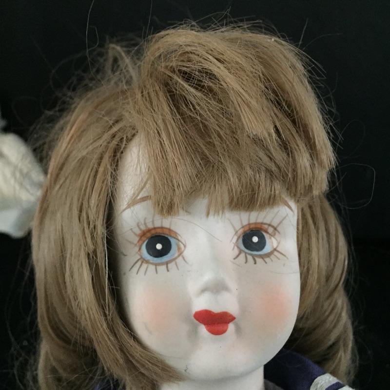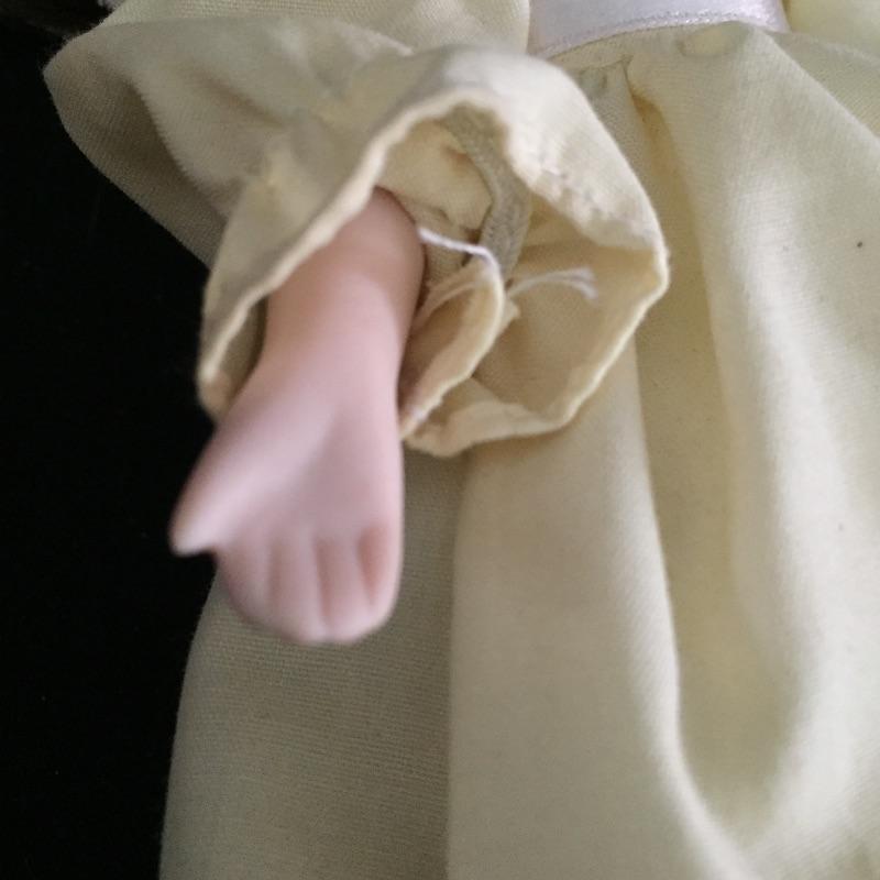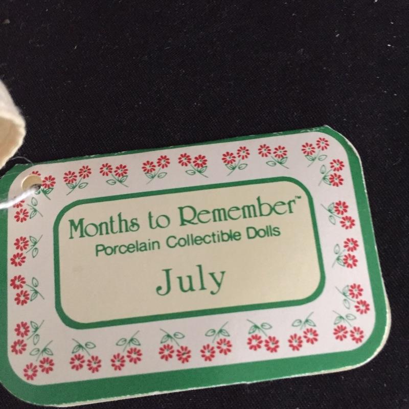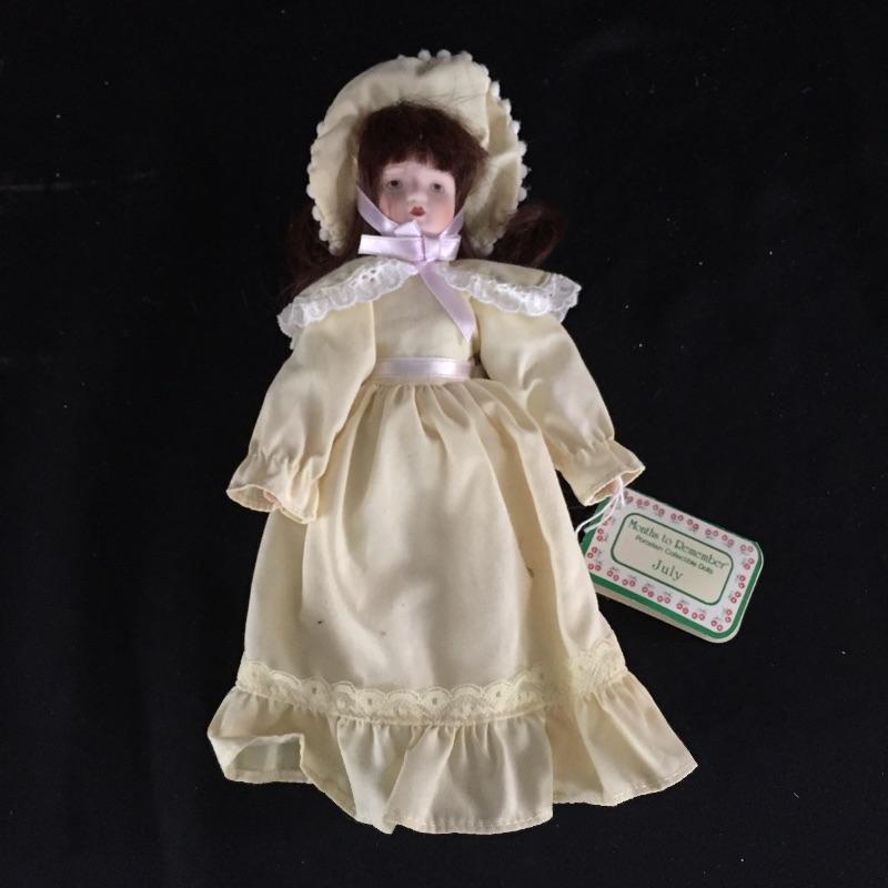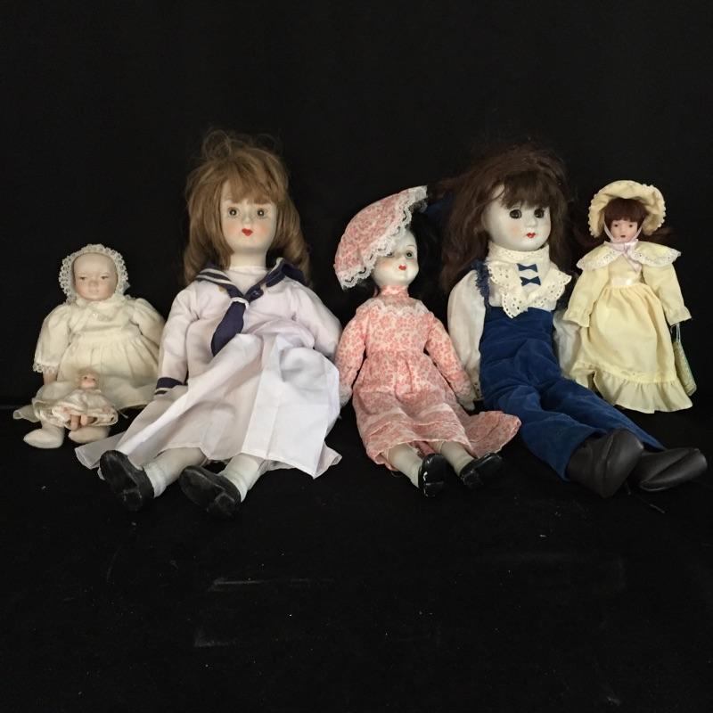 Collection of six porcelain dolls. Start or add to your collection of porcelain dolls. Yellow dressed one has tags of "months to remember". By Russ Largest doll measures 16.5” tall. One doll has broken leg but when put in place is not noticeable (see pix).