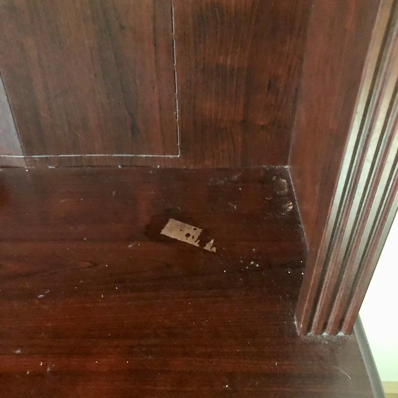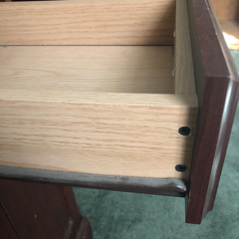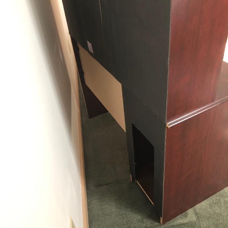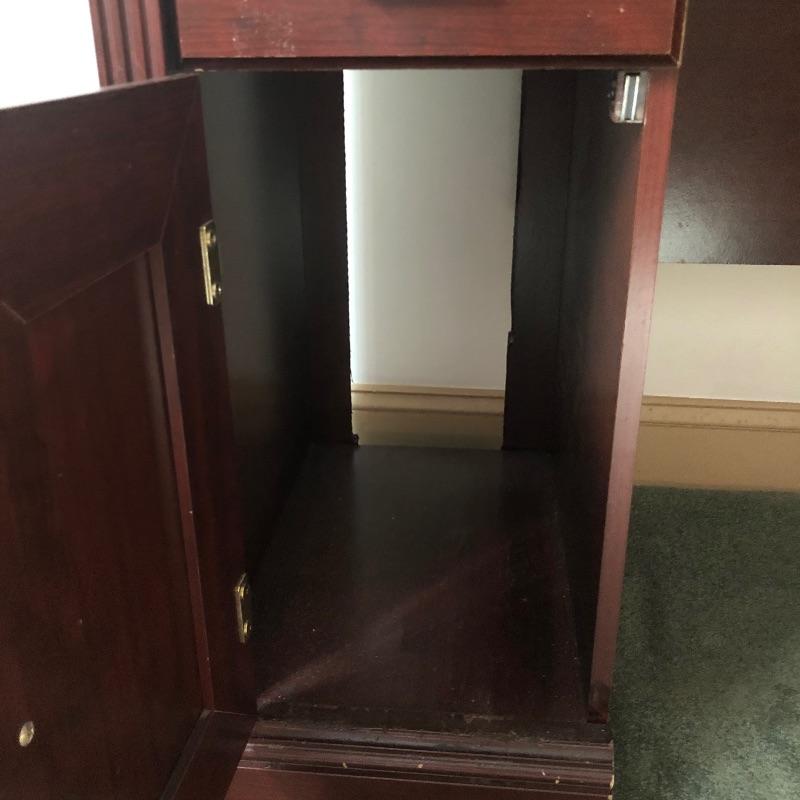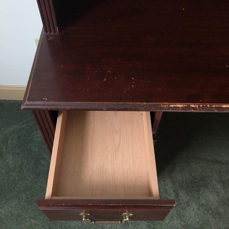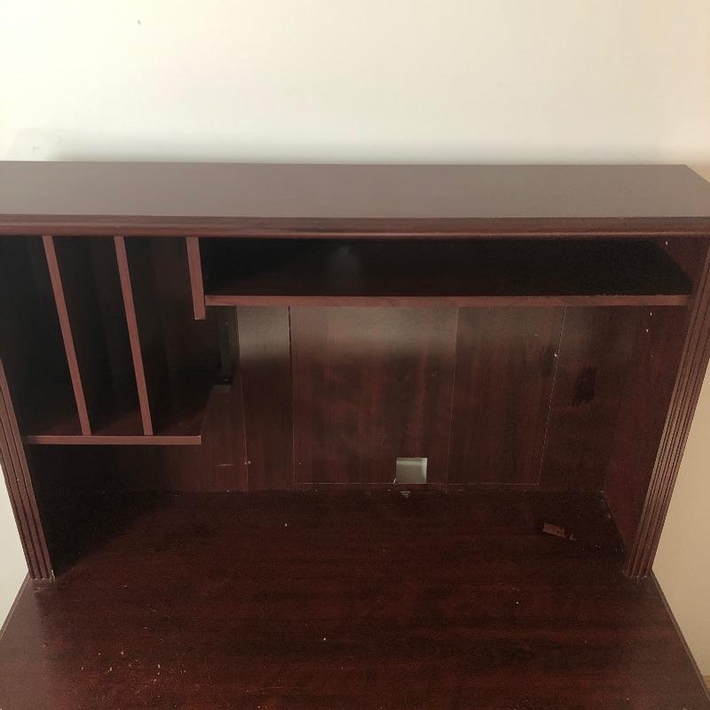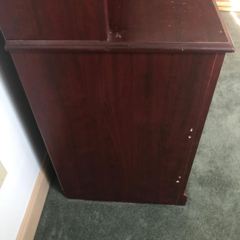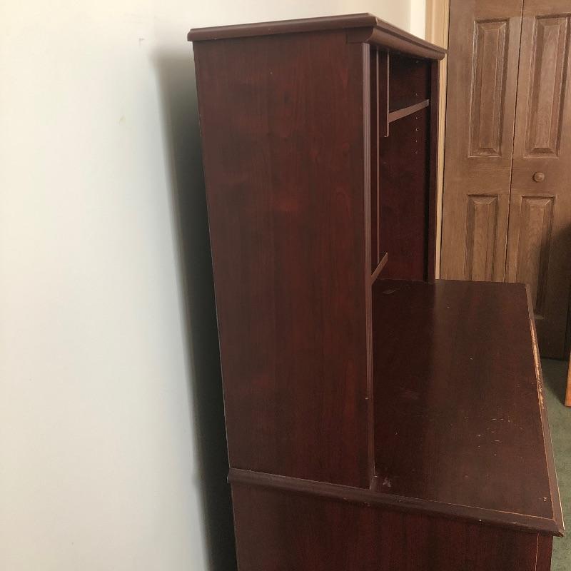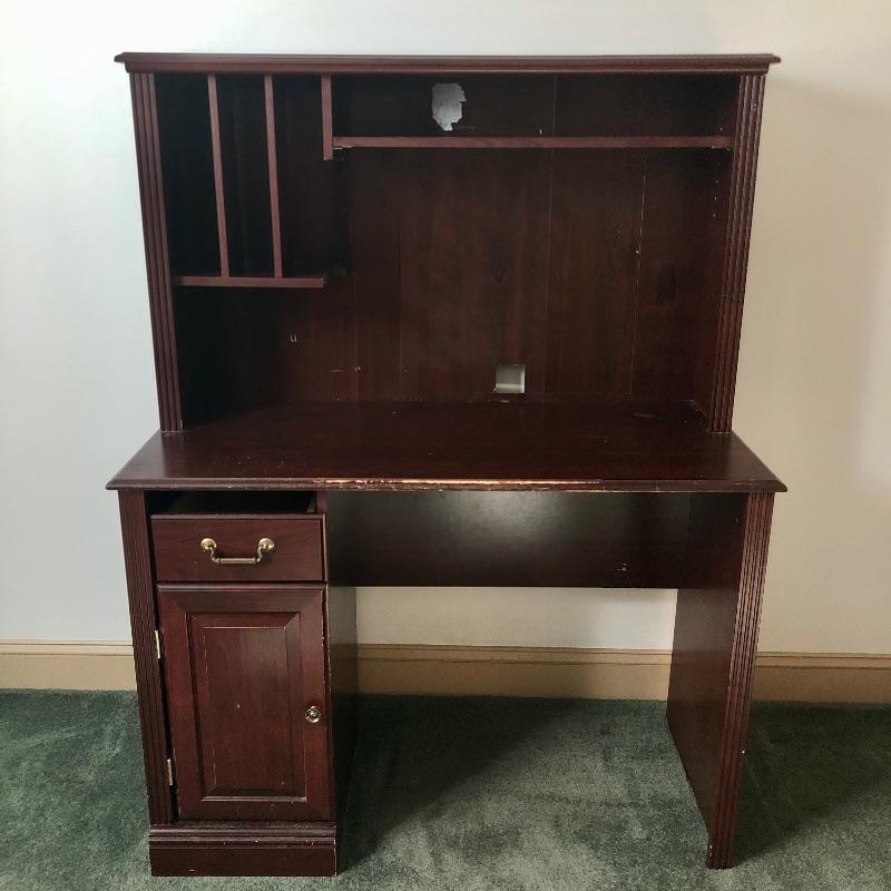 Lot includes a beautiful dark pressed wood desk. This desk is perfect for a home office. It features a drawer, a cabinet, and multiple built in shelves for all your organization needs! The desk has some blemishes, including sticker residue (which should come off with some scrubbing) and some patches where the stain has rubbed off (pictured). Desk measures 44”W x 19.5”D x 56.5”H. Local pickup only.