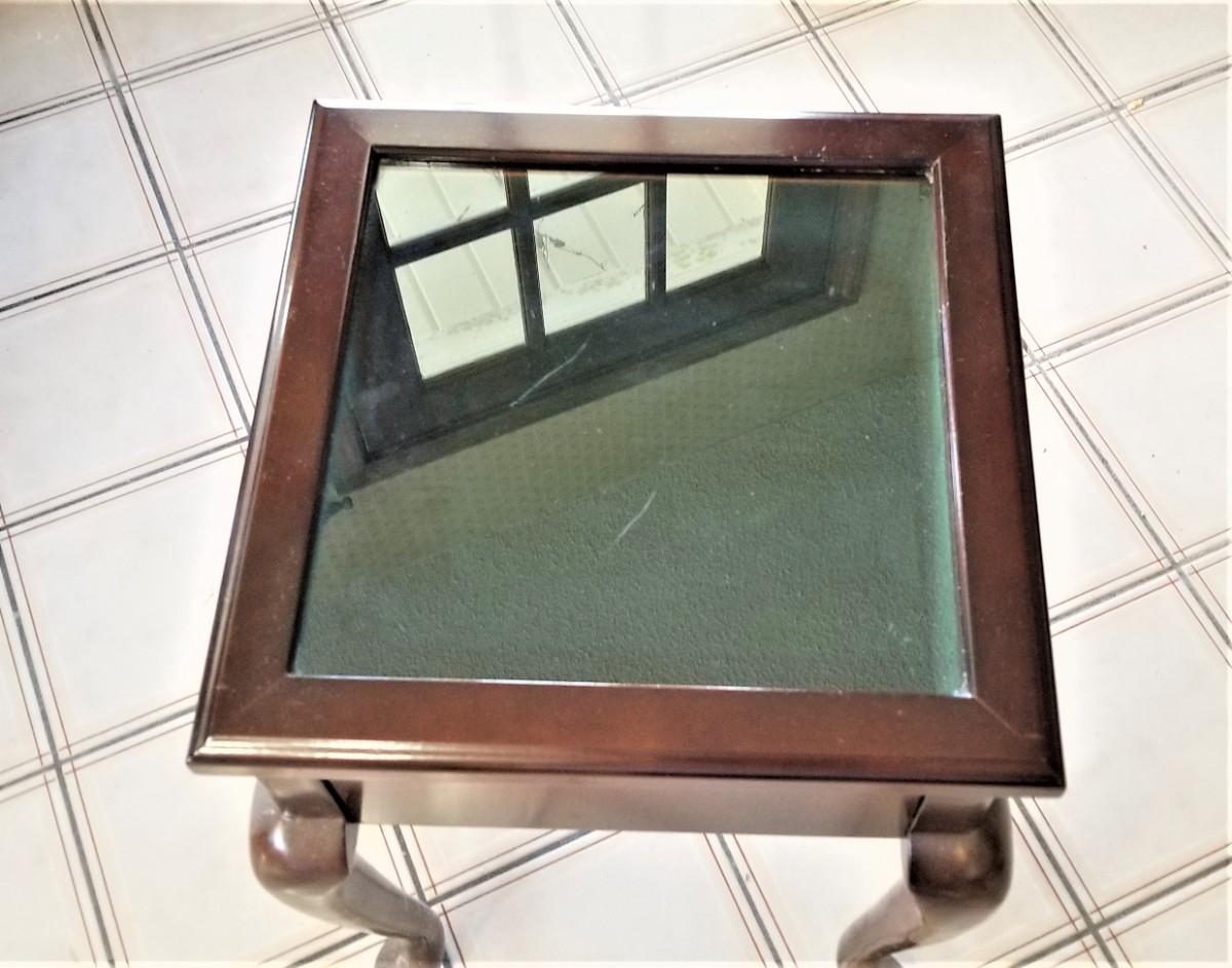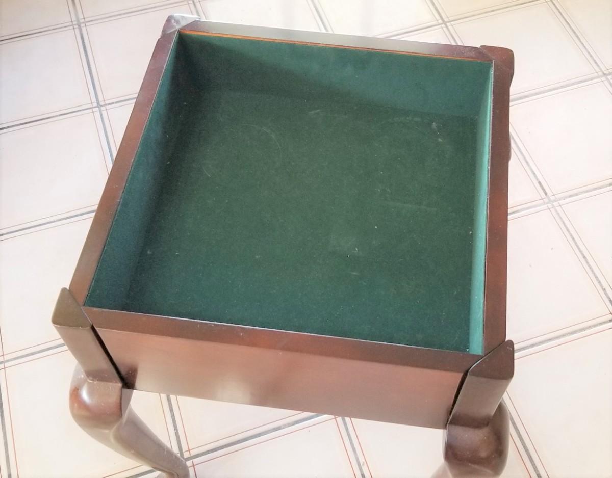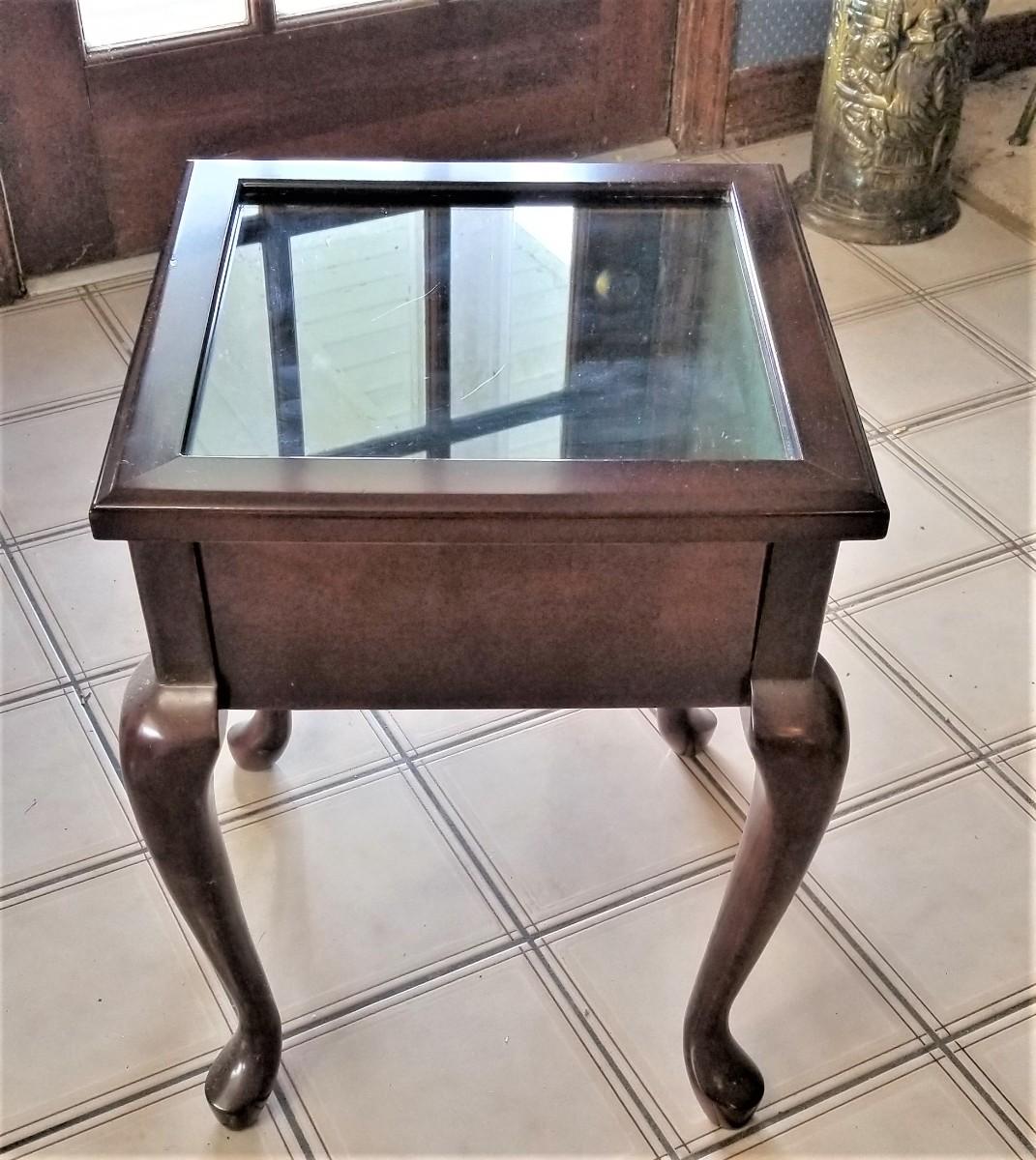 Queen Anne Style display case/table - top lifts off - green velveteen beneath. 18.5" tall, 14" x 14". Good condition.