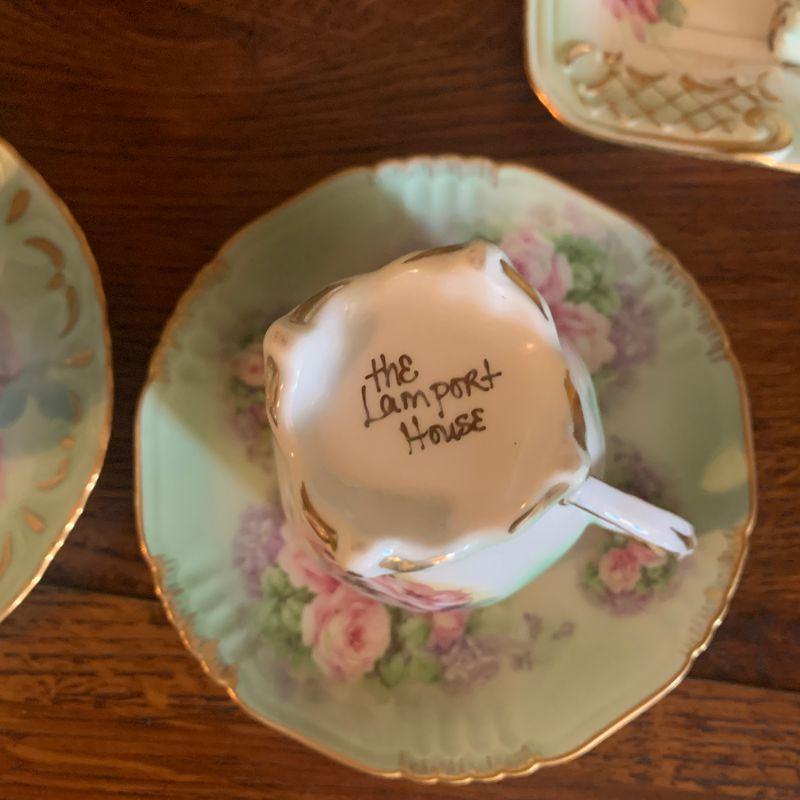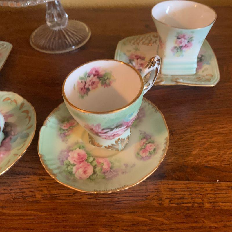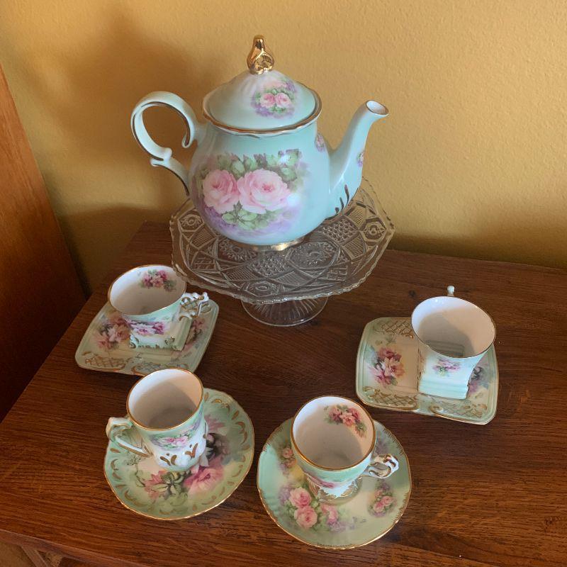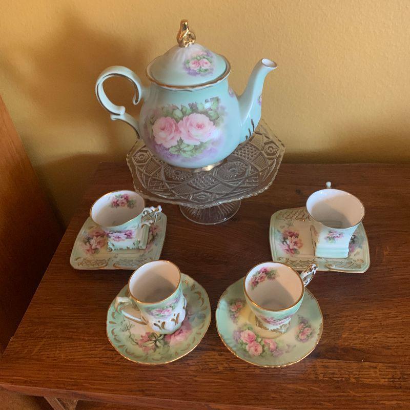 TEAPOT, CAKE STAND CUPS AND SAUCERS