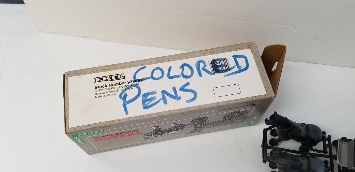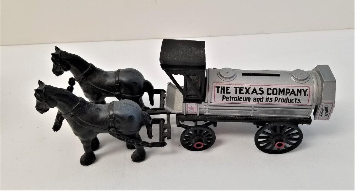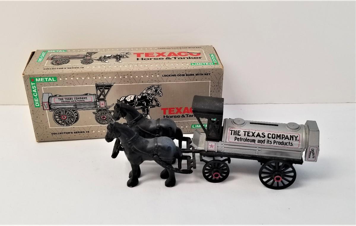 Limited edition from 1991 - Texaco Horse and Tanker bank with box - No key for the bank - alas, someone wrote on the box (as shown), but it is included. Bank in good condition. 9" long. Made by the "Ertl" company.