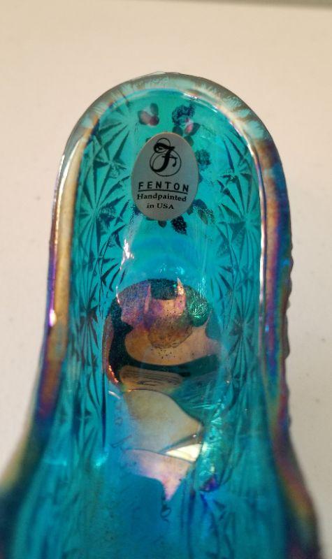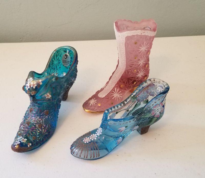 Three hand-painted Fenton glass shoes - all have tags. Largest is 6" long, boot is 4" tall. All in very good condition.