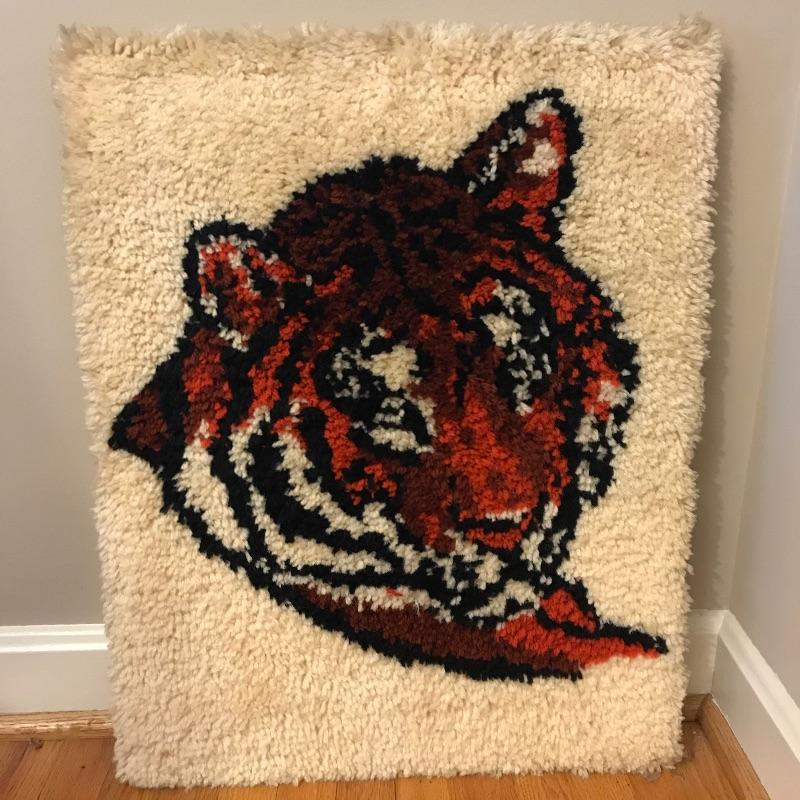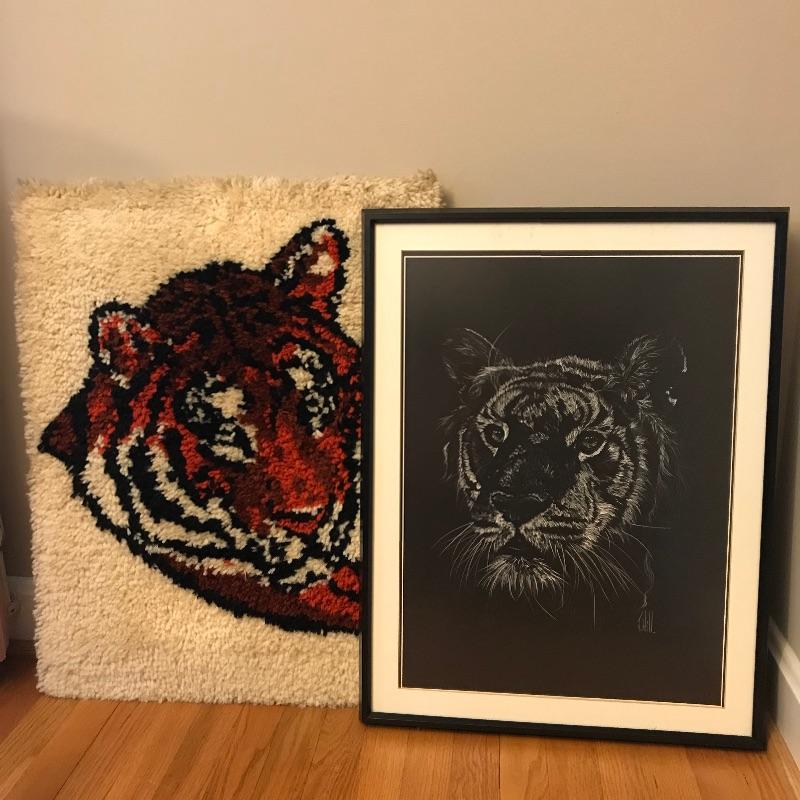 Well, isn’t this an appropriate time to display some tiger art in your home or office? Whether you’ve binged on Tiger King or just a tiger fan we’ve got you covered! The first art is signed and matted with what appears to be a low glare glass. There is a little discoloring on the matte near the top, see photos. The frame is approximately 20” x 26”. The second appears to be a handmade cross stitch yarn art on a wooden board. This stunning piece has a little discoloring on the edges that appears to be dust. Piece measures 21.5” x 27”. Both are ready to be display on your wall. Shipping available. Please call UPS with dimensions at 828-252-6930 for a shipping quote prior to bidding.
