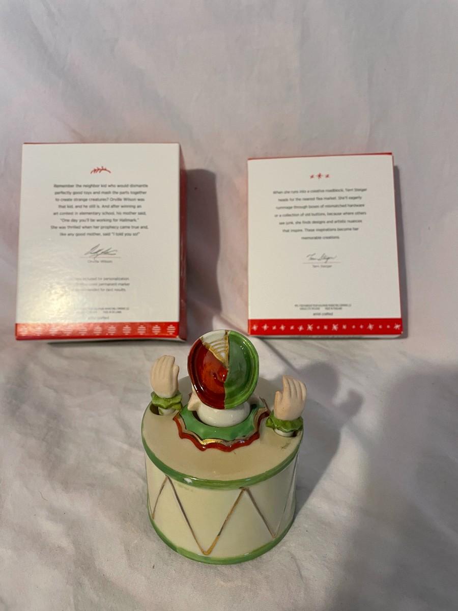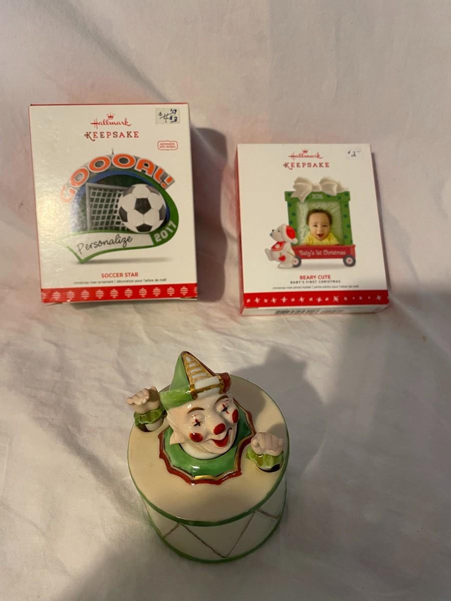 LOT 29 TWO HALLMARK ORNAMENTS AND A CLOWN IN A DRUM