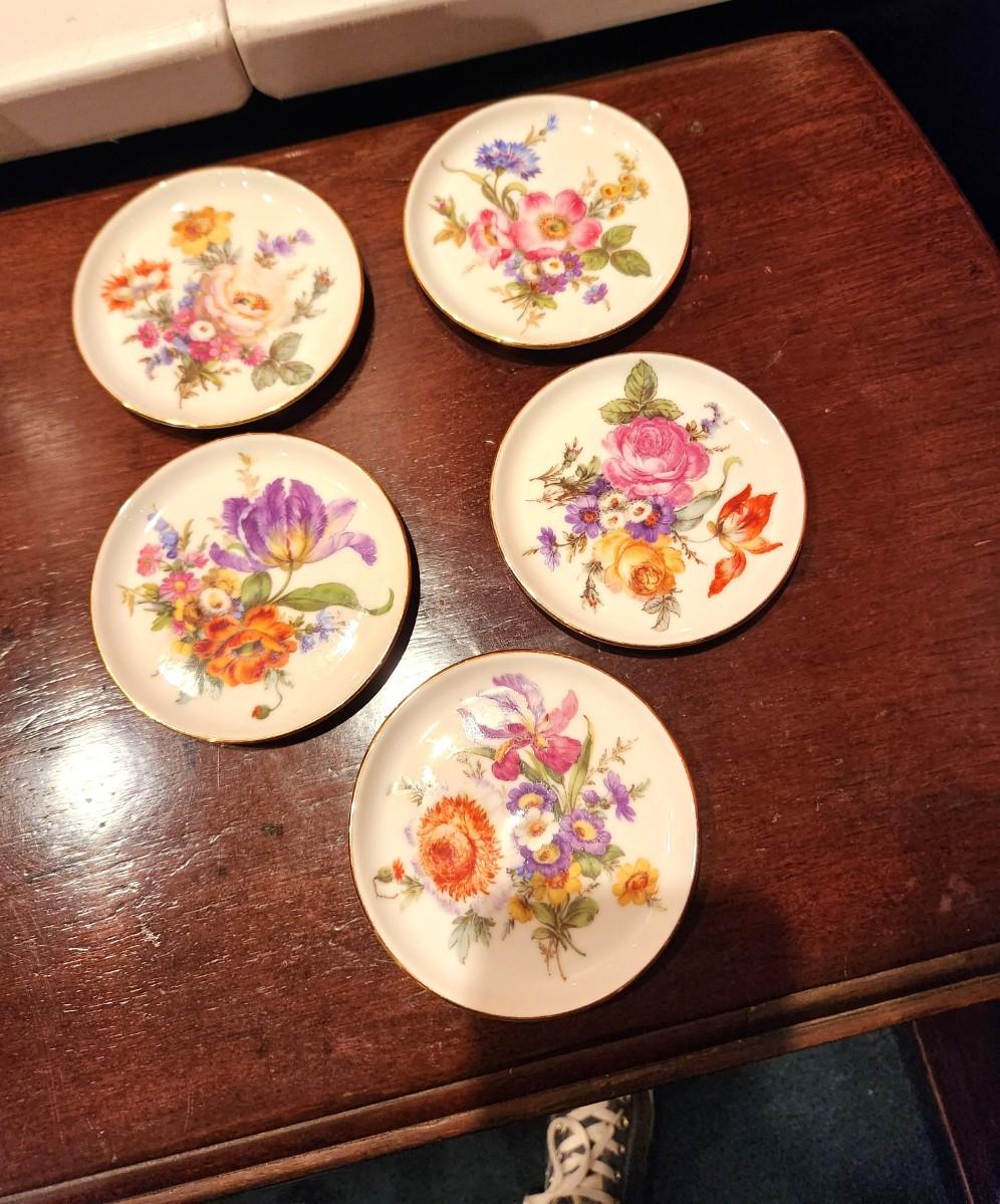 Set of 5 vintage 1960's hand painted trinket dishes, each 4" across - Mark on reverse. Good condition - pretty floral motif. These could also be used as coasters.