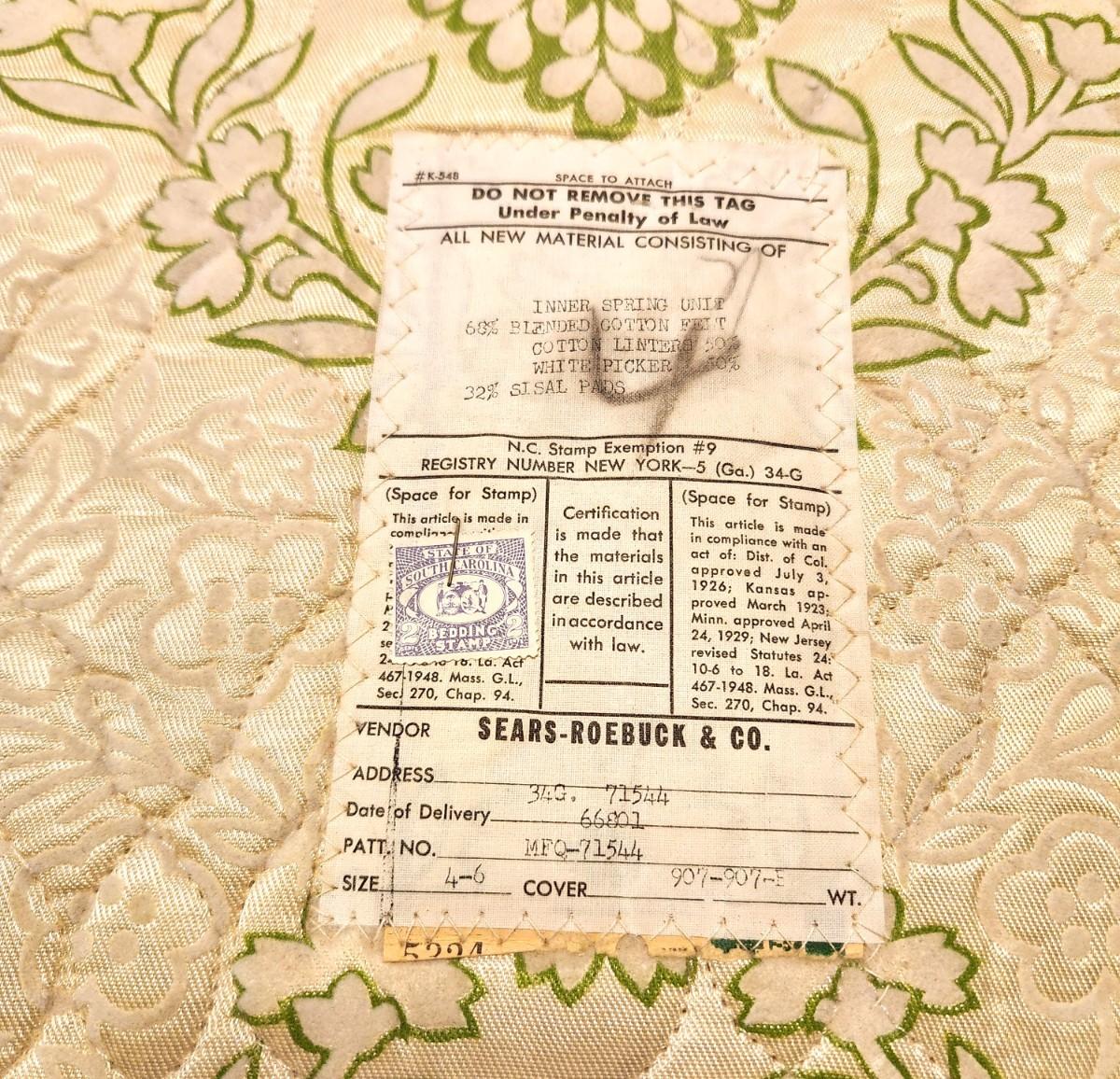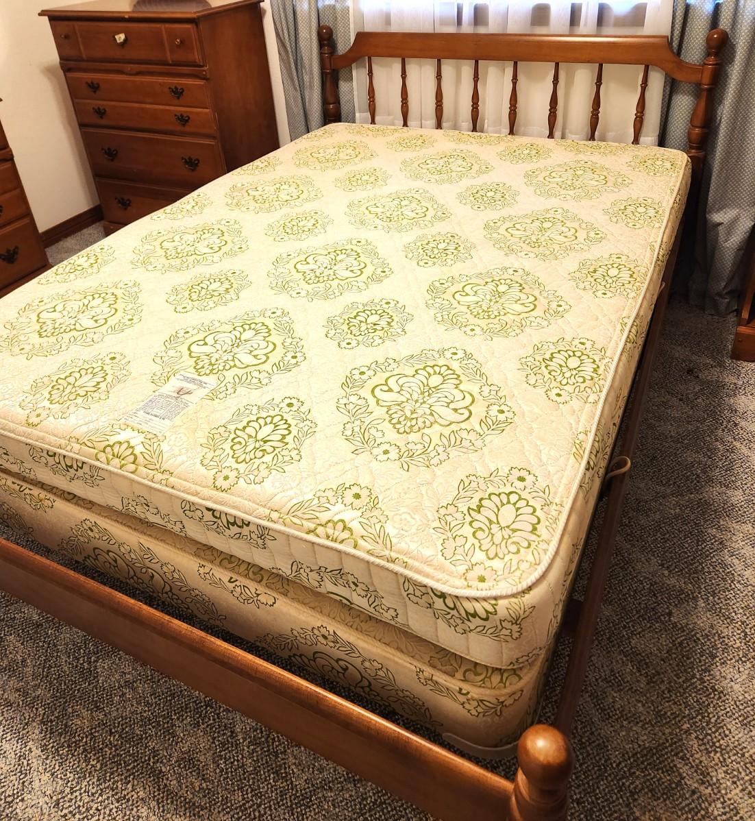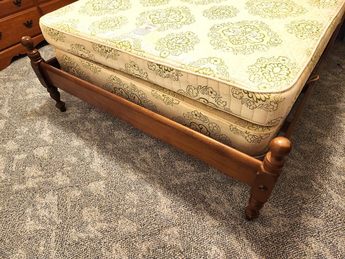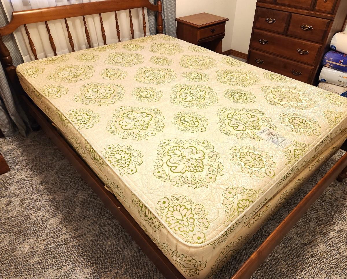 Sears brand mattress/box springs - vintage Mid Century Colonial style double/full bed. 81.5" long, Foot board 56.5" across, headboard 3 ft tall. Vintage condition. You can leave the mattress/box spring if you wish and just take the headboard, footboard, and frame, or you can take it all. It's up to you. Vintage/used condition.