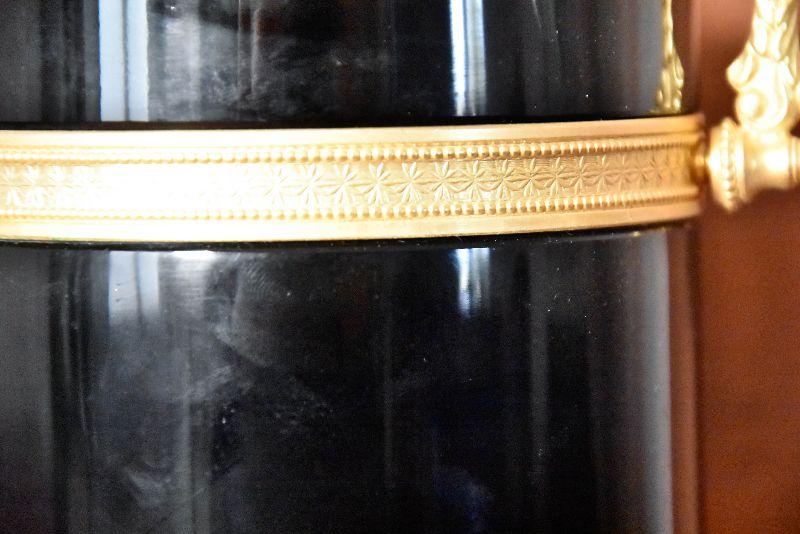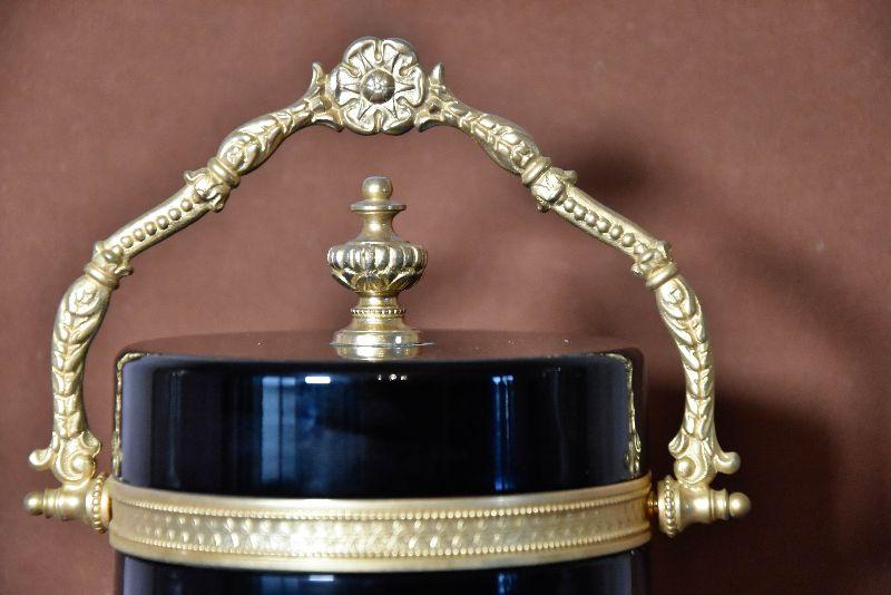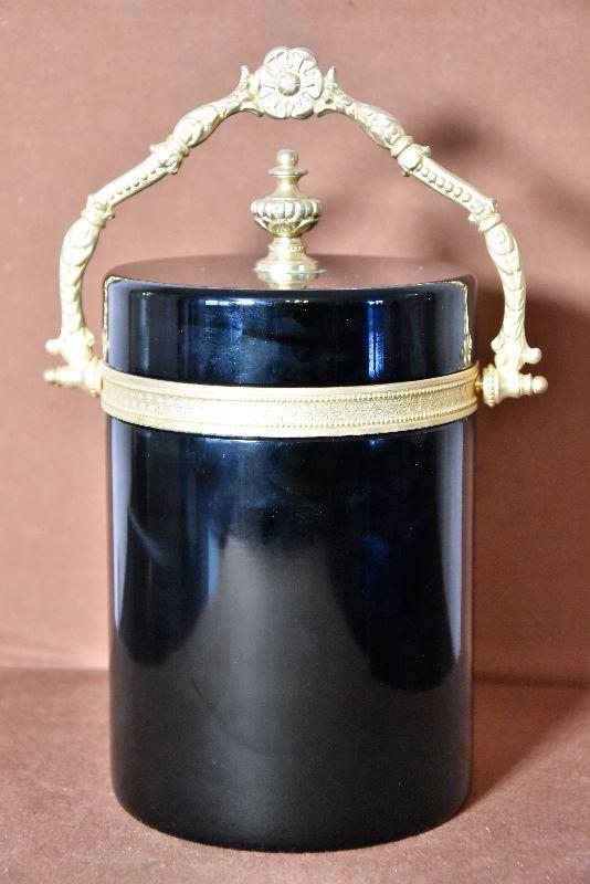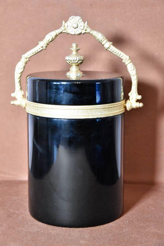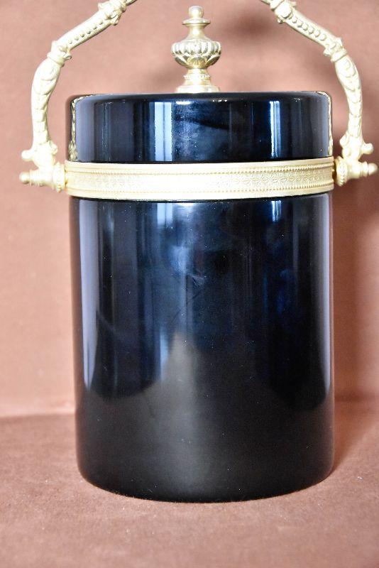 Vintage Italian Murano Black Art Glass Casket Box with Dore Bronze Mounts and Fancy Handle. Beautiful Black Opaline Glass and Large Size. Slight scuffing of the bottom that is indicative of the age.