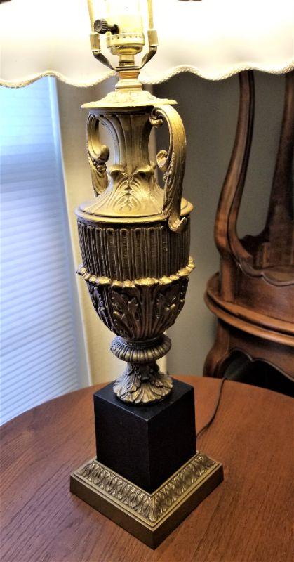 Nice vintage table lamp (metal) in a classic "urn" style. Works. Good condition. 33" tall.