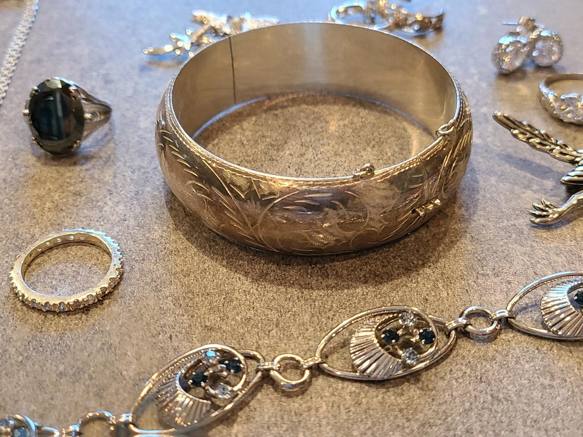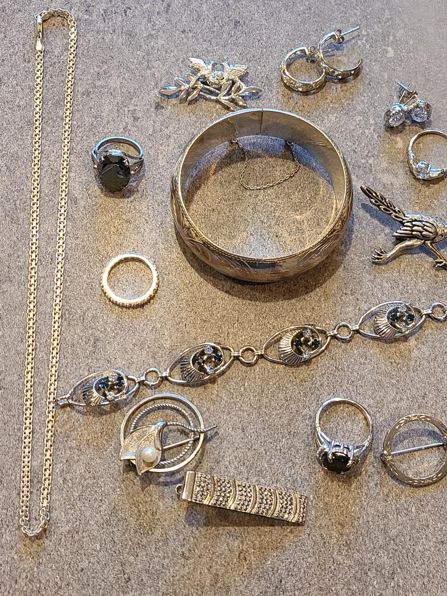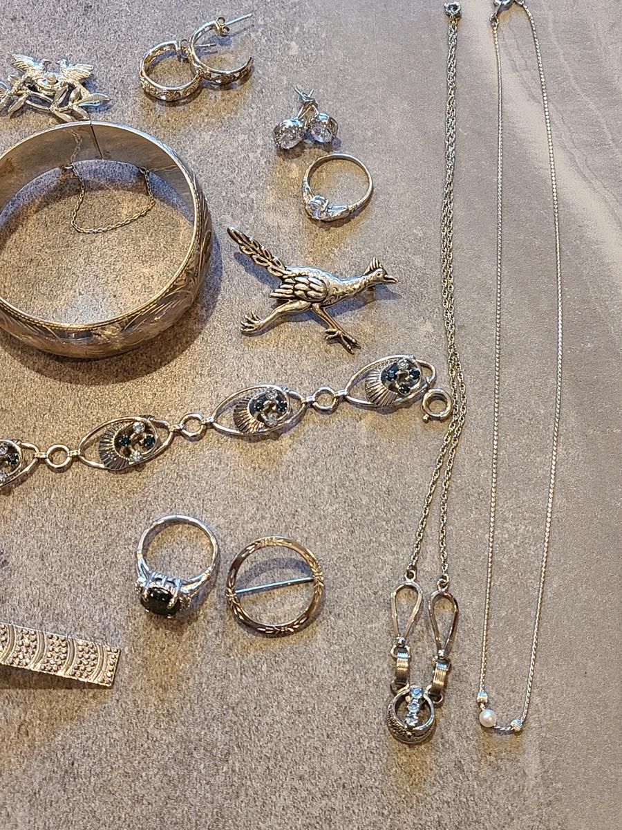 Lot 29: Vintage Sterling Silver Cuff Bracelet, Tie Clip, Rings and More