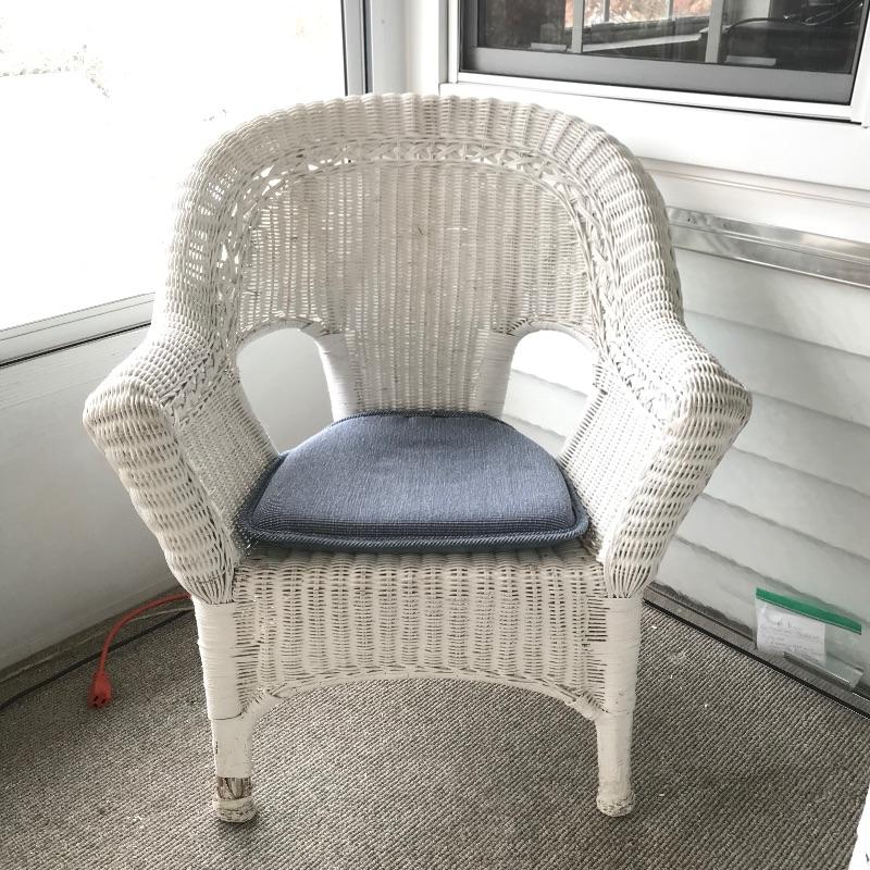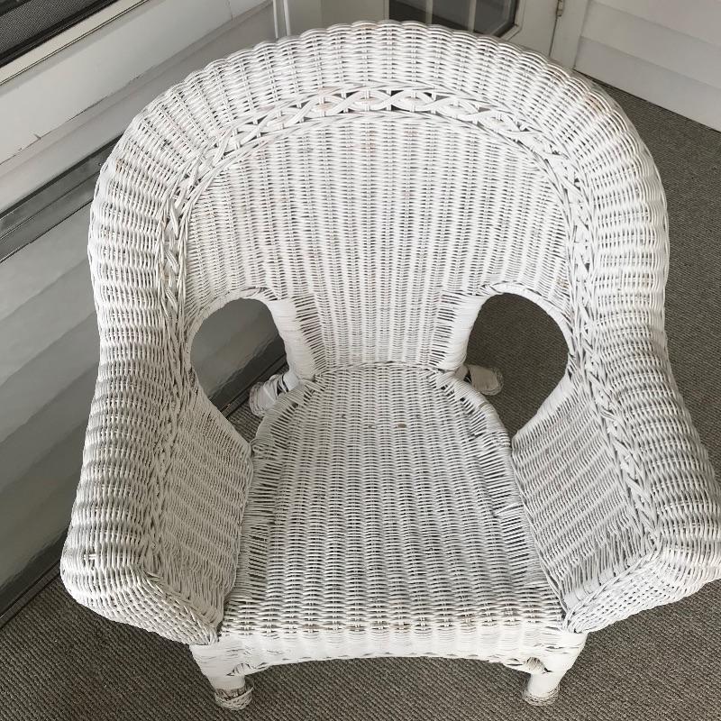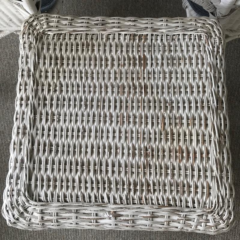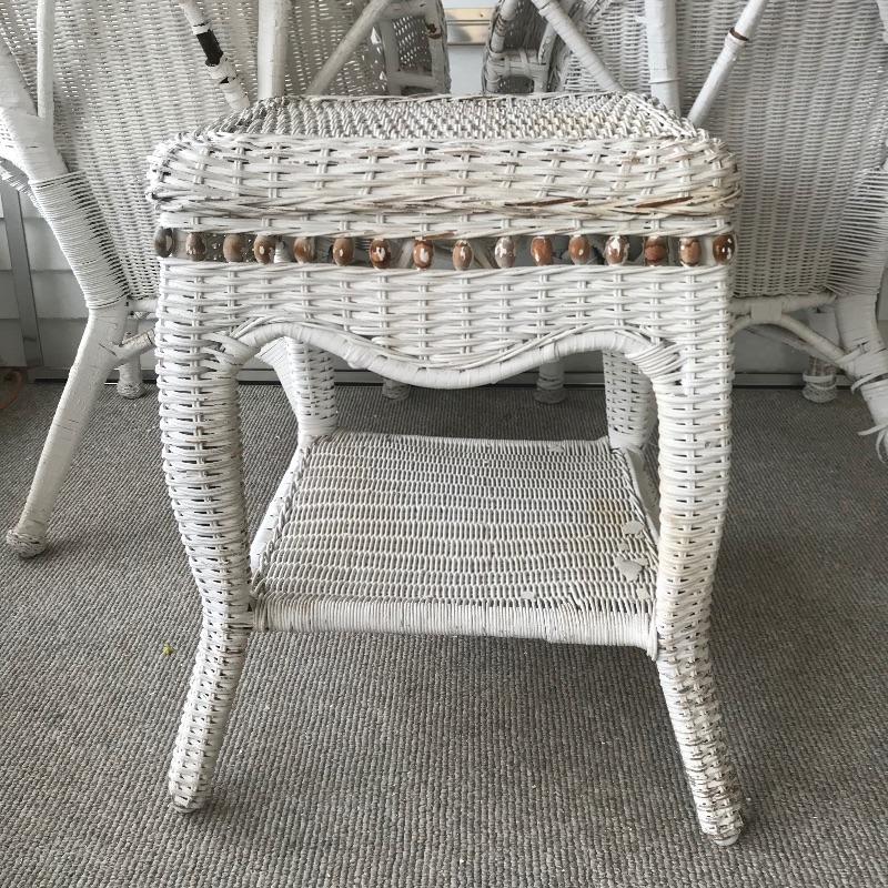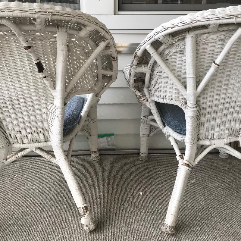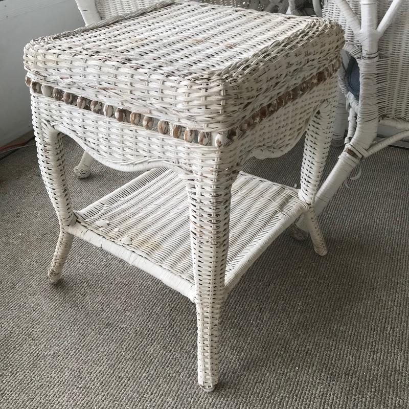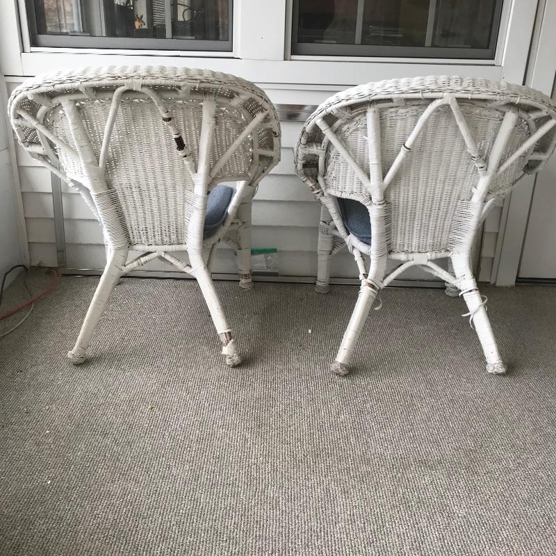Charming white shabby chic painted wicker patio set including two matching chairs and a 2’ tall table with wood accents. Chairs are comfortable and each have a denim blue colored non-slip cushion. Chairs and table need some refurbishing in spots, but they are sturdy. Chairs measure approximately 29” x 21” x 33”, table measures approximately 17.5”sq x 24”. See photos. No shipping.
