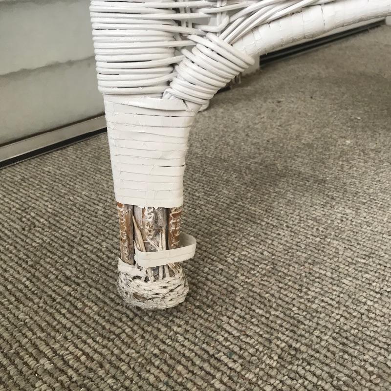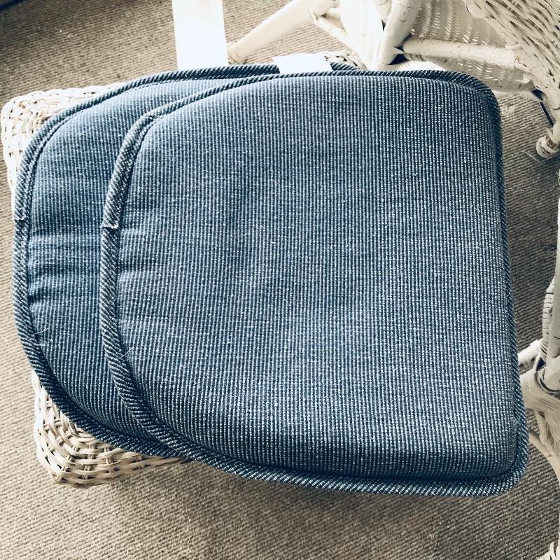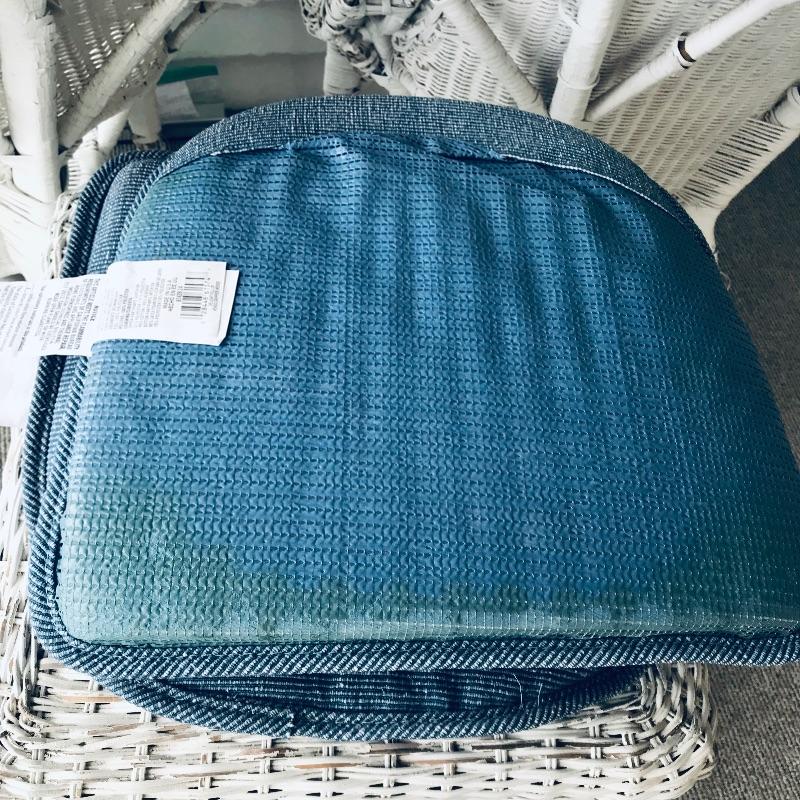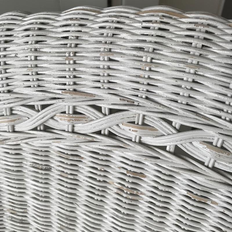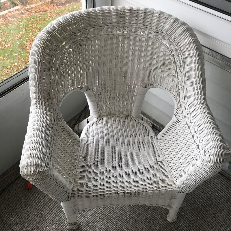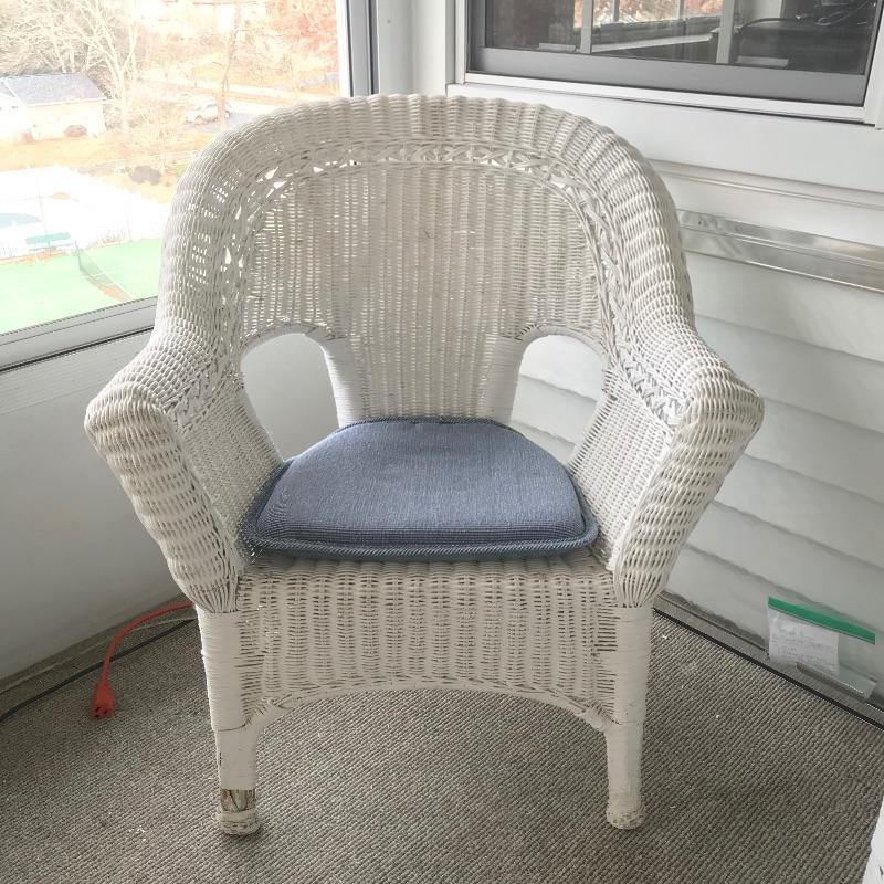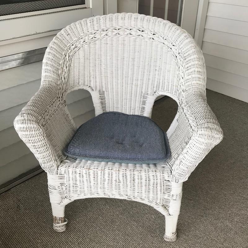 Charming white shabby chic painted wicker patio set including two matching chairs and a 2’ tall table with wood accents. Chairs are comfortable and each have a denim blue colored non-slip cushion. Chairs and table need some refurbishing in spots, but they are sturdy. Chairs measure approximately 29” x 21” x 33”, table measures approximately 17.5”sq x 24”. See photos. No shipping.