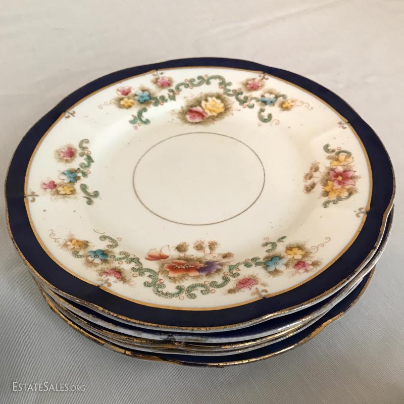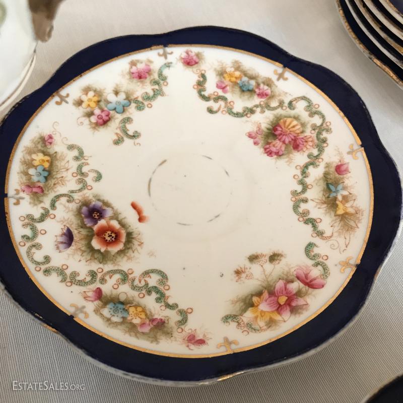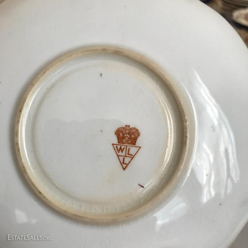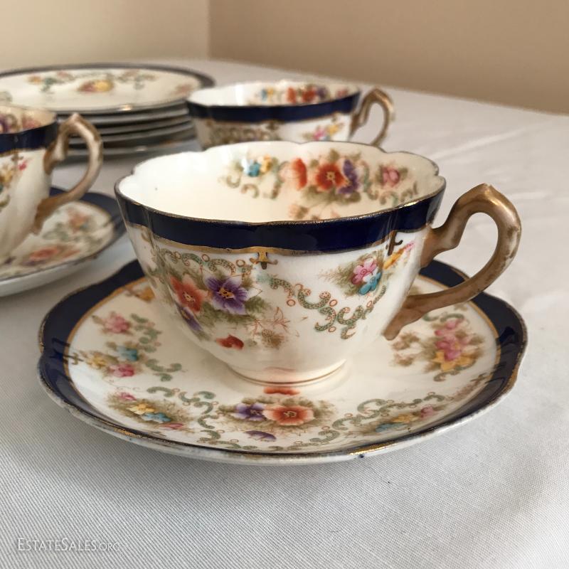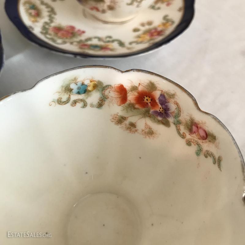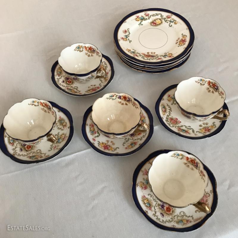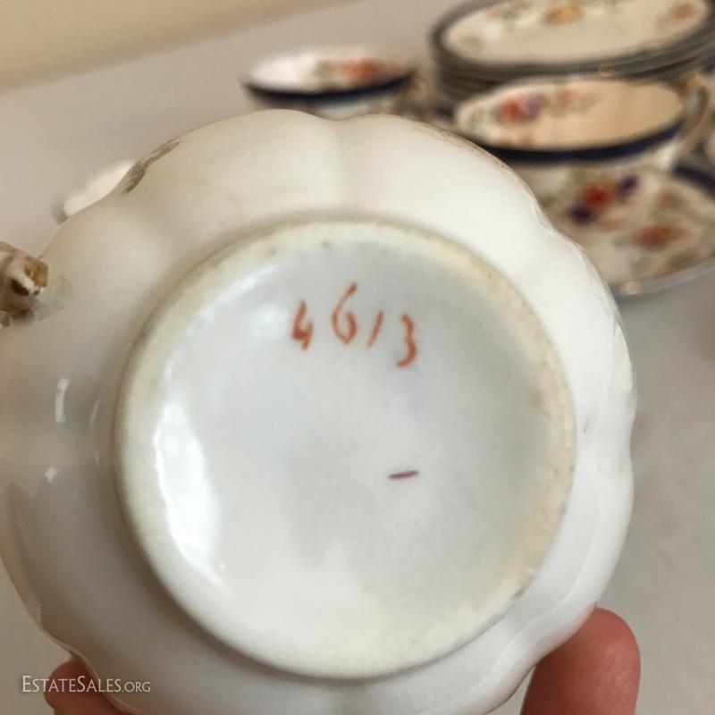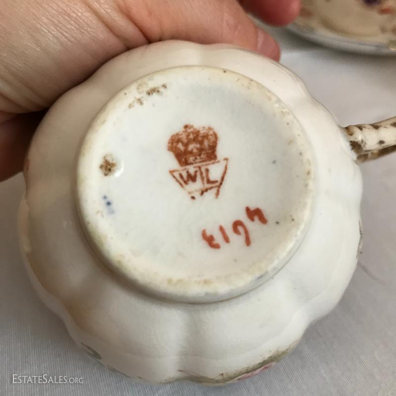 William Lowe china set includes 5 cups and saucers and 5 small plates. One cup has broken piece that was glued back on. Number on bottom is 4613.