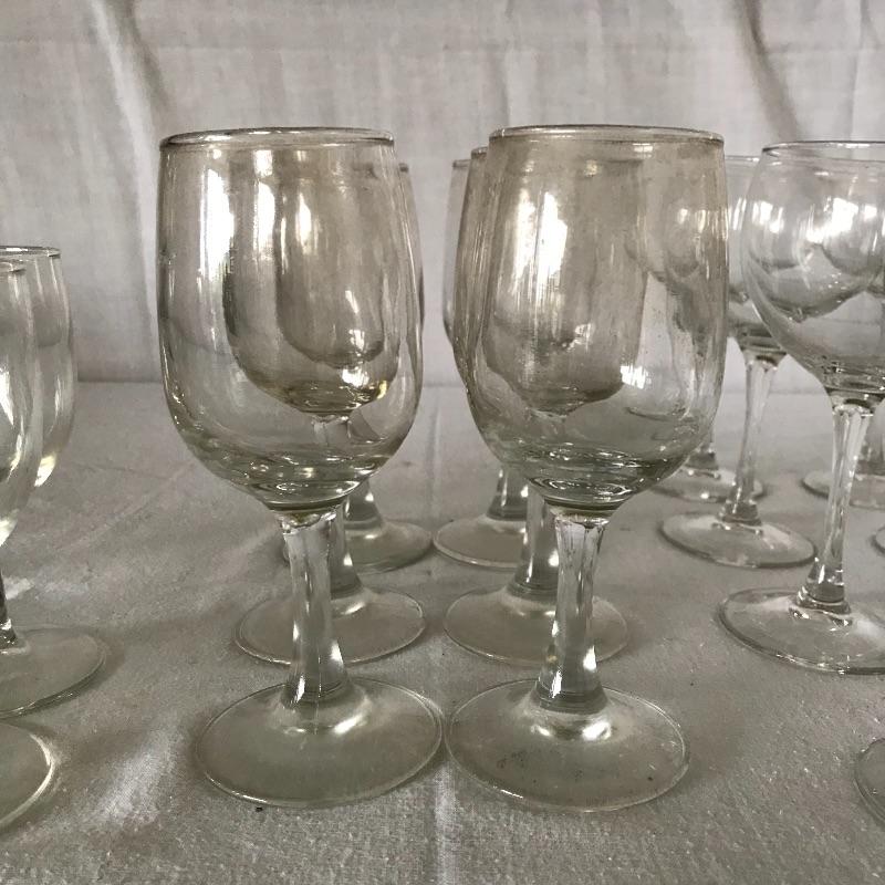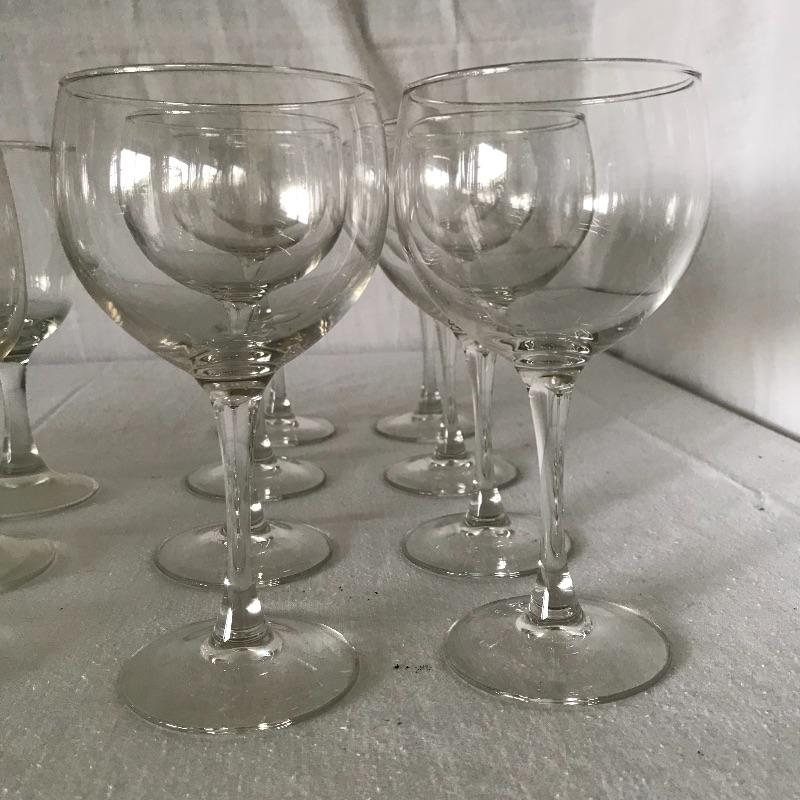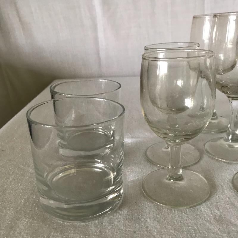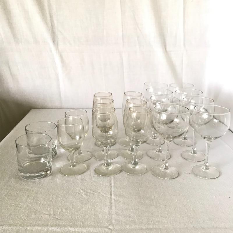 This lot is a great household size or perfect for your rental. Two classic rocks glasses with two small stemmed glasses. Lot also includes six white and eight red wine glasses perfect for parties of any style. The largest wine glasses are 6.5” tall. See photos. Local Pickup Only.