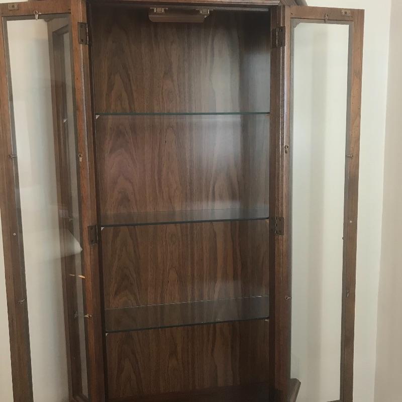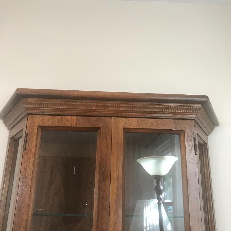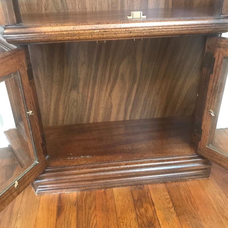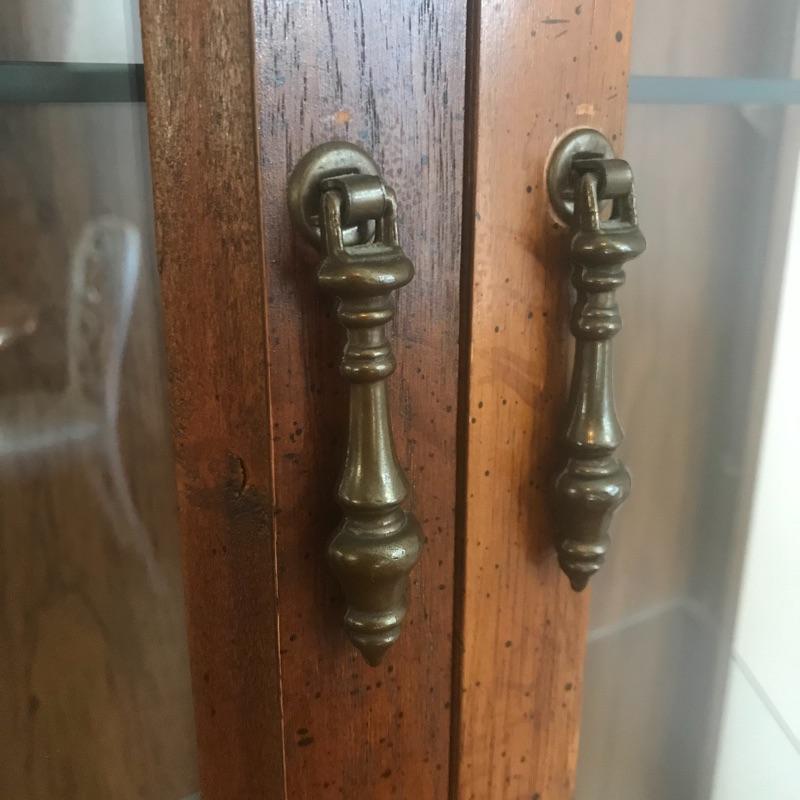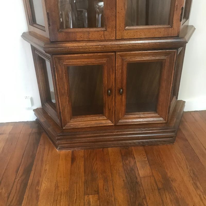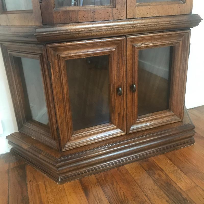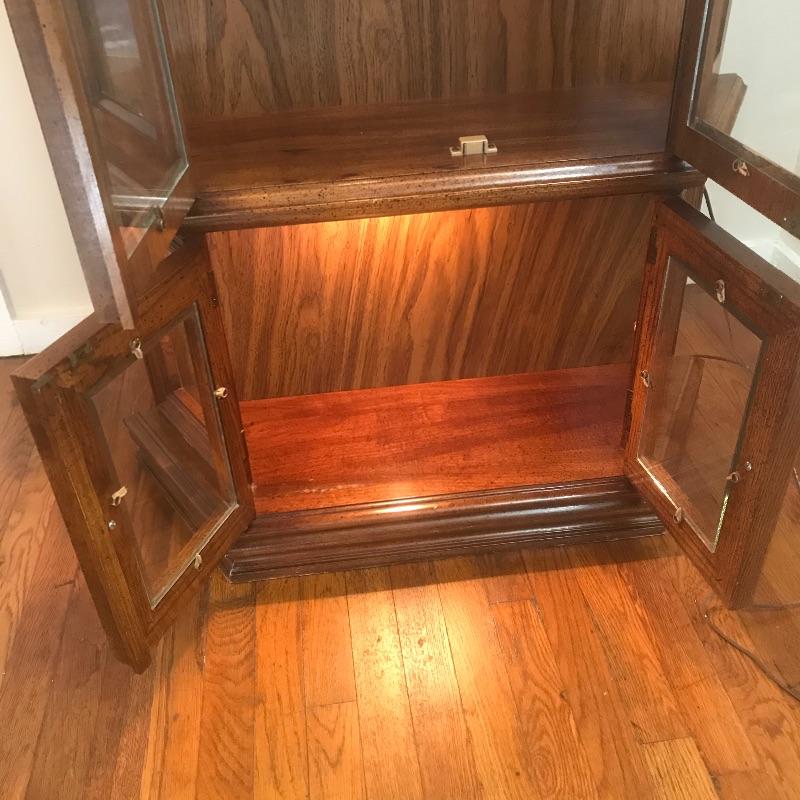 This is quite a statement. Beautiful wood grain with black splatter design and carved border just above the glass doors. Piece lights up on the top cabinet along with the bottom, they each have their own electrical cord. Lovely metal pulls with vintage design and metal hinges. The upper cabinet has three smooth glass shelves that do not adjust in height placement, nor do they have plate grooves. Very little wear is seen, mostly on the very bottom. Piece appears as solid wood with a particle board back, but we cannot verify. Curio measures approximately 35” x 12” x 71” and comes with three light bulbs, only two were tested and they worked fine. Please bring help to load as piece is substantial. Local pick up only.