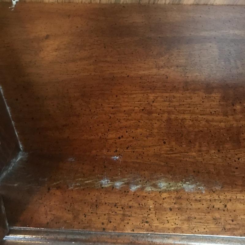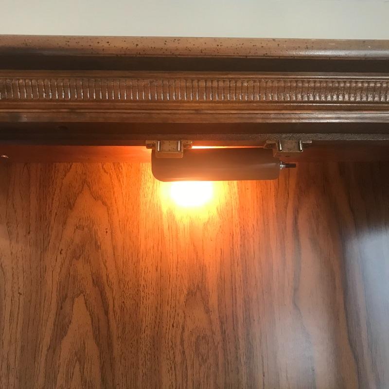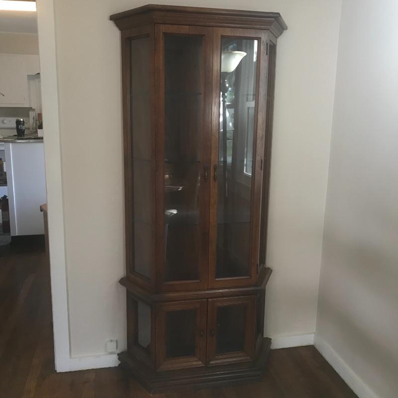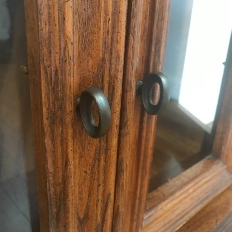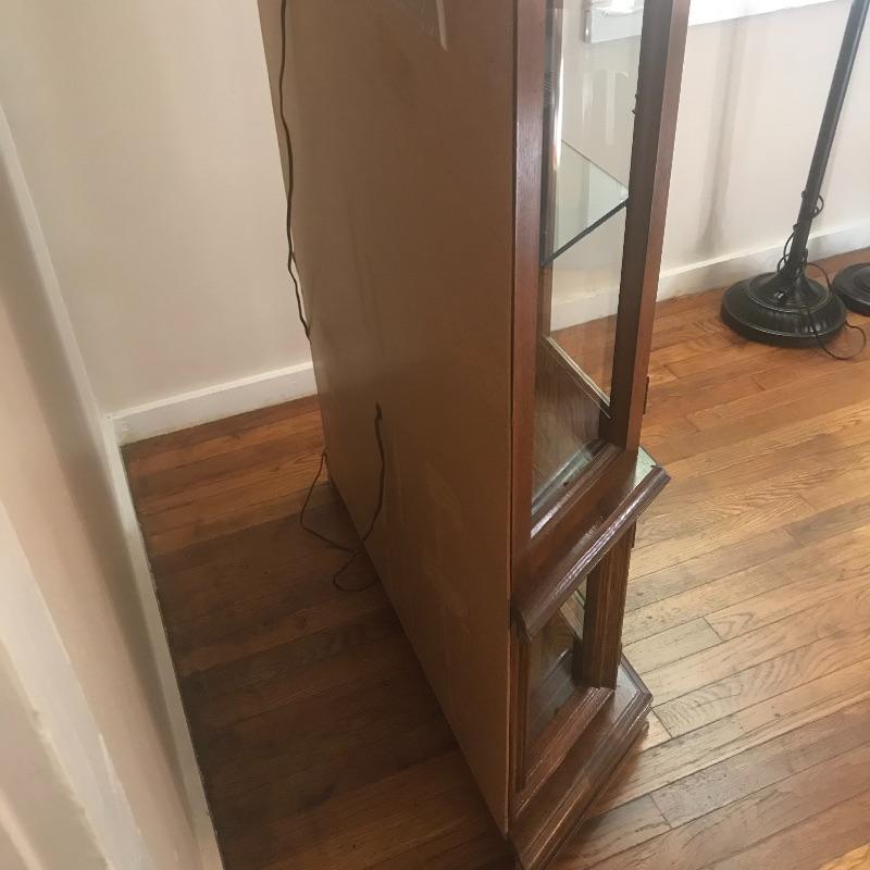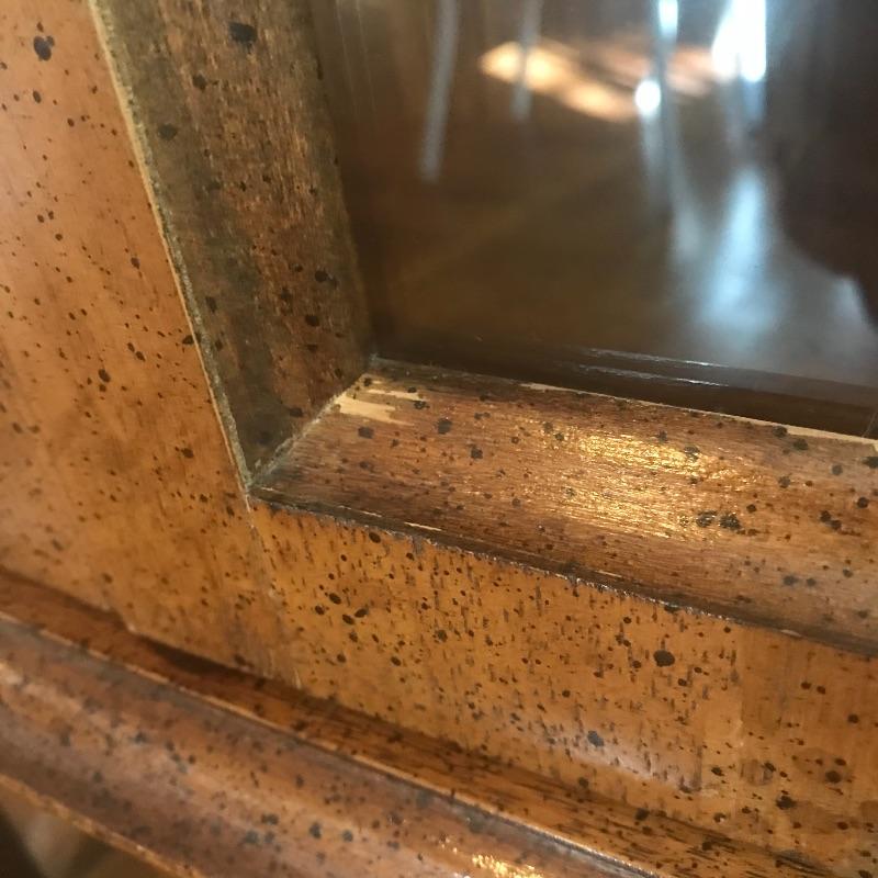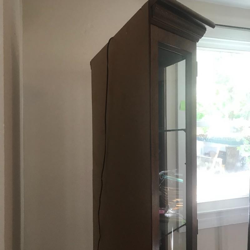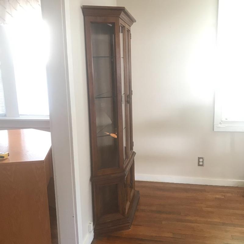 This is quite a statement. Beautiful wood grain with black splatter design and carved border just above the glass doors. Piece lights up on the top cabinet along with the bottom, they each have their own electrical cord. Lovely metal pulls with vintage design and metal hinges. The upper cabinet has three smooth glass shelves that do not adjust in height placement, nor do they have plate grooves. Very little wear is seen, mostly on the very bottom. Piece appears as solid wood with a particle board back, but we cannot verify. Curio measures approximately 35” x 12” x 71” and comes with three light bulbs, only two were tested and they worked fine. Please bring help to load as piece is substantial. Local pick up only.