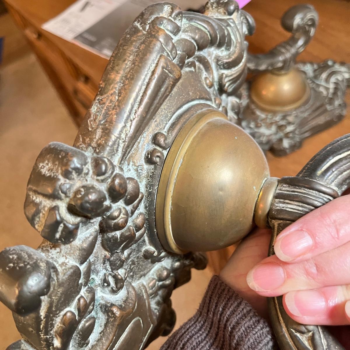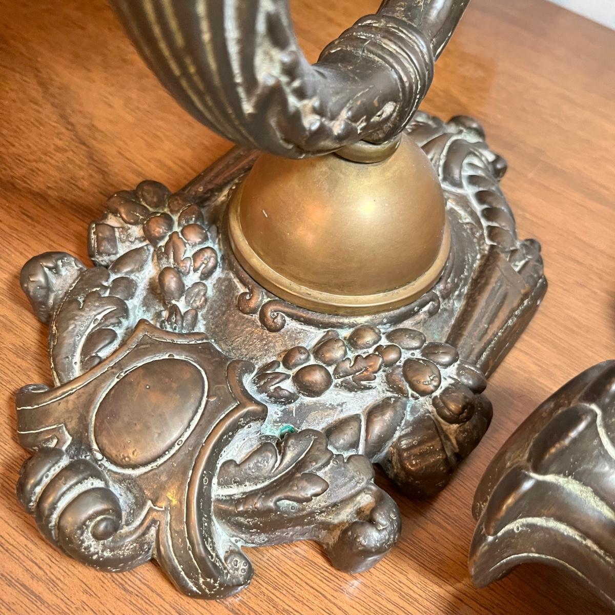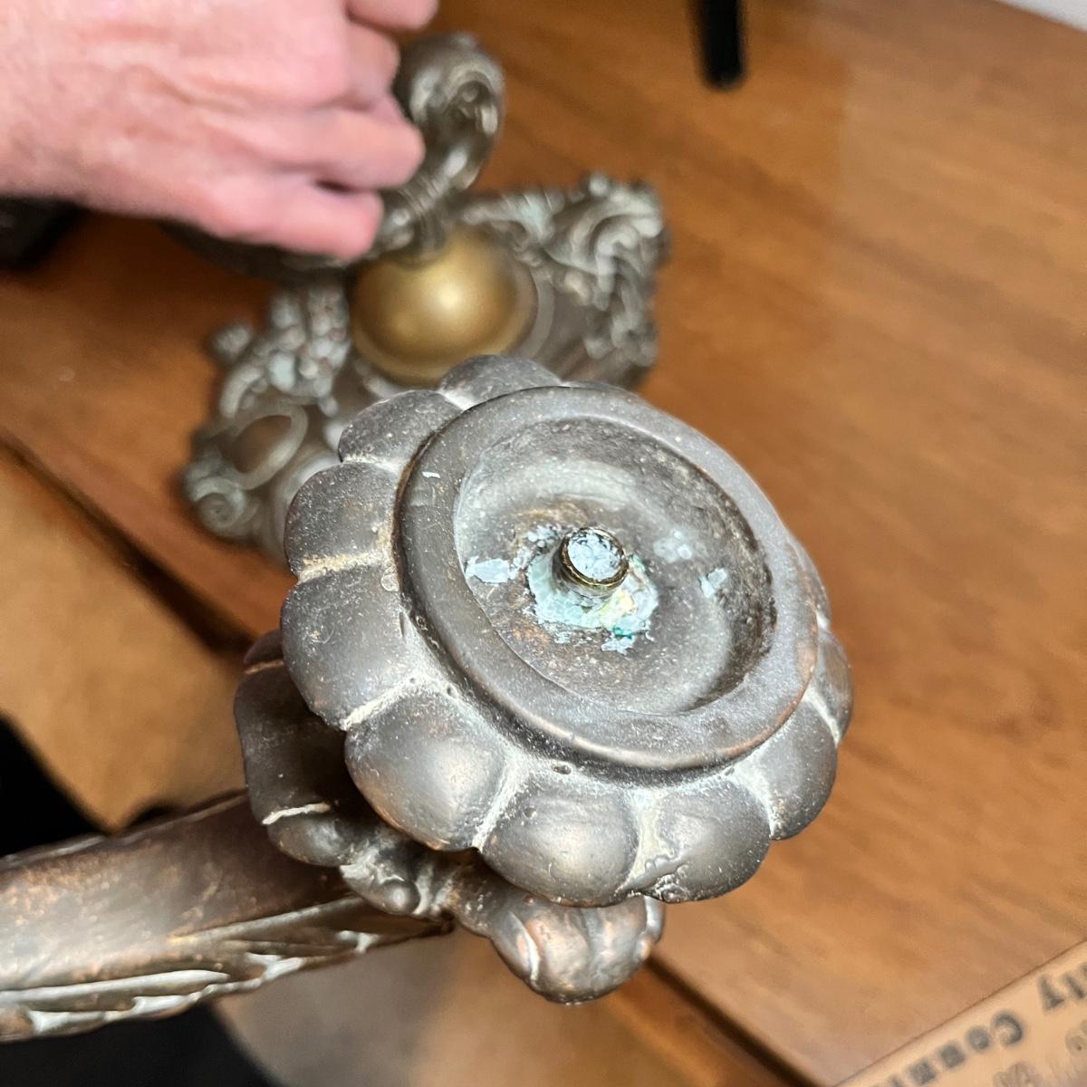 These are quite old, they look to be bronze. JR thinks that they are late 1800s by the style. They still have tubing to run electrical wiring. But these were probably originally gas lights! Very beautiful & quite heavy!